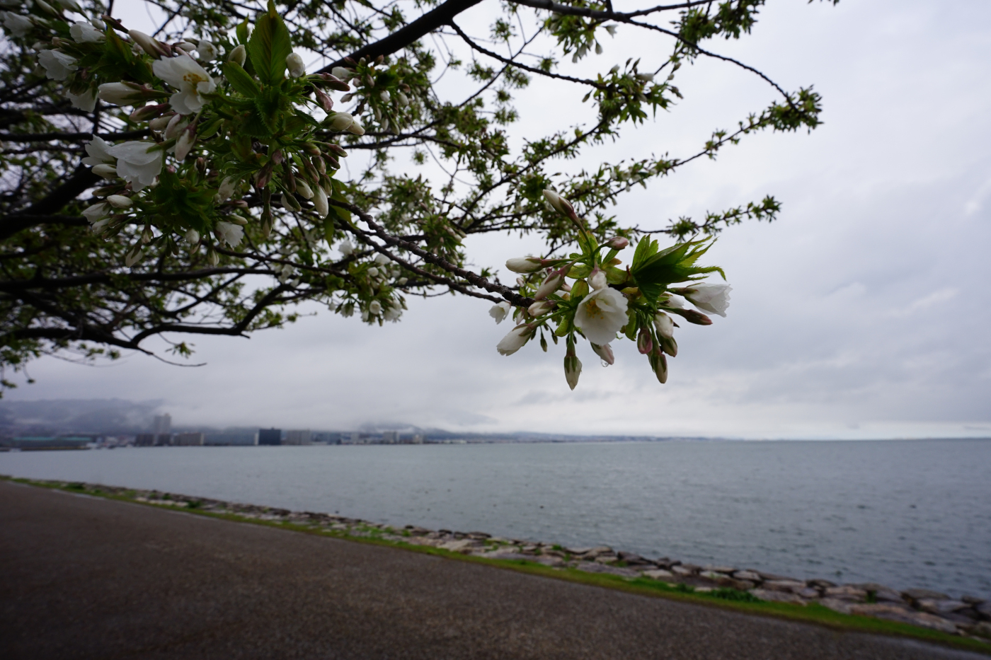 今日のお天気は雨が降ったり止んだりのお花見には生憎のお天気となった。其のお陰で静かな佇まいで三井寺や疎水そして湖岸では雨情琵琶湖が楽しめた。打出浜のオオシマザクラも咲き始めた。