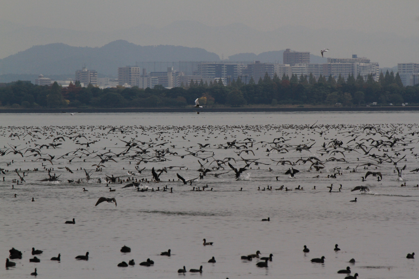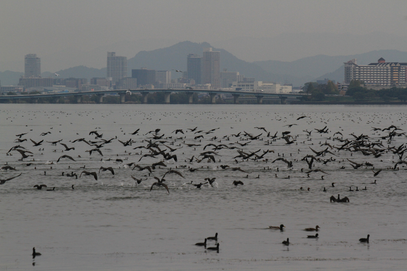 今日の天候は曇りで陽が差さず気分は下がり気味のまま湖岸へ向かった。浜大津港突堤付近を見るとアオコが少し発生していた。打出浜から琵琶湖を眺めると草津方向では水鳥の大群が乱舞?している、よく見ると大きく見える鳥はカワウの様だ、カモ類は湖面に浮かんでいる何故カワウだけが飛び回っているのかと望遠レンズを付けたデジイチで捉えて撮った。ファインダーを見ている時、昔(1963年)に見た映画アルフレッド・ヒッチコックの映画「鳥」を思い出した。今から62年も前に見た映画のシーンが鮮明に思い出させてくれるのは映画が余りにも鳥が人間を襲うシーンが衝撃的だったからからではと記憶を辿った。