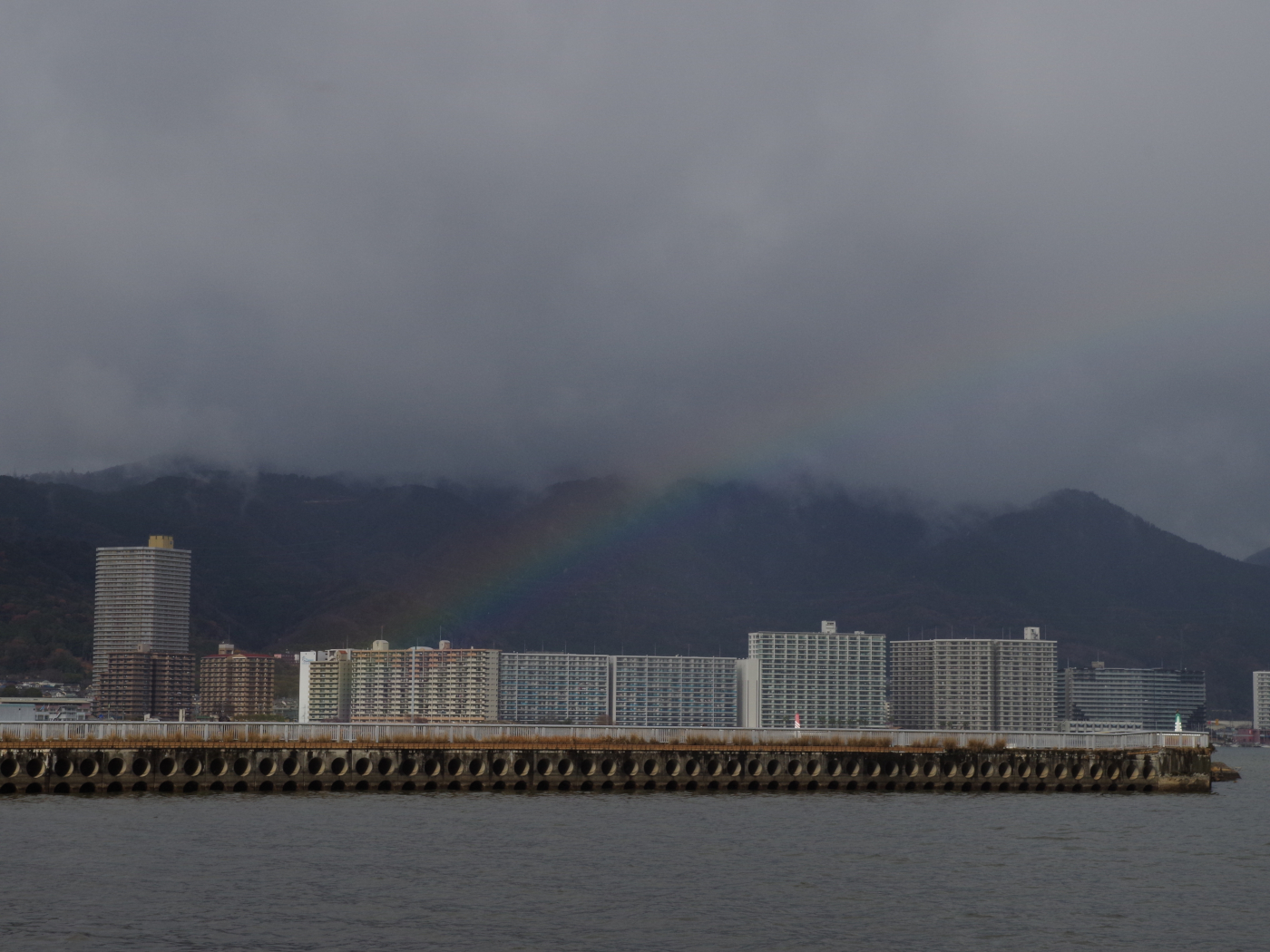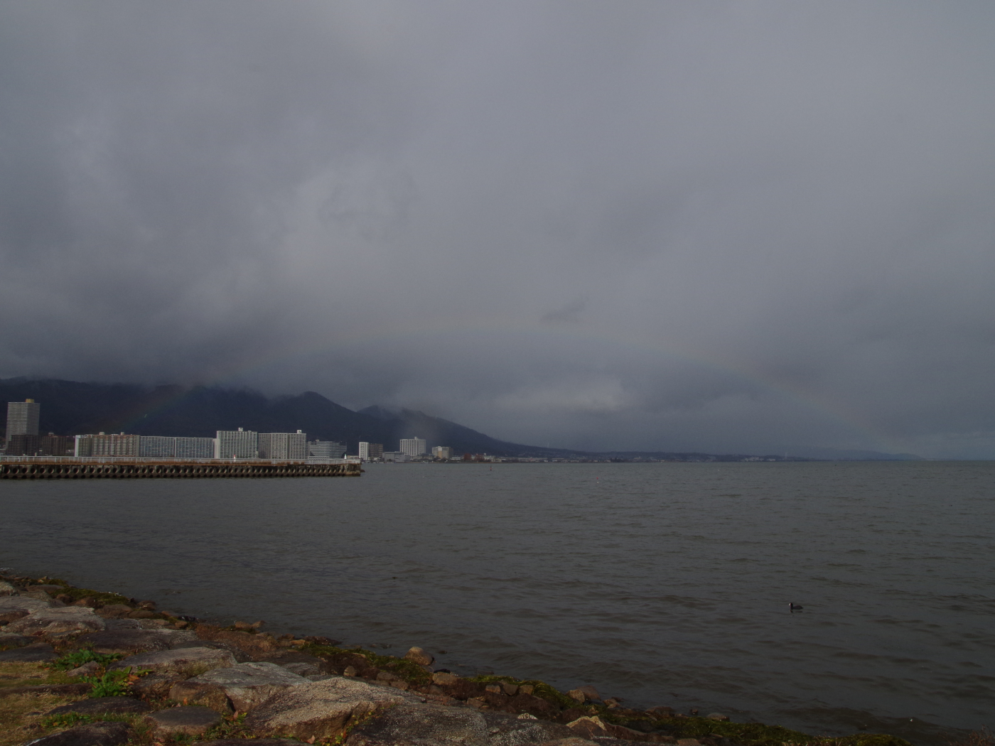 今日は朝から時雨模様で虹が期待できると湖岸ポタリングに出かけた。今年は虹を見る機会が少なく本格的な虹の架け橋はお目にかかった事がなく是非、年賀状には虹の写真を利用したいと虹を待っている次第だ。打出浜湖岸から湖上を眺めると比叡山方向は時雨れているように見え太陽光線が当たれば虹は確実に出るのだが、時々顔を出す太陽も心なしか光量不足では仕方ないと諦めた。におの浜のスーパーで買い物を済ませての帰路、湖岸から比叡山方向を見ると薄い虹が見え急いでデジカメを構えた。ファインダーに映る虹は薄く、とても年賀状には使えないと思いながらシャッターを切った。モニタースクリンで確認すると薄く虹が写っていた。