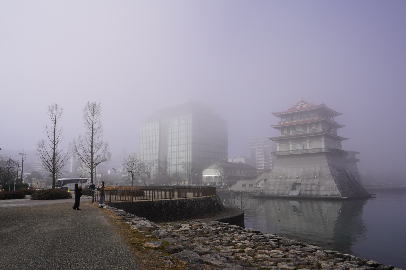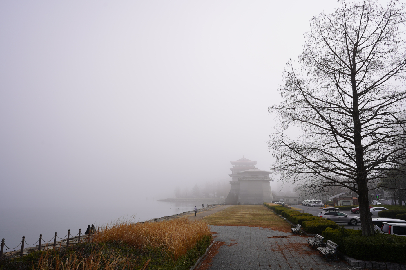 三井寺の展望台から琵琶湖を眺めても霧で視界不良で写真を撮るのを諦めた。そして昨夜の天気予報が黄砂の到来を告げていた事を思い出した。霧ではなく黄砂なのかと眺め直した。でも霧と黄砂が同時に発生したのではと思った。湖岸ポタリングではロマンチックな霧の風景にも見えるが黄砂と考えると見え方も変わってくるから不思議だ。僕はアレルギー体質なのでなるべく長居は避けたいと写真を撮って退散した。