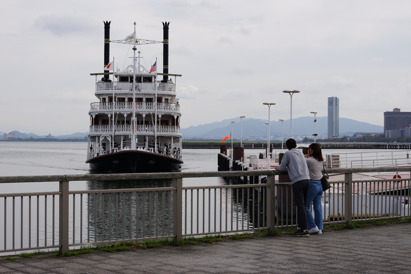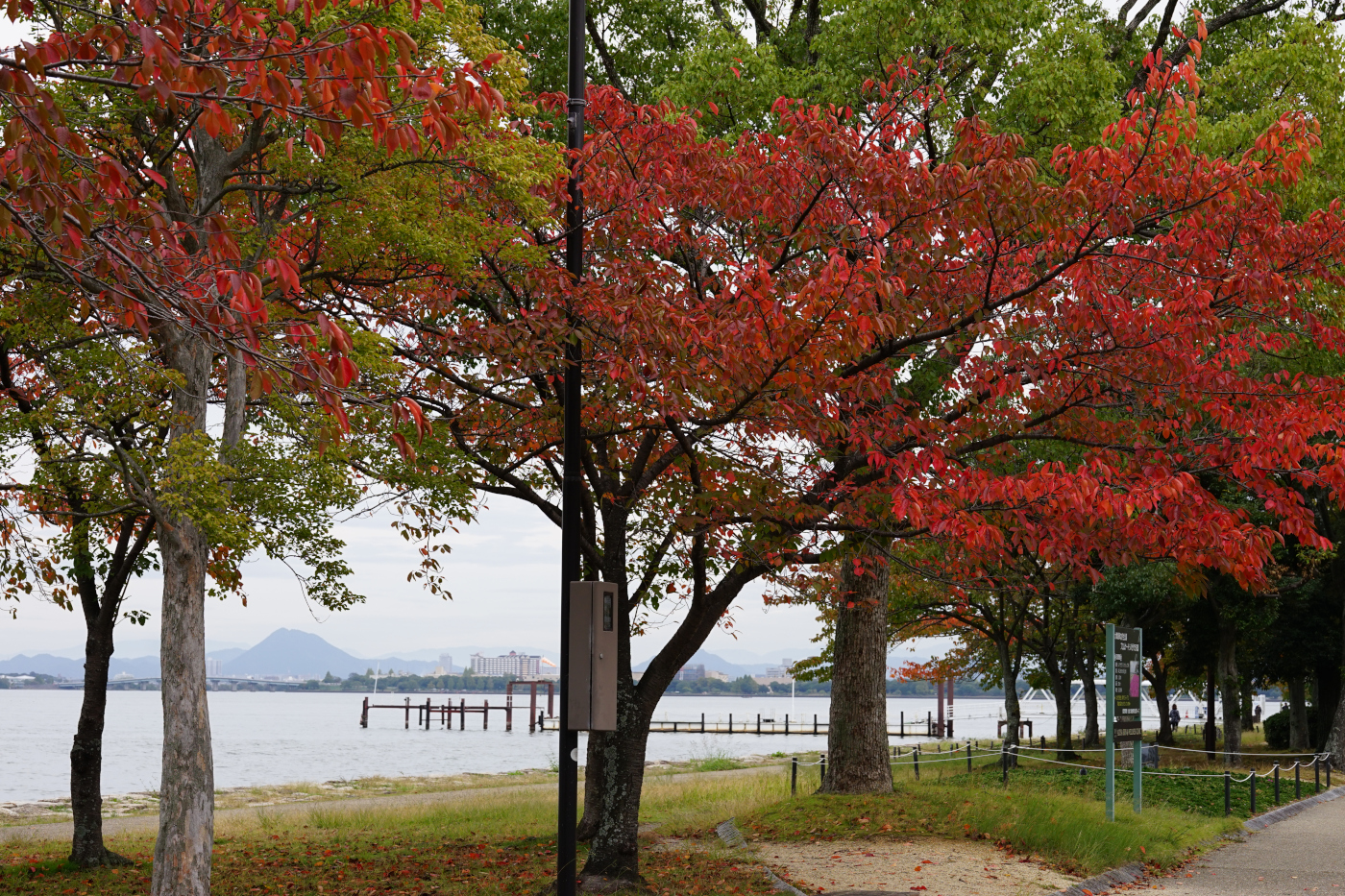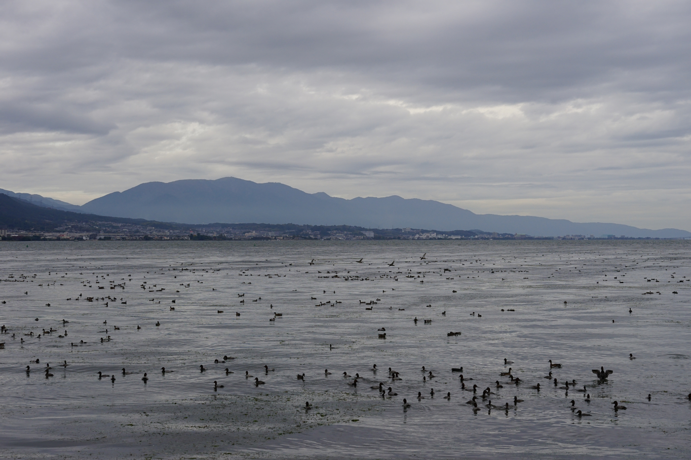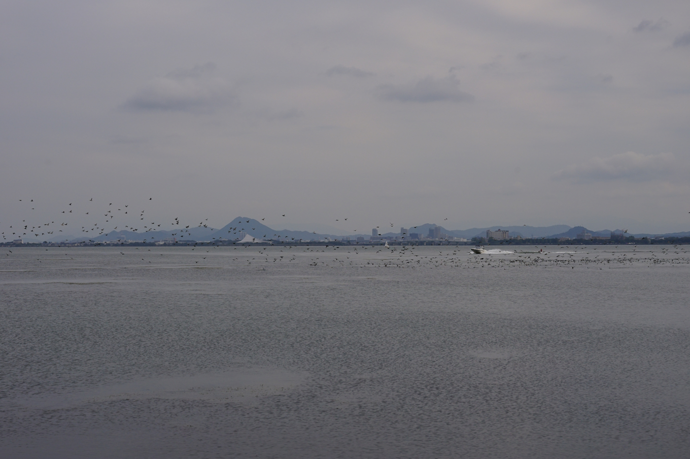 打出浜湖岸か琵琶湖を眺めているとモーターボートに驚き飛び立つ水鳥の数は去年よりも少なく思った。