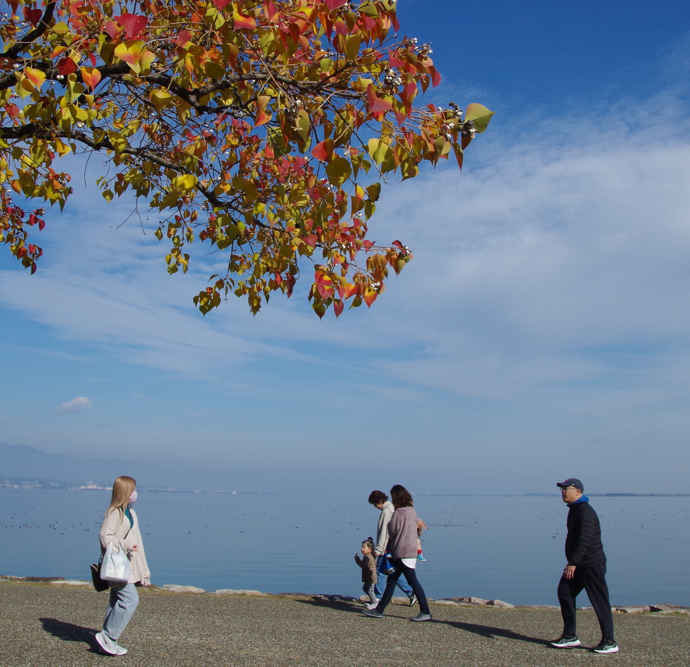 三井寺の紅葉シーズンも最終章へと猛暑で心配された紅葉も美しく秋を演出して訪れた人達を楽しませてくれた。におの浜の楓の紅葉が水路に映って秋の終わりを告げていた。夕方、浜大津の湖岸で暮れなずむ琵琶湖を眺めていると、この雄大な景色が一番と思った。