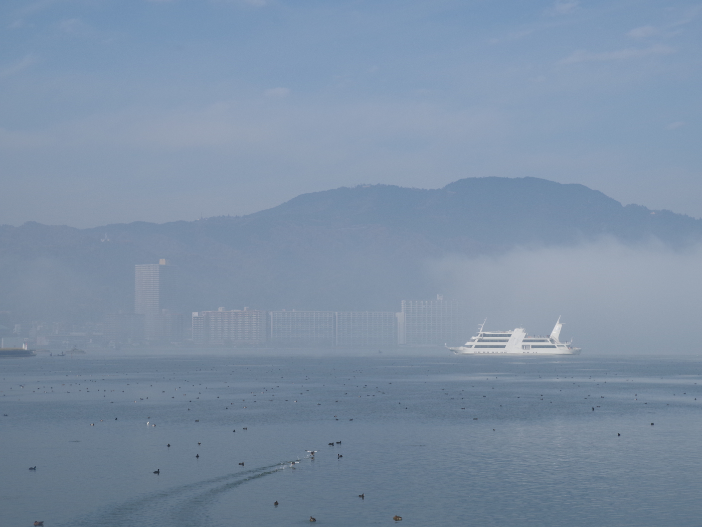 霧の摩周湖は有名な歌だが・・霧の琵琶湖は聞いたことがないのは歌謡曲にはなっていないからだ。今日の散歩では三井寺の展望台から眺める景色は霧の琵琶湖だ。何も見えない濃い霧ではなく湖上に漂う雲?の様にも見えた。散歩を終えてから湖岸ポタリングで浜大津湖岸へ向かった。濃い霧ではなく明るい霧で百メートル以上の視界はあり柔らかい霧?薄い雲が流れている様にも見えた。打出浜から湖上を見ると観光船ビアンカ号が霧の中で見えた。霧と言えば僕はアンゲロプロスの映画、シテール島への船出を思い出してきた。ビアンカ号は明るい霧の中を浜大津港へ向かっていた。帰宅後、パソコンで調べると海上で発生する霧は移流霧と蒸気霧が・・・でも琵琶湖で今日発生していたのは蒸気霧ではと思った温かい湖水の上に冷たい空気が流れたのではと思った。霧の琵琶湖の優しい光景を見られ写真まで撮れ充実した日になった。