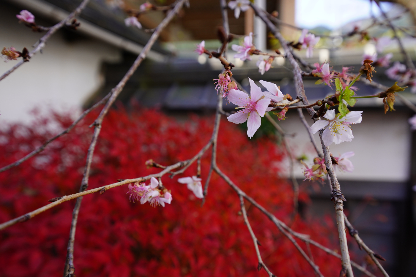 冬なのに桜の花が咲いているのは近くの尼寺遊心庵の門前のジュウガツザクラだ、そして紅葉が一段と美しいニシキギが桜花を際出させ見事なコラボレーションをしていた。ジュウガツザクラは9月のお彼岸から12月に入っても花を咲かせ続けているパワーは何処からと細い幹を見た。