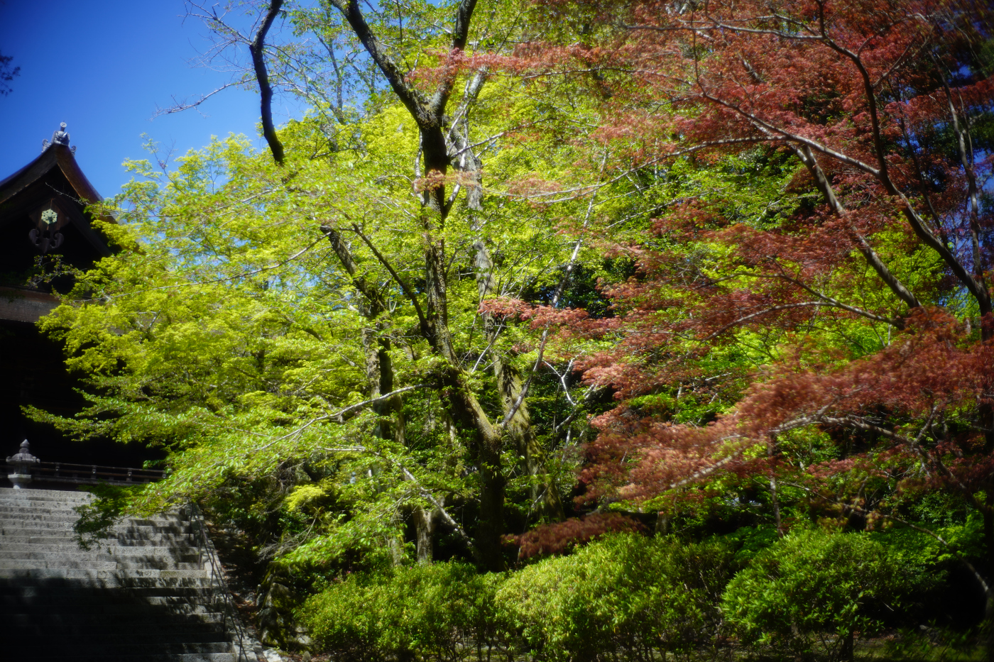 ご近所の桜の名所の桜は散ってしまった。三井寺が一番賑わう春のシーズンが終わった。新緑が命の輝きを感じる鮮やかな色彩で春を演出しているが花のシーズンが終わった訳ではない、境内の片隅の八重桜が艶やかな色で存在感を表すと護法善神堂では昔ながらの八重桜が花を咲かせ行く春を見送っていた。柳が崎の浜辺では春の波音が心地よく春を堪能させてくれた。