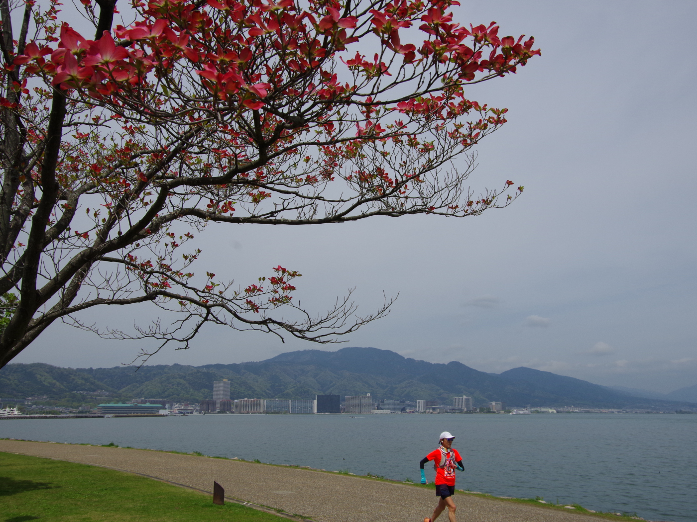 浜大津港から膳所公園へと続く湖岸の遊歩道は琵琶湖総合開発や湖岸の埋め立てで完成したものだ。におの浜の人工湖岸には芝桜を育て管理するグループがあり手入れが行き届いていて毎年桜の花が散った後は鮮やかなピンク色の芝桜が湖岸を彩り遊歩道を散策する人を楽しませてくれる名所となった。