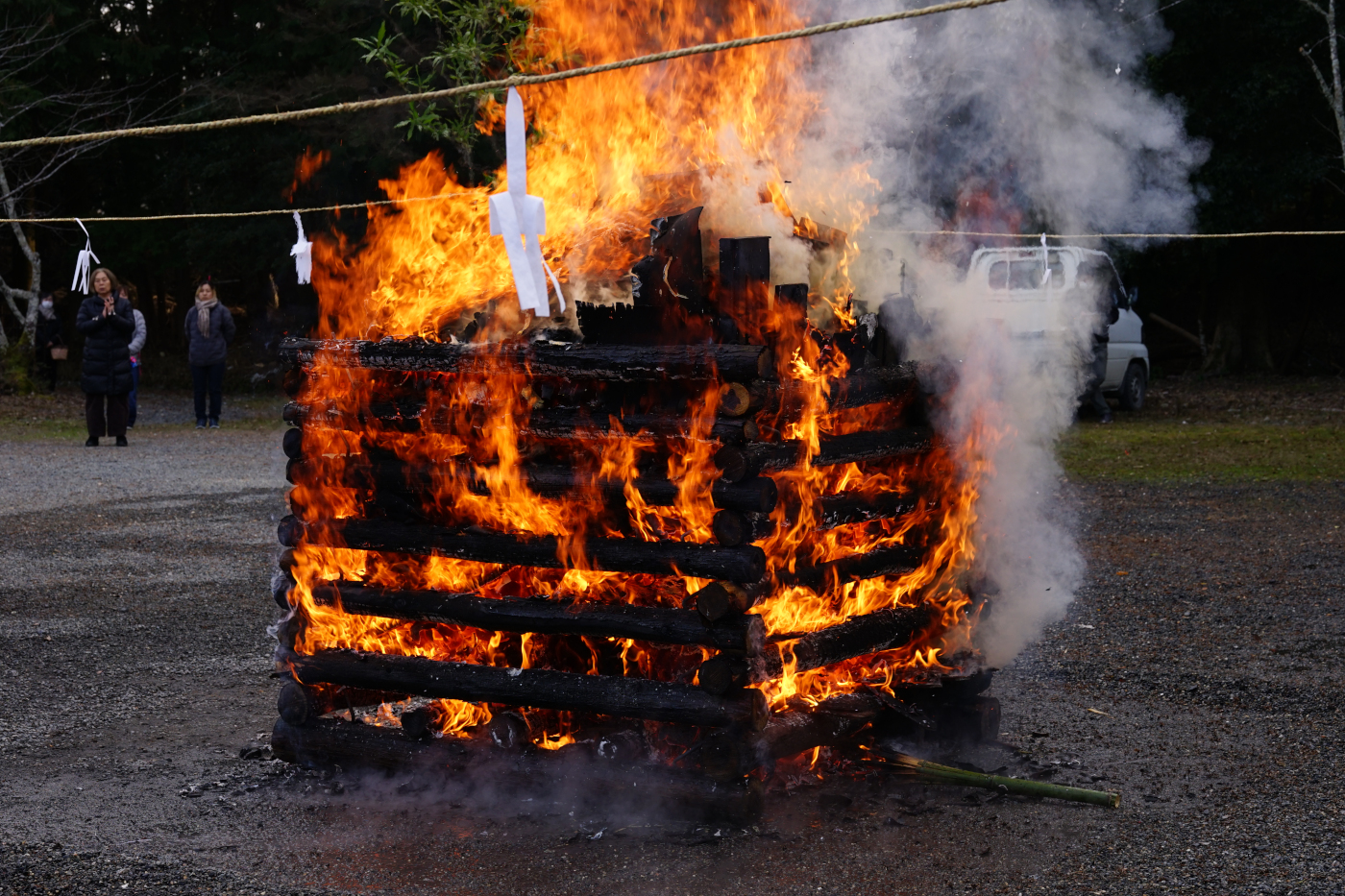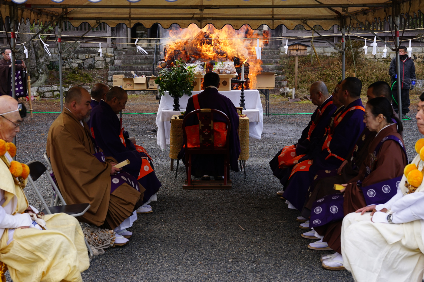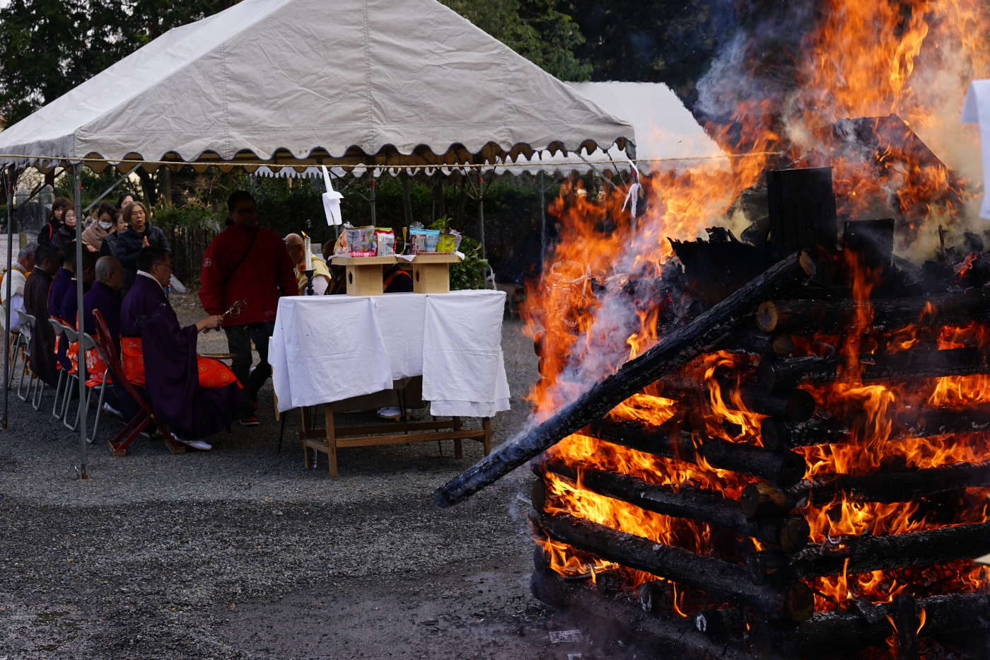 今日1月15日は昔は成人式?そして神社ではどんと焼きで正月の注連縄や古い御札を焼く行事で近くの氏神様でも朝からどんと焼きで煙が上がっていた。三井寺での御札焼きの行事は以前は7月に観音堂の上の展望台広場で行われていたが地球温暖化の影響で真夏の行事が変更されて数年前からお正月行事となり毎年1月15日には三井寺の護法善神堂(千団子さん)の前広場で御札焼きの行われるようになった。午後2時に三井寺の僧侶らの読経が始まると積まれた古い御札や注連縄に火が付けられ大きな炎となると参加者が順次焼香して一年の安全を祈った。