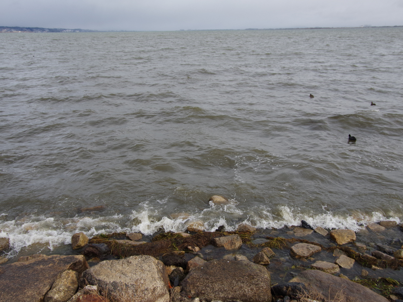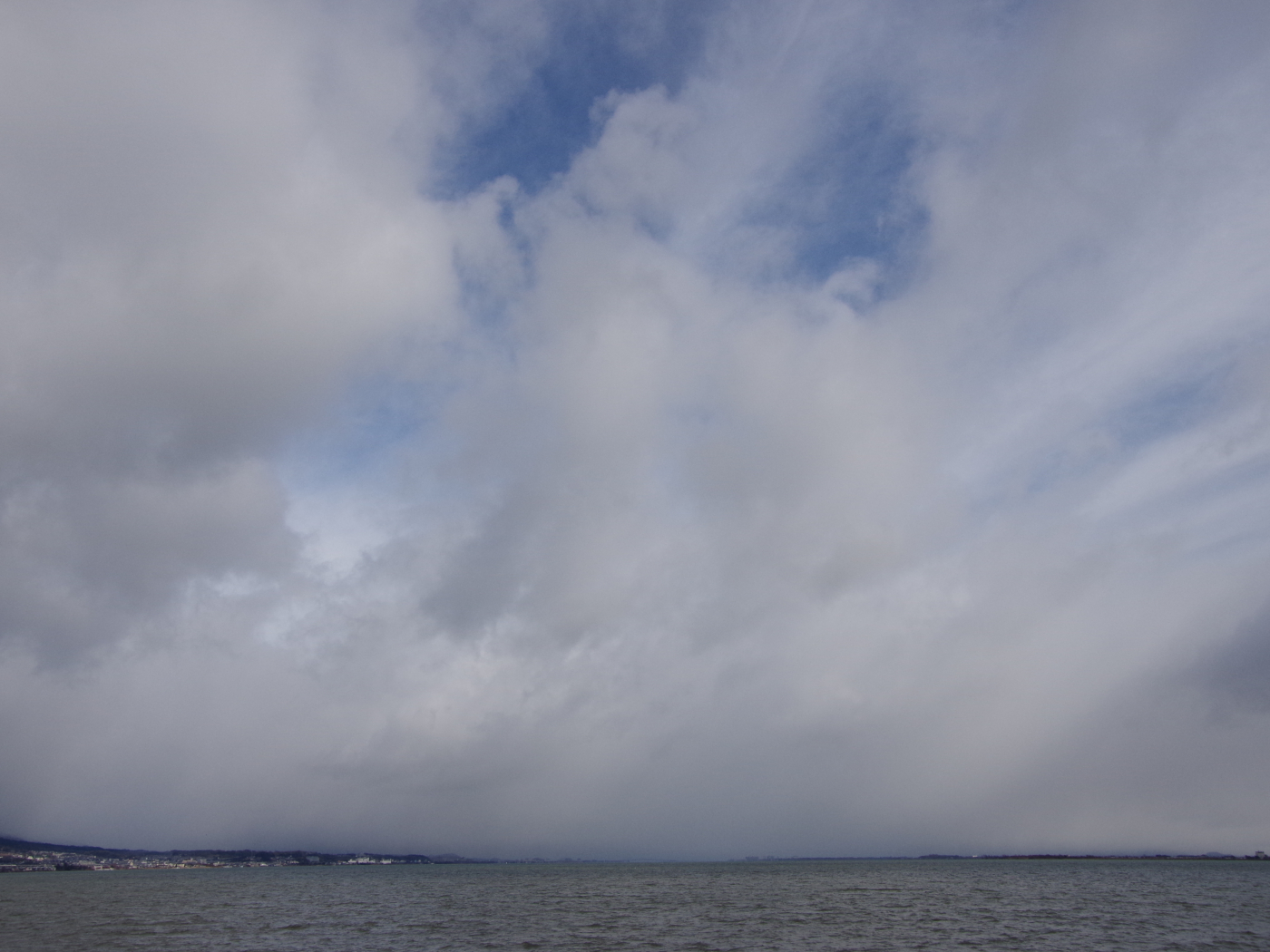 湖岸ポタリングには何時もデジカメを自転車の前カゴに入れて出かける、僕は琵琶湖と空が撮れる広角ズームを常時付けているが時折、望遠ズームレンズ付きのデジカメを持ち出すときも・・今日は鳥が撮れるのではと予感が・・でも空の好きな僕は何時も通りワイドズーム付きのデジカメで湖岸へ向かった。打出浜湖岸から琵琶湖と空を眺めると何種類かの雲の作品が楽しめた。琵琶湖文化館の近くではPカメラマンMさんがパンダ鴨が居るよと声を掛けてくれた。僕は残念ながらワイドレンズでは無理とその場を離れた。帰路、同じ場所でMさんはミコアイサを撮っているが良い位置に来ないとカメラを構えていた。暫くすると湖岸近くで湖面から頭を出している石の上にミコアイサが上がった。僕は岩に?上がったミコアイサを見るのは2回目だ。前回もワイドレンズでチャンスを逃し今回もまたかと・・気を取り直して近づいて28ミリのワイドレンズで三メートルの距離から撮った。画像確認すると小さく写っていた。帰宅後、ミコアイサの写った写真を限界までトリミングした結果、それなりの写真になったがトリミングをしないのが僕の写真・・これはアウトだと・・・