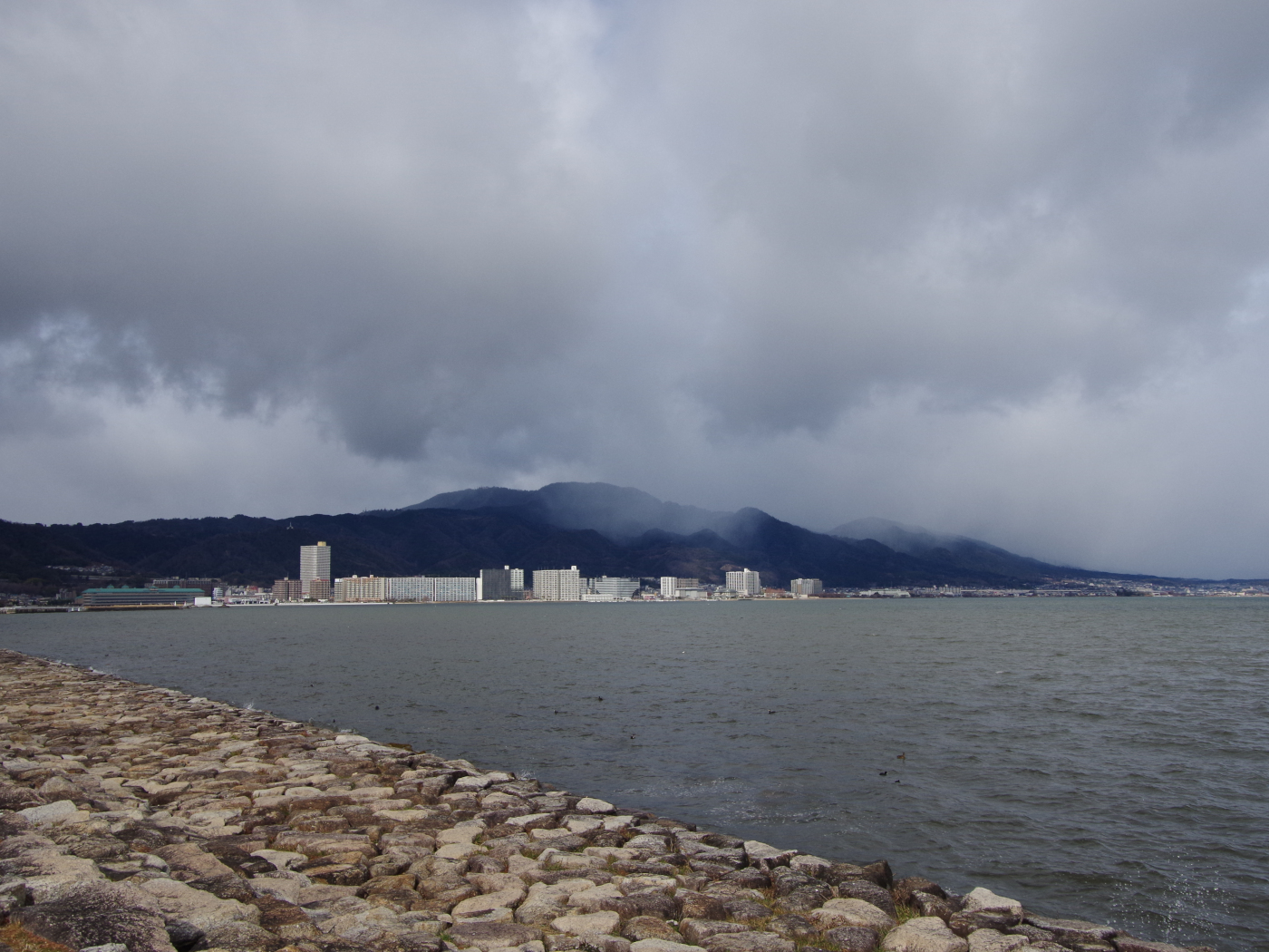 三井寺の展望台から琵琶湖を眺めても霧で視界不良で写真を撮るのを諦めた。そして昨夜の天気予報が黄砂の到来を告げていた事を思い出した。霧ではなく黄砂なのかと眺め直した。でも霧と黄砂が同時に発生したのではと思った。湖岸ポタリングではロマンチックな霧の風景にも見えるが黄砂と考えると見え方も変わってくるから不思議だ。僕はアレルギー体質なのでなるべく長居は避けたいと写真を撮って退散した。