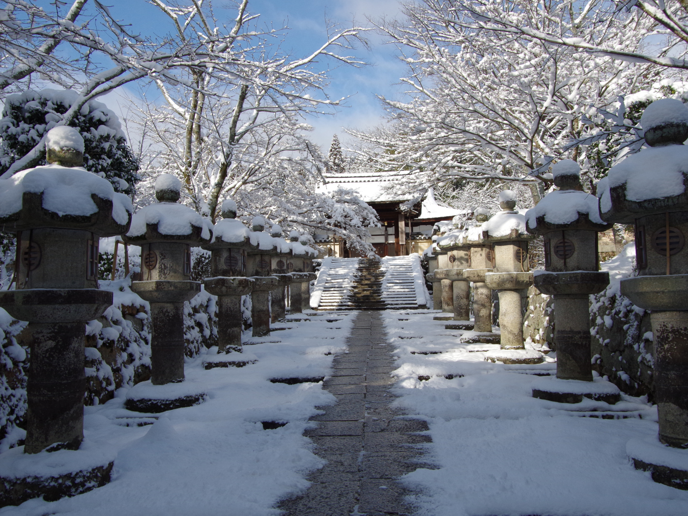雪が降り積もった朝は何故か早起きをするのは雪が好きだから、でも雪が好きだったのは山スキーを楽しんでいる頃だ。山スキーが出来なくなったのは今から9年前に大津には珍しく20センチの積雪があり家の前からクロカンスキーを履いて三井寺の森へ向かった。そして観音堂の展望台から続く林道をスキーで登った。よせば良いのにクロカンスキーで狭い山道を滑って降りる時に岩にスキーを引っ掛けて転倒して大腿骨を骨折して自力で観音堂まで降りてくるのに三時間ちかく費やした。それから病院へ搬送された苦い経験を思い出した。でも今日は安全だスキーではなく、軽登山靴を履いて表へ出ると辺りは一面真っ白な雪の世界が広がっていた。久しぶりの雪の感触を味わいながら三井寺の境内を歩いた。今日は雪景色の撮影もできて楽しい一日となった。