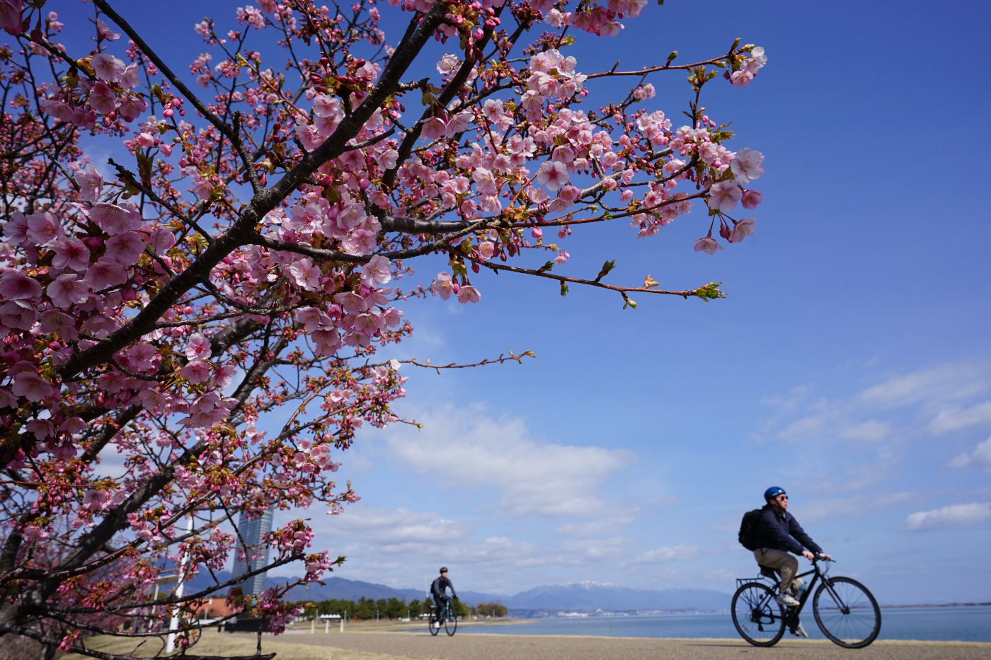 好天に誘われて湖岸ポタリングで膳所由美浜のカワヅザクラを見に出かけた。金曜日に自転車で転倒して左足の状態が悪いが足に負担がかからない自転車ならペダルを漕いでも大丈夫と湖岸遊歩道を快適に走った。桜は五分咲きだが濃いめのピンク色が青空に映えていた。あと一週間ほどで満開のお花見が出来るのではと思った。