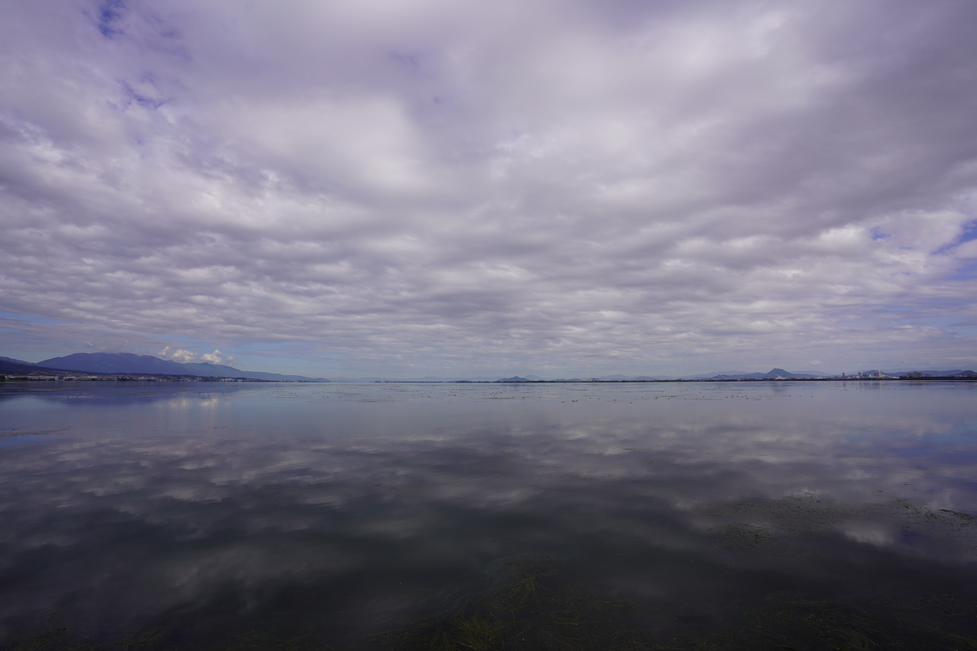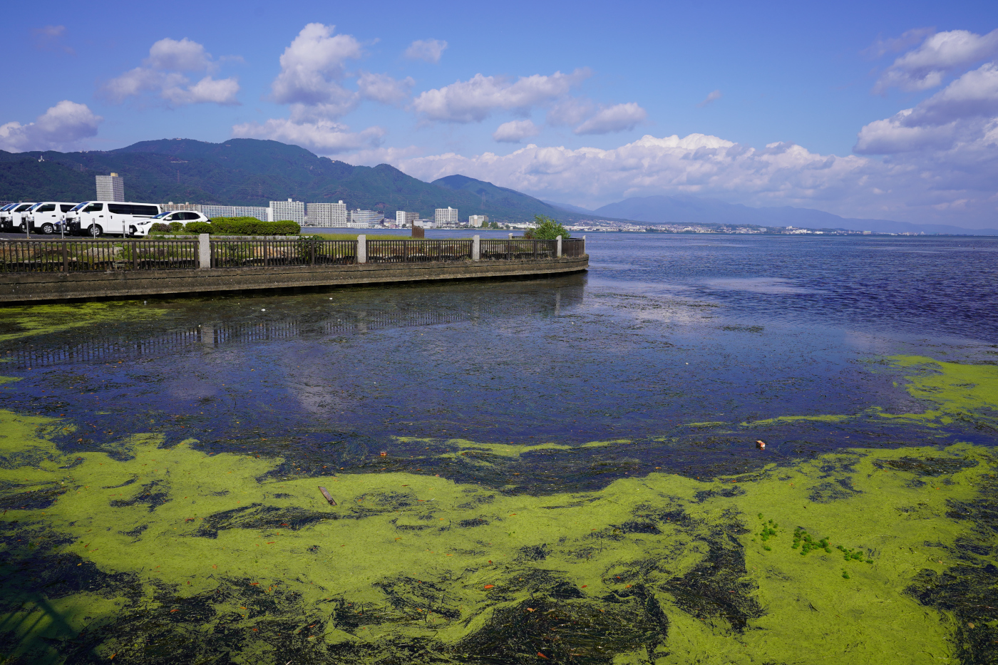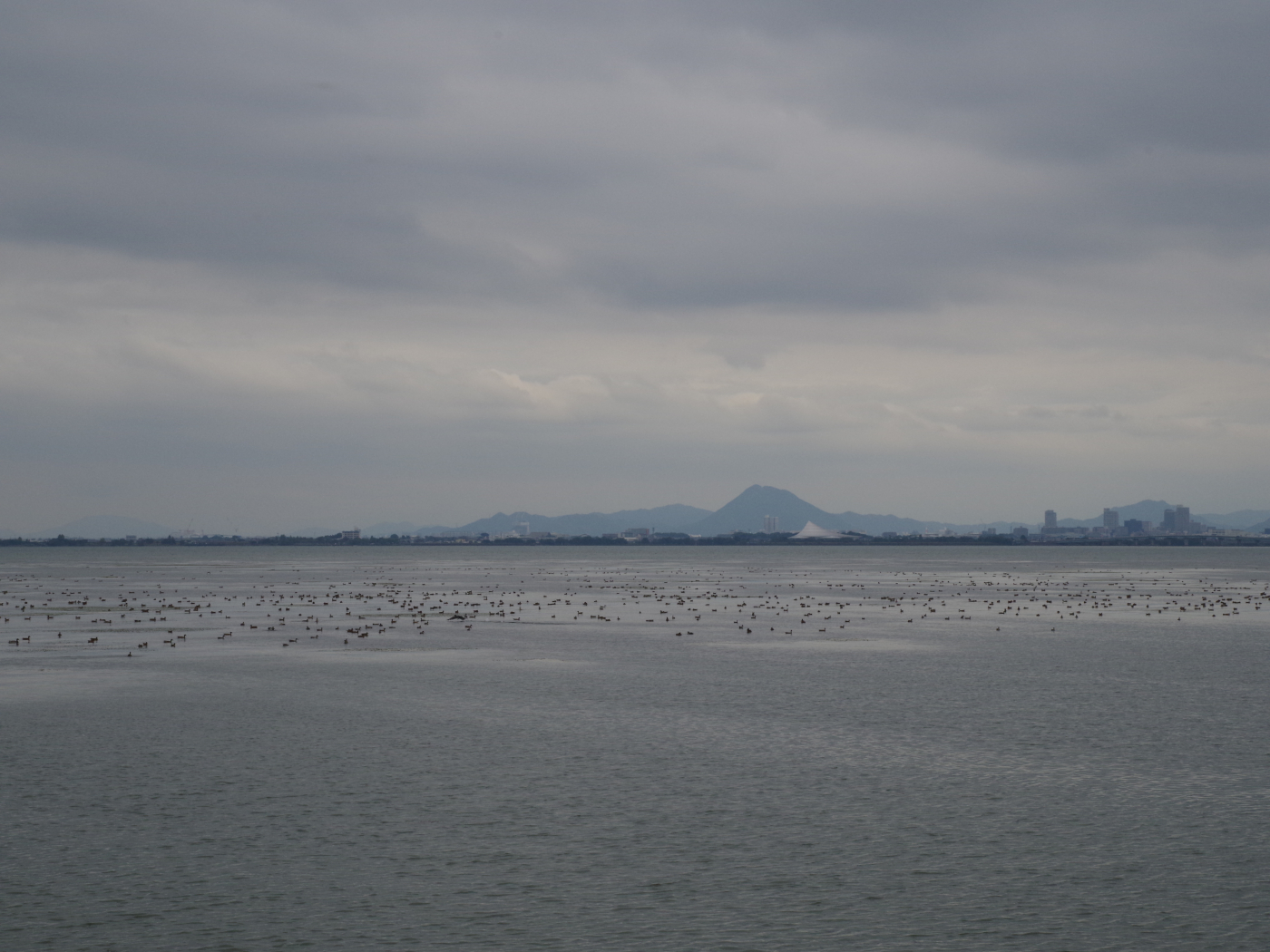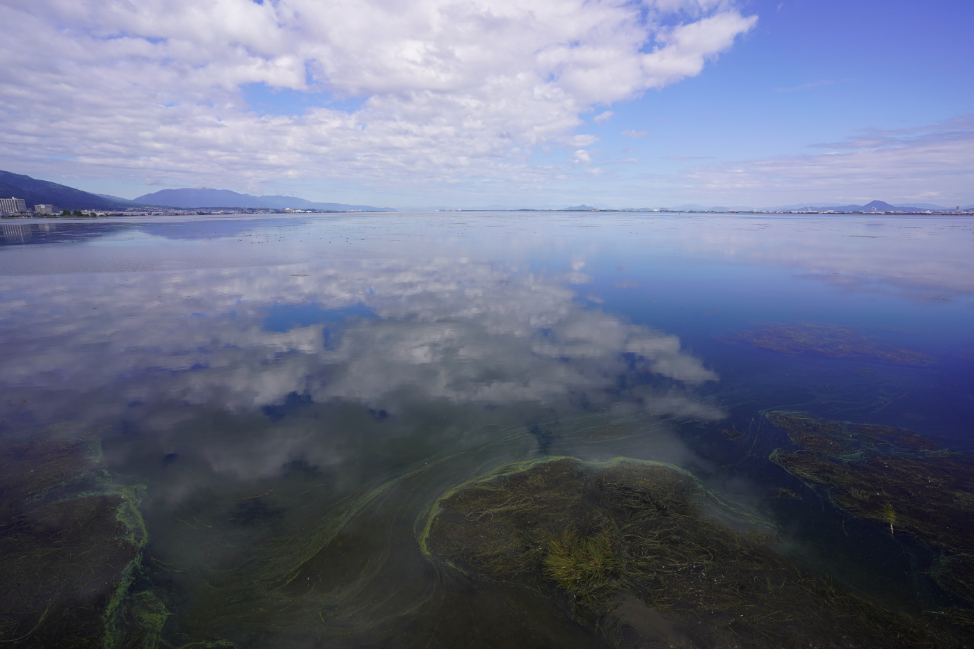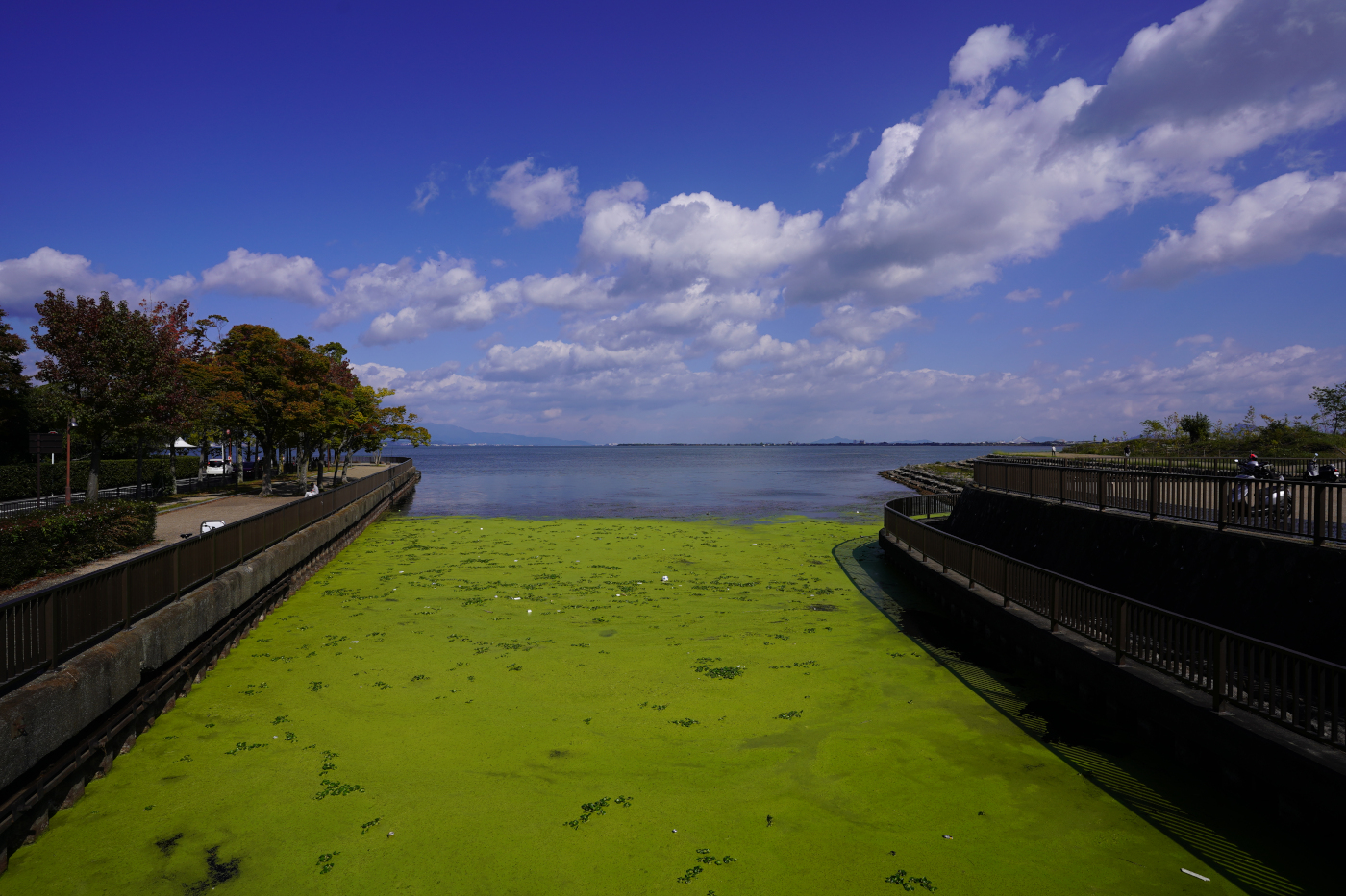 今日の琵琶湖は上空には雲があるお陰で青空の時よりも雄大な風景が見られた。湖岸に佇んで美しい琵琶湖を眺めて、一度足下の湖面を見るとアオコが琵琶湖からのメッセージを描いていた。気温も下がり冬並みの寒さを感じた、もうアオコのシーズンは過ぎたと思ったのに・・僕のFBに研究者が最近採取した湖水からミクロキスティス(プランクトン)が多数見られたと伝えてくれた。ミクロキスティスはアオコの原因になるプランクトンの一種だ。でもアオコが発生していても秋の琵琶湖の眺めは殊の外、美しく見えた。
