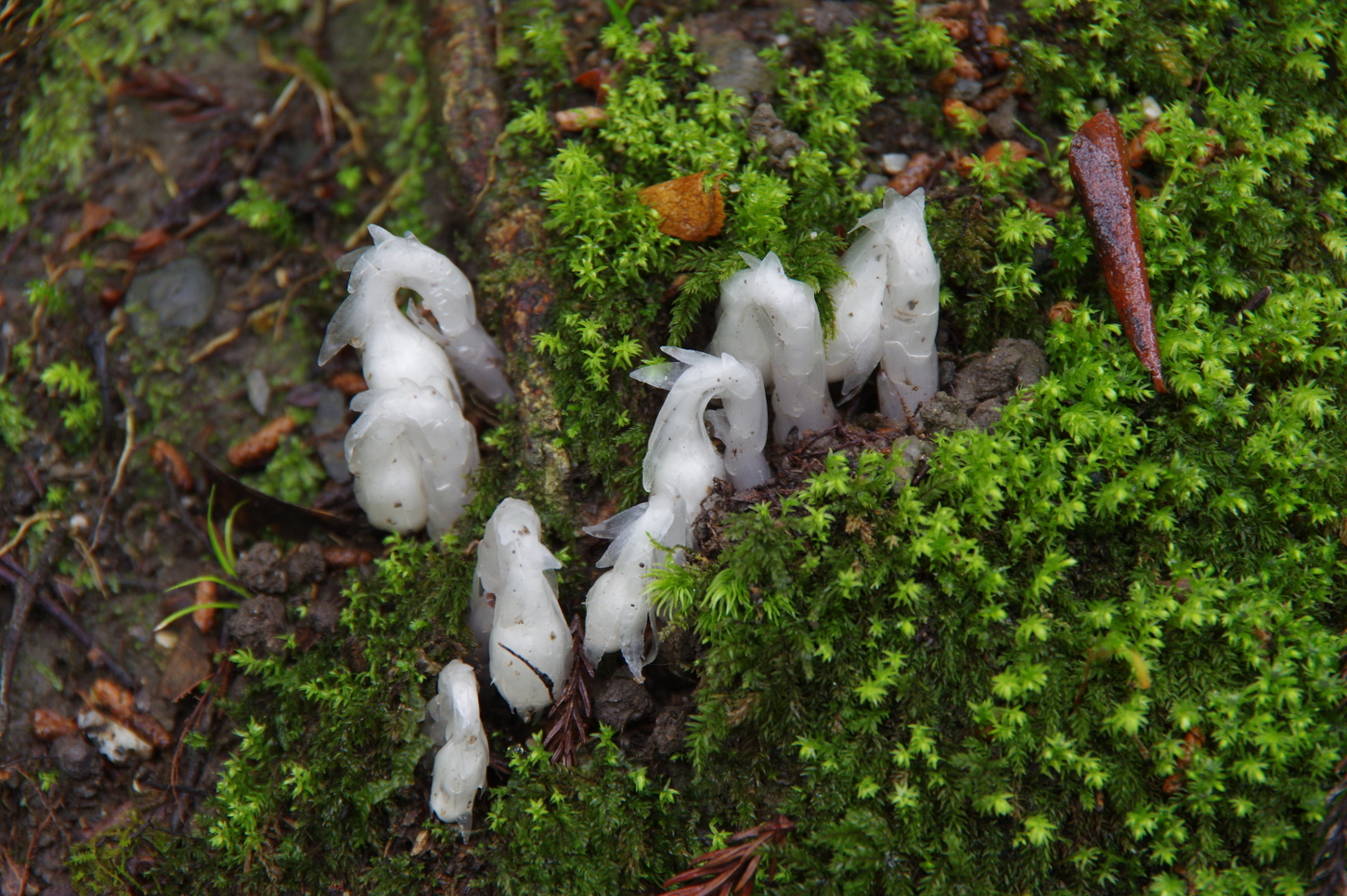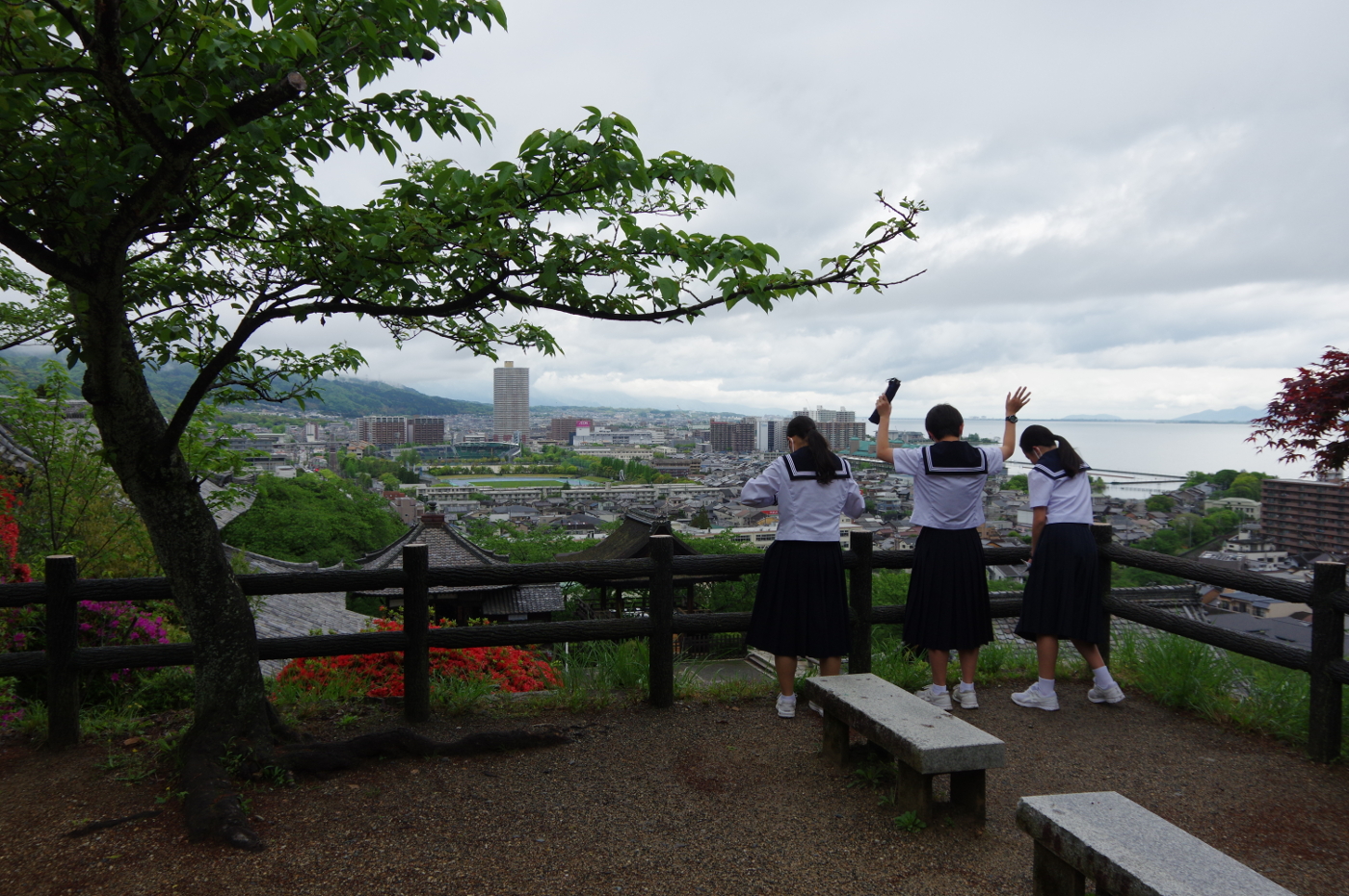夜来の雨も上がり爽やかな、お天気になっているのではと何時もの散歩に出かけた。空を見上げると全天雲に覆われていた。新緑が勢いを増し三井寺の観音堂へ向かう石段は完全に緑のトンネルとなった。樹間から聞こえる鶯の声に励まされ休むこと無く観音堂へ着いた。其処から一段上の展望台に向かう石段を登り始めると後ろから来た修学旅行の女学生に追い越された。何時もなら気配を感じると抜かされまいとペースを上げるのだが、やはり82歳のエンジンでは無理と判断できる自分は爺だと自覚した。展望台では若い声が木霊していた。そして修学旅行が三井寺へ訪れる様になったのは三年ぶりではと思いながら高校生をスナップした。帰路、ギンリュウソウは咲いていないかと何時もの場所へ寄ると成長中の花が見られた。もう少しで立派なギンリュウソウになると思い写真に撮った。湖岸は稚鮎が連れ出し近くの釣り人が糸を垂れていた。最近では外来魚少なくなった所為でバス釣りの人が少なくなったようだ。