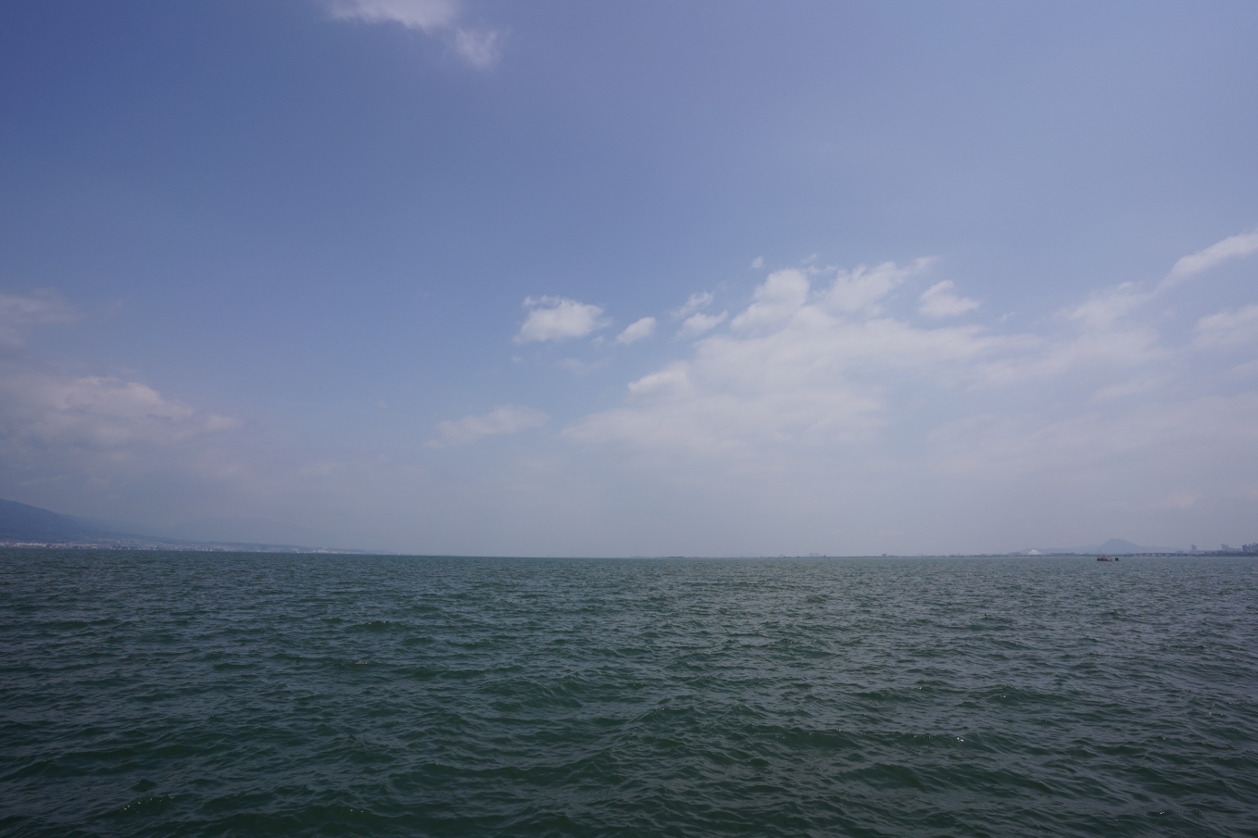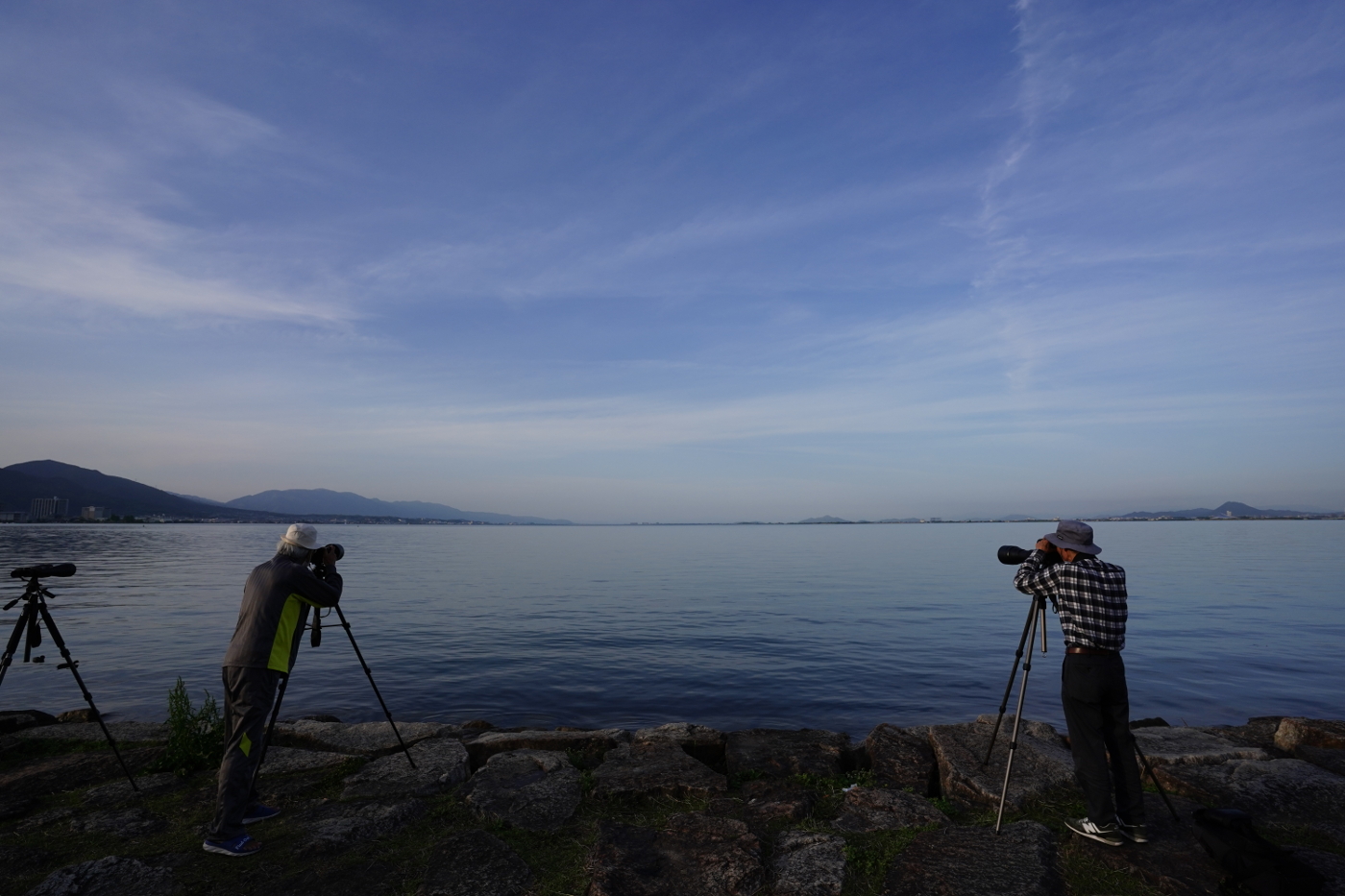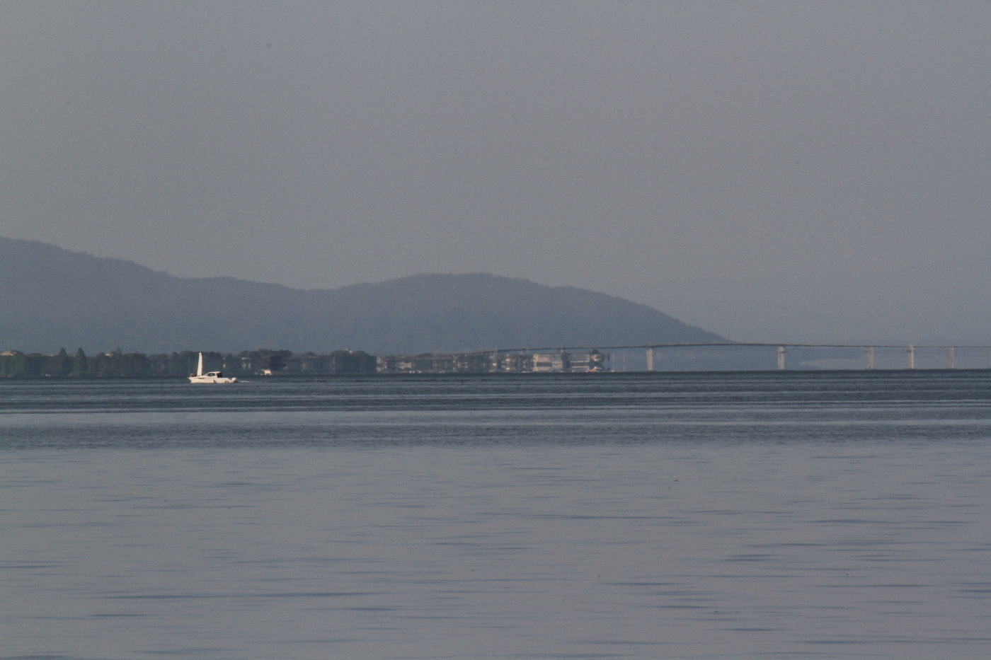 昨日の雨が空気中の埃を流してくれた所為で湖岸から見る琵琶湖は視程もよく琵琶湖大橋もよく見えた。こんな日に蜃気楼が見られれば良いのにと湖岸ポタリングに出かけた。打出浜で自転車を止めてデジカメのファインダーを覗くと琵琶湖大橋の守山側に蜃気楼の気配があり何枚かシャッターを押して、モニターで確認するとイマイチだった。写真を諦めて近くのベンチで休憩していると、遠くに三脚やカメラ機材を積んだバイクを見かけ近づくと、琵琶湖蜃気楼研究会のIさんだった。手慣れた作業で撮影準備をされる姿を見て流石とおもった。カメラや双眼鏡を三脚にセットされ撮影を始められたので僕もカバンから望遠ズーム付きデジカメをだしてファインダーを覗くと少し蜃気楼がでていた。暫く撮影していたが余り変化が無く少し飽きたので一時帰宅した。夕方、湖畔通信用の夕景写真を撮りに湖岸へ向かった。打出浜に着くと、Iさんは炎天の下で蜃気楼の観察を続けている姿を見て本物の愛好家はちがうなと感心しながら近づいた。Iさんは開口一番、つい今しがた迫力あるZ型蜃気楼がでていましたと言われた、もう少し早く家を出れば見られたのにと少し悔やんだ。でも暫くすると素晴らしい蜃気楼が表れた。視程も良く蜃気楼がハッキリ見え写真に撮るにも絶好のチャンスとなり楽しく撮影できた。帰宅後、パソコンで見ると今まで撮った蜃気楼写真の中で一番とよく撮れていた。良いチャンスに巡り会えたことと琵琶湖蜃気楼研究会の人達との出会いのお陰と感謝しながらパソコンから離れた。