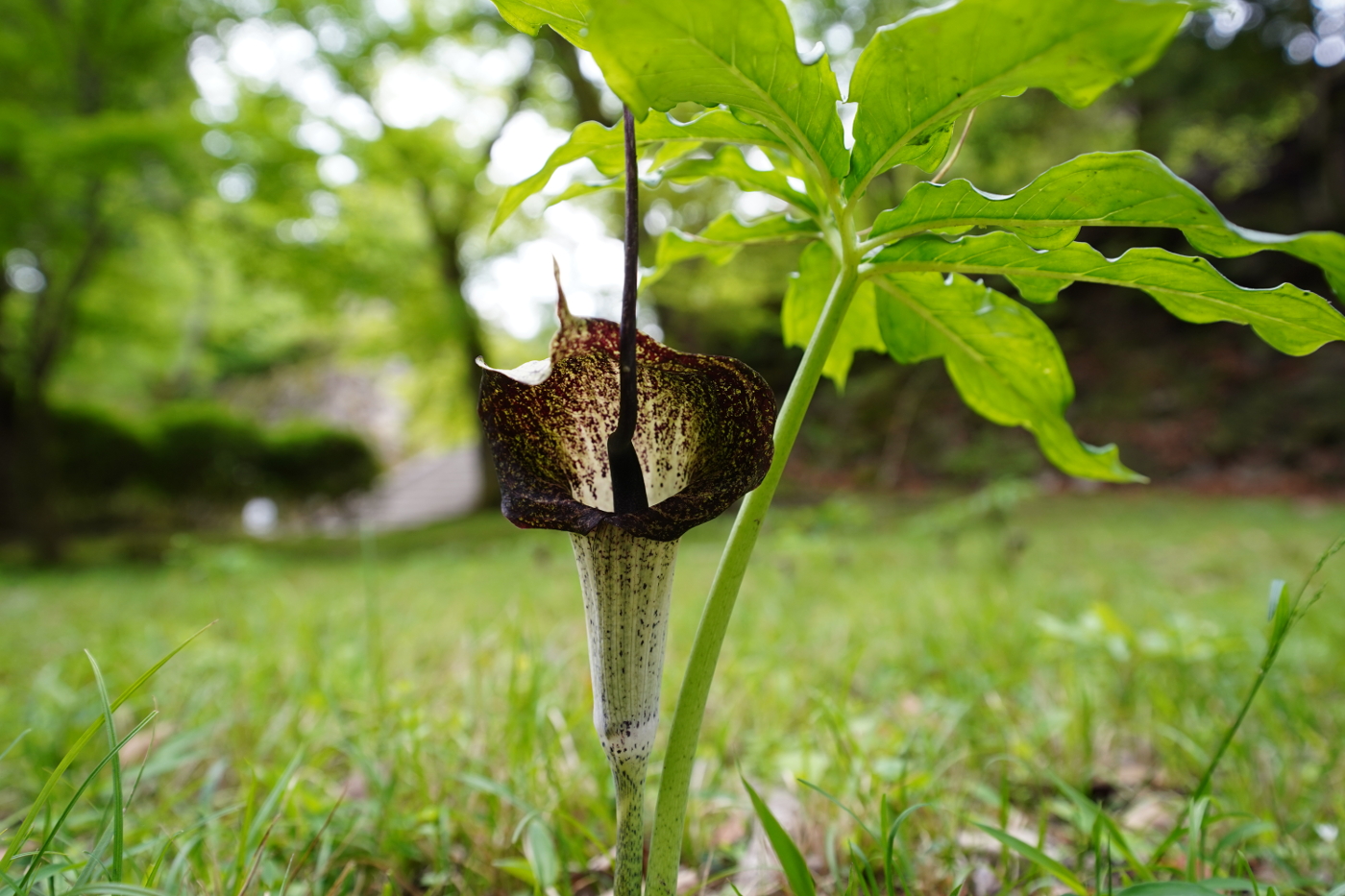 散歩や湖岸ポタリングで何気なく見ている風景も意外と細部までは見ていないと思った。今日も三井寺の境内を散歩しながら何か花は咲いていないかと彼方此方を見るも簡単には見つからないから、昨日、見つけたウラシマソウは大丈夫かと心配しながら花の場所に向かった。ウラシマソウは花から釣り竿を延ばしながら元気な姿で其処に在った。そして林の中を見ると何とウラシマソウが群生しているではないか、毎年、近く通っていても気づかなかったのは見ているようで見ていないのか、急に群生地になったのかと、花の咲いている林に足を踏み入れた。花を撮ろうと足を踏み出すと足元でシマヘビが慌てて逃げ出した。久しぶりに見るシマヘビの姿を見送った。二年ぶりに蛇を見て驚くより自然がまだ残っている状況が嬉しくなった。辺りを見渡すとウラシマソウの花が咲いているものを含め20位が確認できた。湿った空気とある程度の日陰が必要と以前パソコンで調べ知った。条件が揃わなければ此れほど多くウラシマソウが咲く事は無いと素晴らしい林を見ると椎の大木もある素晴らしい環境だと僕も深呼吸した。山野草の愛好家らが持ち去らないことを願うだけだ。