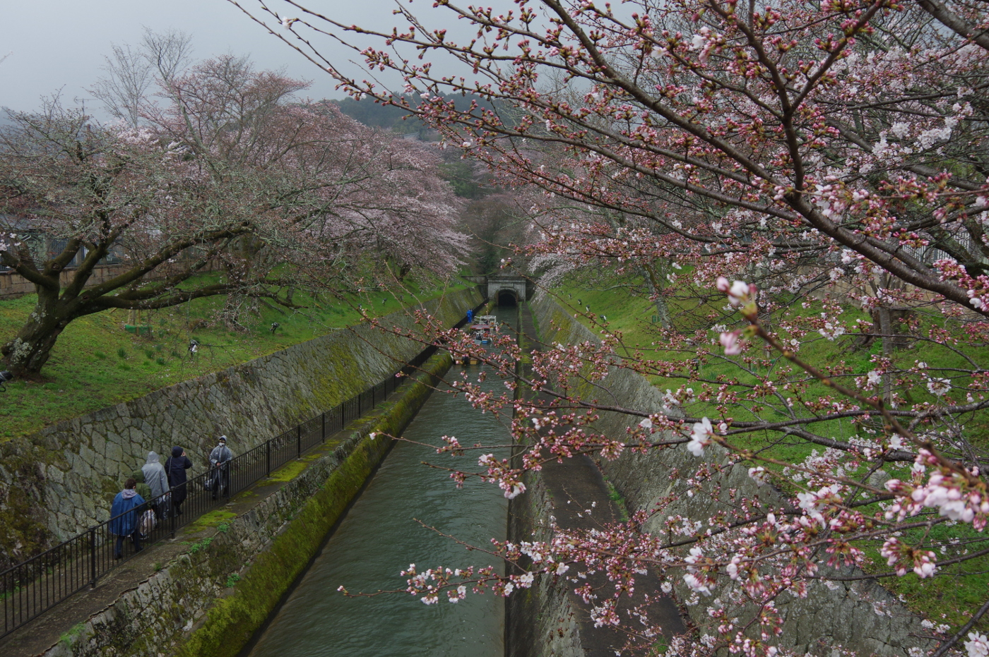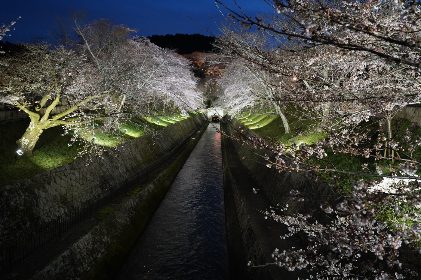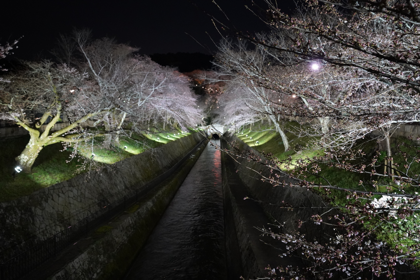 我が家の近くには花の名所があり、此のシーズンは人通りもあり、普段は閑散とした処も賑わうから不思議な感じだ。琵琶湖京都疎水の鹿関橋は堰堤の桜が咲くと橋上からトンネルに向かう眺めは素晴らしく誰が写真を撮っても遠近法が生きて素晴らしい作品になる場所だ。三井寺は昔から桜の名所としても有名だ。でも僕の少年時代はライトアップなど無く、夜桜と言えば長等公園が有名で、大津の桜の名所として賑わっていた。商店街から公園に向かう通りにはボンボリが飾られ、夜になると仄かな灯りが公園へ誘ってくれた。茣蓙やムシロを敷き、車座での酒宴が夜遅くまで続いた時代も既に記憶の外へと消えた。今では三井寺と疎水のライトアップが隆盛を極めて、夜桜なる風流な言葉は死語になったのではと思いながら鹿関橋の上からライトアップされた三分咲きの桜を写真に撮った。