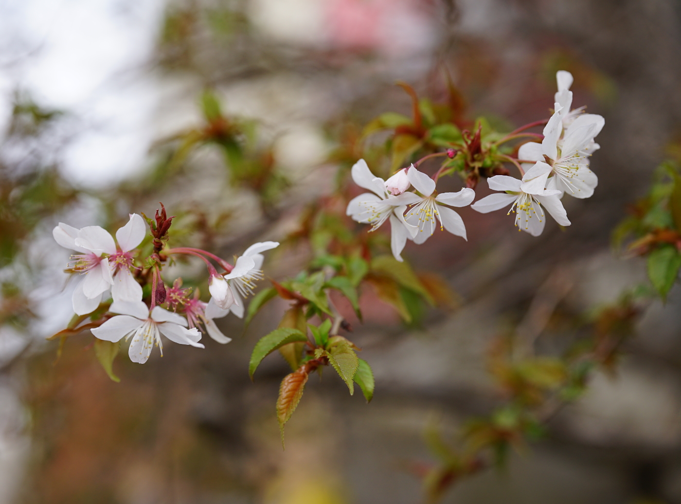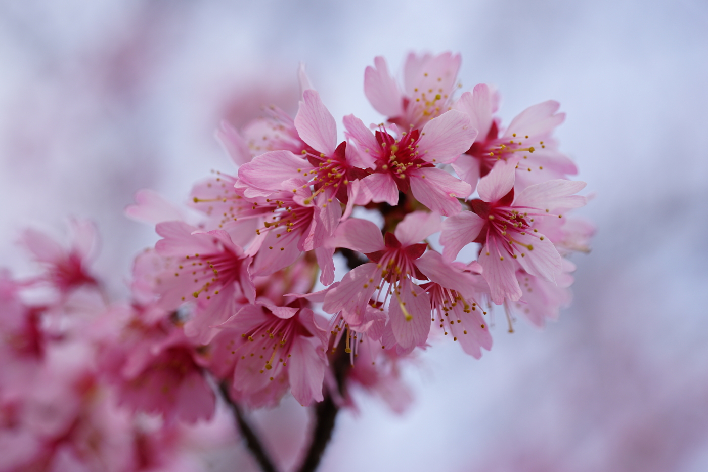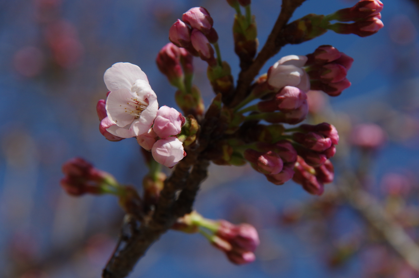 早咲きの桜が次々と咲き、一足早いお花見を楽しめるのも近くに色んな桜が在るからだ。パソコンで調べると桜の種類は600種類以上あり、11種の基本野生種、自然交配で100種類も在ることを知った。近くの尼寺遊心庵の門前に咲くジュウガツザクラは9月、お彼岸頃から咲き始め11月の最盛期には多くの花を咲かせ楽しませてくる、僕は最初は彼岸桜とおもっていたが、花は少ないながらも4月の桜シーズンまでも花を咲かせ存在感を示す清楚な桜花を今日もデジカメで撮った。大津では膳所由美浜の河津桜が一番に咲き始めると、時を同じくして皇子が丘公園のハツミヨザクラが、そして疎水の傍らのO邸のオカメザクラも続いて咲くと春本番になる、明日は26日、琵琶湖の恒例の行事比良の八講が行われる、言い伝え通り比良の八講荒れじまいとなりそうだ。今日から三井寺の春のライトアップが始まったが桜(ソメイヨシノ)はまだ開花していず寂しいオープニングとなった。三井寺はソメイヨシノが主体で山桜やエドヒガンらが少ないのが残念だ。ソメイヨシノが咲き始めると打出浜のオオシマザクラも咲き始め湖国は一気に桜の園へと・・・