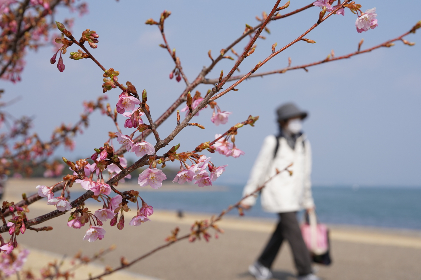 麗らかな春の陽気に誘われ膳所由美浜の河津桜が咲き始めたのではと予想した。そして僕は湖岸を自転車で目的地由美浜へ脇目もふらずに向かった。週末とあって湖岸を散策する人も多く湖国の春は幕開けしたのではと僕はおもった。由美浜に着き桜木に近づくと鮮やかなピンク色の河津桜の花が青空の下で輝いていた。咲いたと言っても一枝か三枝に花が咲いているだけで湖岸を散策する人は気づかずに通り過ぎて行き、立ち止まり花を愛でる人は少なかった。大津の桜事情では由美浜のカワヅザクラが一番に咲き始める、二番目は皇子が丘公園のハツミヨザクラだ。ソメイヨシノが咲くのは3月の終わり頃だ。毎年、河津桜の開花時に写真を撮ると、後で咲く桜花はには気の毒だが興味は半減してしまうのが残念だ。今日も随分とシャッターを押したがベストショットは一二枚かと思いながら撮影を止めた。デジカメになってから撮る枚数が多いと反省した。下手なテッポも数打ちゃ当たるの例えを思い出すと・・・ウクライナの事が頭を過ぎった、高精度のライフルや機関銃で狙い撃ちされれば命は幾つあってもたまらないと過酷な戦時下で恐怖に怯えながら逃げ惑う市民らの状況を思うと花を見ていても心は穏やかにはならなかった。早く休戦協定が決まることを願うしか無いと、ただ僕は空を見上げるしか無かった。