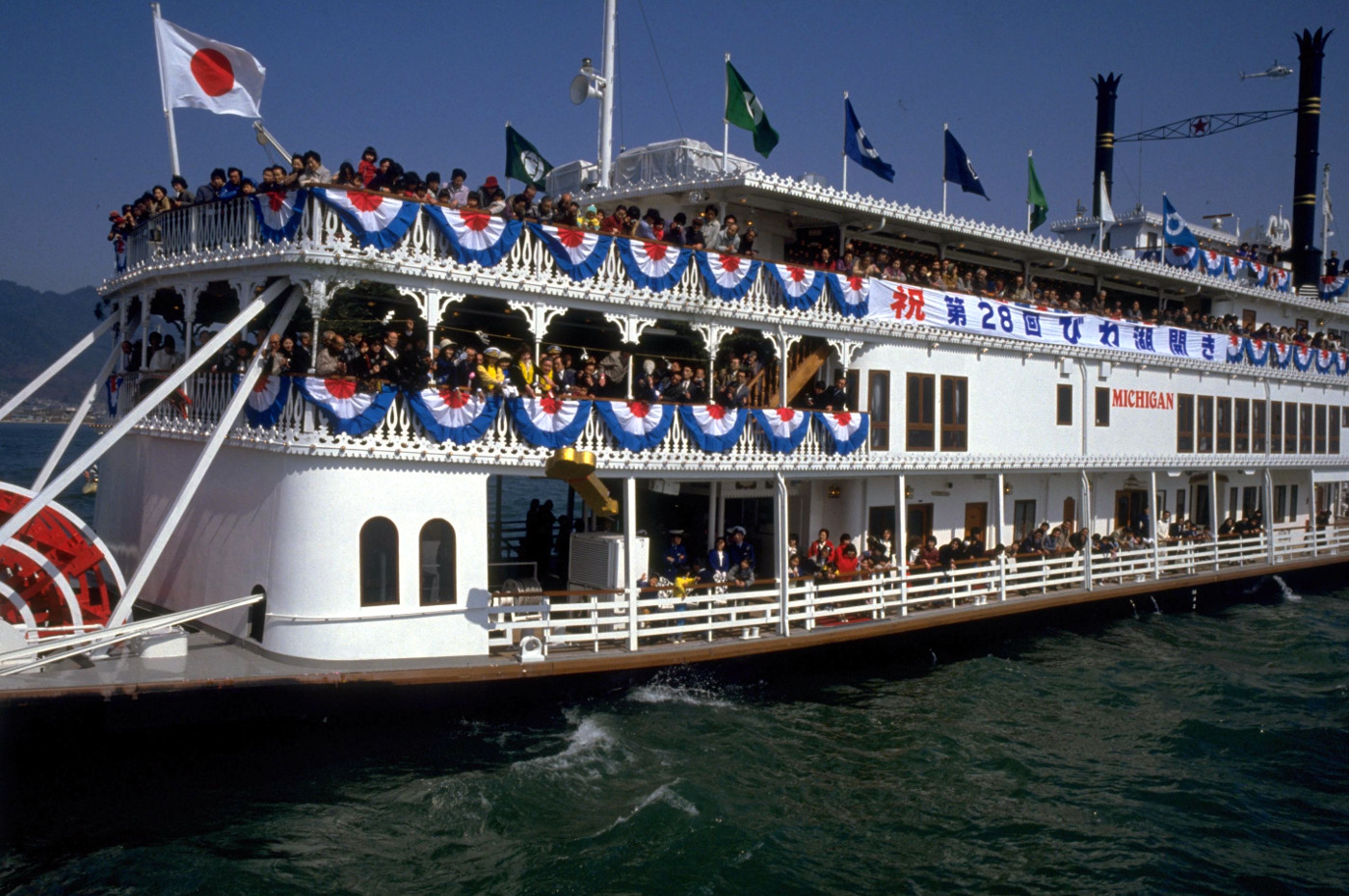 青空の下で第67回びわ湖開きが行われた。浜大津港へ向かうとミシガン号は出航した後だった。港周辺には多くの人がセレモニーを見に来ていた、NHKの朝ドラのヒロインが一日船長を務めるのが恒例になっているがコロナの影響で二年ぶりのセレモニー?が行われたからだ。湖上セレモニーでは一日船長,市長らがミシガン号から湖上へ黄金の鍵を投げ入れてびわ湖の観光シーズンの幕を開ける行事は続けられているようだ。黄金の鍵と言っても一メートル以上あるハリボテ(金色の紙張り)?今では発泡スチロール製の大きな金色の鍵?だ。其の鍵は二個用意されていた理由が面白く今も記憶している、日本の有名な放送局のカメラマンが鍵の投下シーンを撮り損ねた事があり、その後、鍵は二個用意されたと記憶している、僕が報道船から撮影した1983年第28回のびわ湖開きの時も二度鍵を投下したとおもっているが・・・今日、掲載二枚目の写真は僕のアーカイブ写真で、大きな鍵が空中にあるのが見える、僕は失敗しないからと懐かしい黄金の鍵のエピソードを思い出した。現代はデジタルカメラ時代で失敗するカメラマンなどいる筈はないだろうと望遠レンズを付けたデジカメで沖合の湖上パレードの様子を撮った。