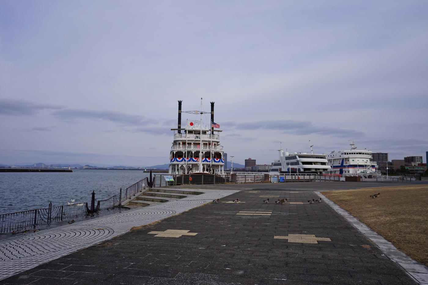 浜大津港ではヒドリガモが緑地へ飛ばずに歩いていた。鳥も歩くほうが楽なのかと写真を撮った。二枚目写真です。
