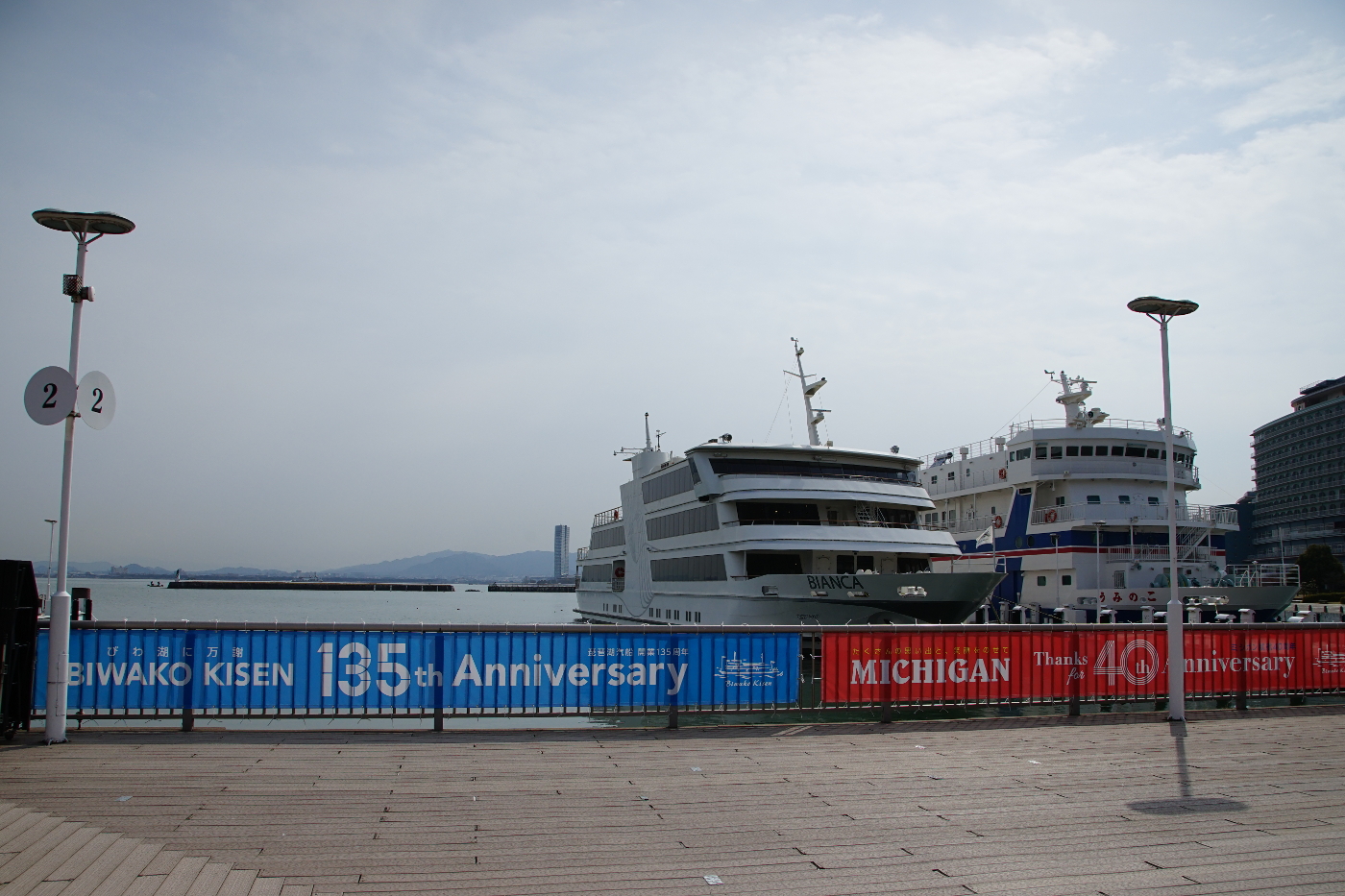 湖岸ポタリングで毎日通る浜大津港の桟橋に琵琶湖汽船135周年観光船ミシガン号40周年の記念幕が掲げられた。琵琶湖汽船は以前、太湖汽船と言われていた、其の頃は定期航路も多く湖上交通は華やで汽船乗り場は何時も賑わっていた。今は其の面影すら感じられない寂れた佇まいだ。湖上を行き交う船の姿もない静な湖面を眺めていると人の作った文明が少し賑わっただけの短い時間が過ぎただけではと・・・日常の積み重ねが平和に続いて行くことを願いながら湖岸を走った。