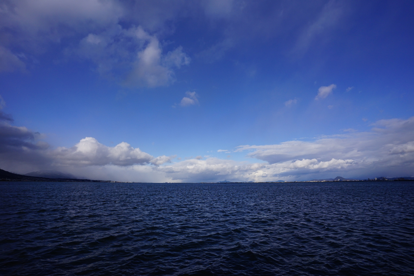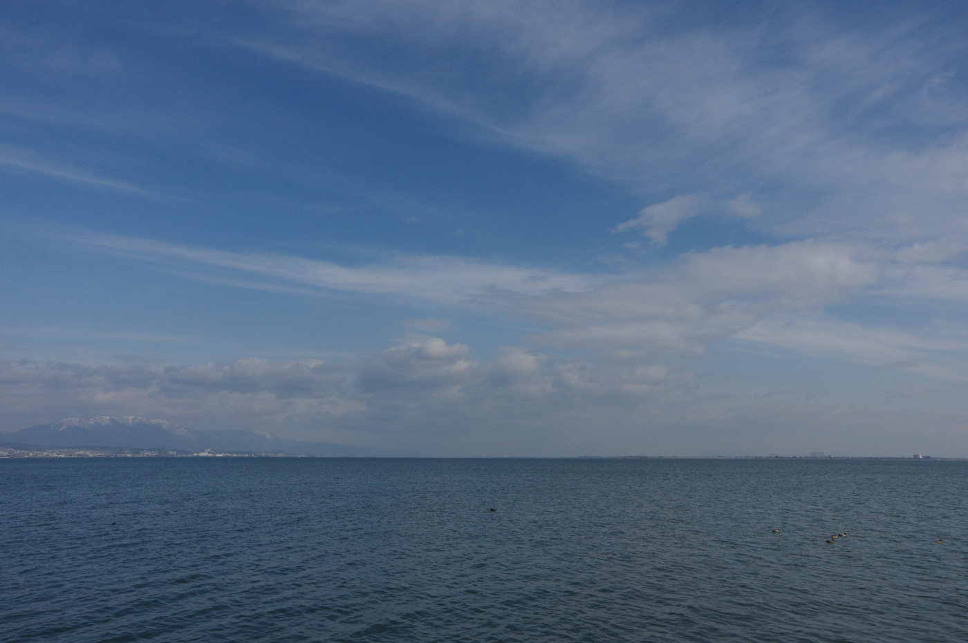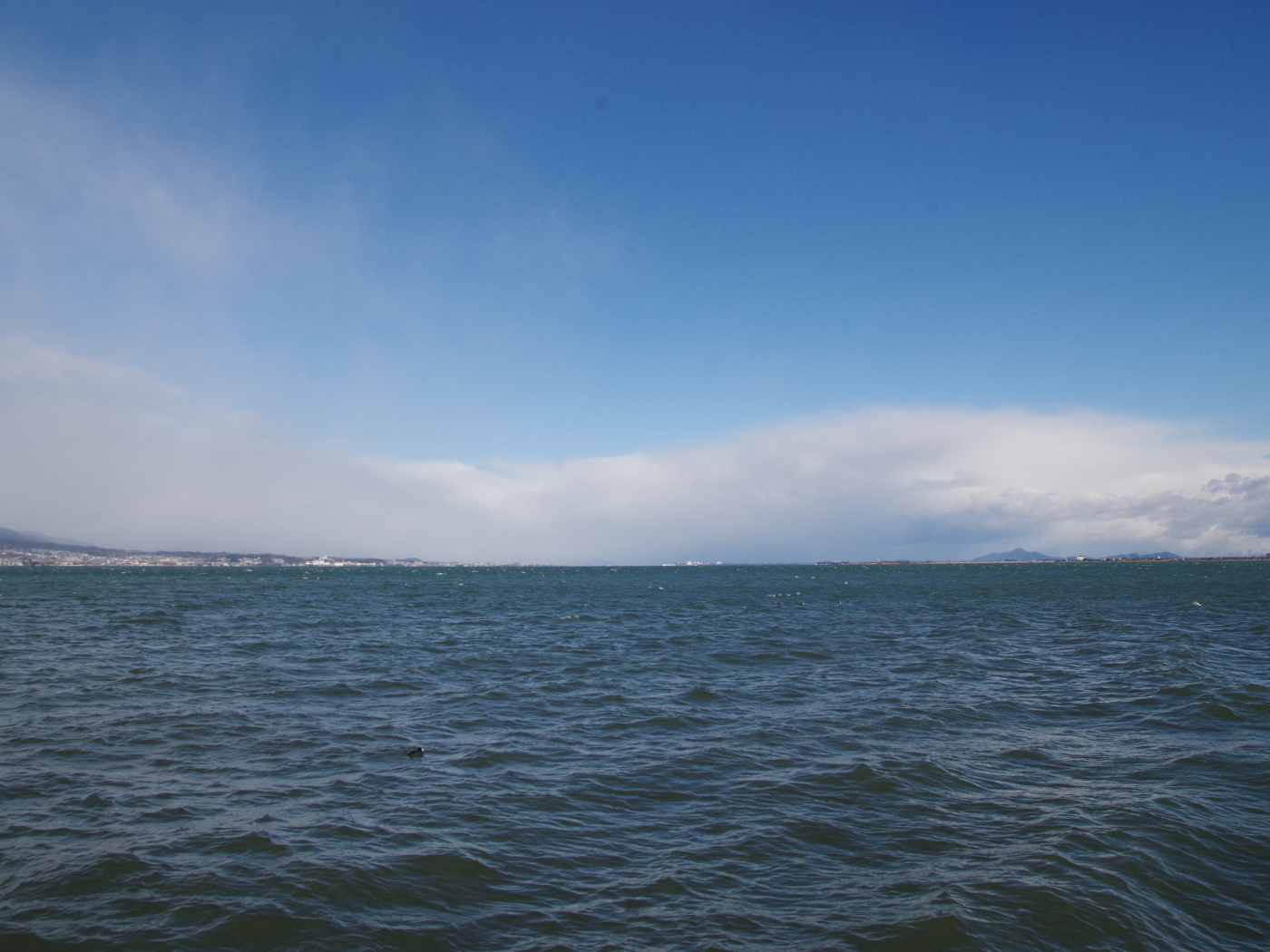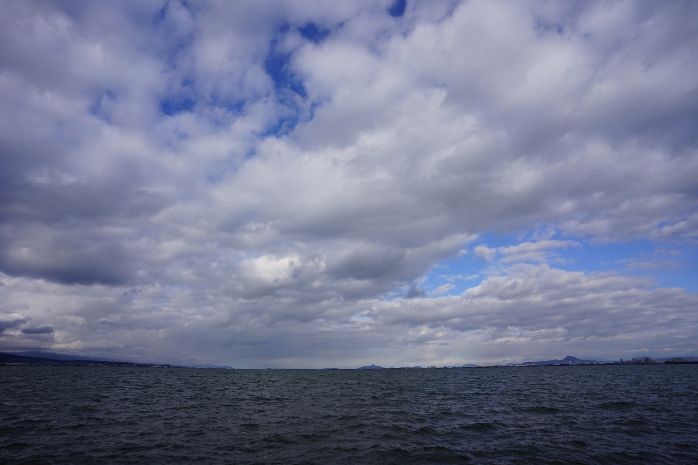 今日も琵琶湖は冬型の強い偏西風が吹き荒れて湖上は白波が立っていた。山用のダウンを着て防寒対策は万全で湖岸ポタリングで膳所由美浜へ向かった。琵琶湖の水が全層循環したとニュースが数日前に伝えていた、去年に続いて琵琶湖が深呼吸できて良かったと湖岸から波立つ湖面を眺めると水も綺麗に見えた。全層循環の事は今から53年前に大津青年会議所JCのメンバーで琵琶湖の富栄養化を問題にした環境映画を作る時に滋賀大学の岡本巌教授に琵琶湖の水の表面の水が冷たく、そして酸素を多く含んだ重い水が湖底に向かうと深層と表層の水が混ざり湖底まで酸素が届く現象を琵琶湖の深呼吸と言うと話された取材時を思い出してきた。映画「青の輝き」は16ミリ映画で彼方此方の集いで上映された。今では其のフイルムの無いと聞く、幻の映画になってしまったが僕の記憶のスクリーンに上映する事が出来るのは撮影カメラマンだったからだと思った。今日の琵琶湖は映画の題名通りの青い琵琶湖が冬空の下で美しく輝いていた。