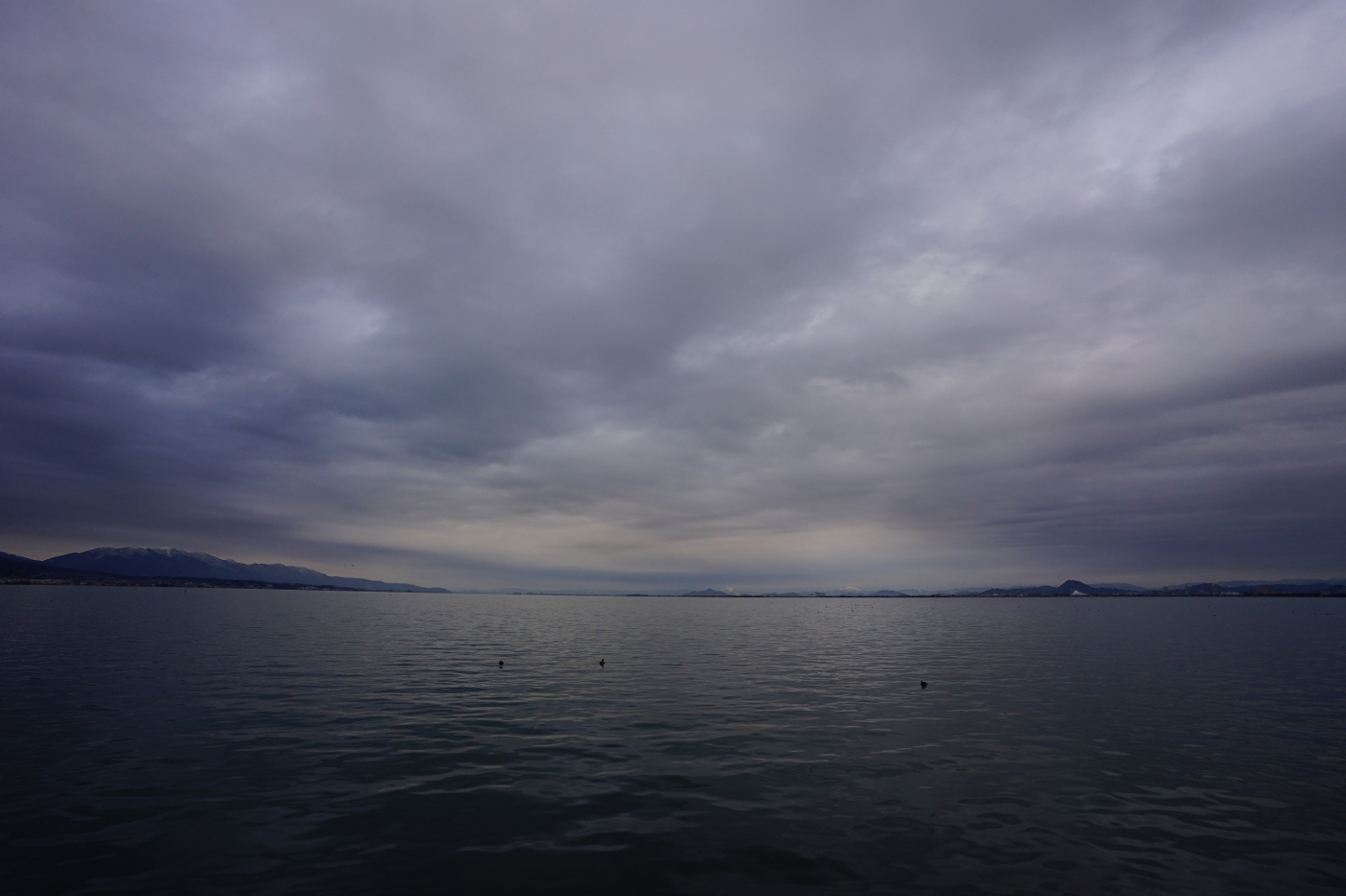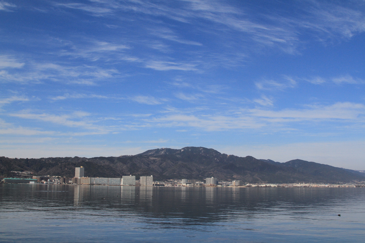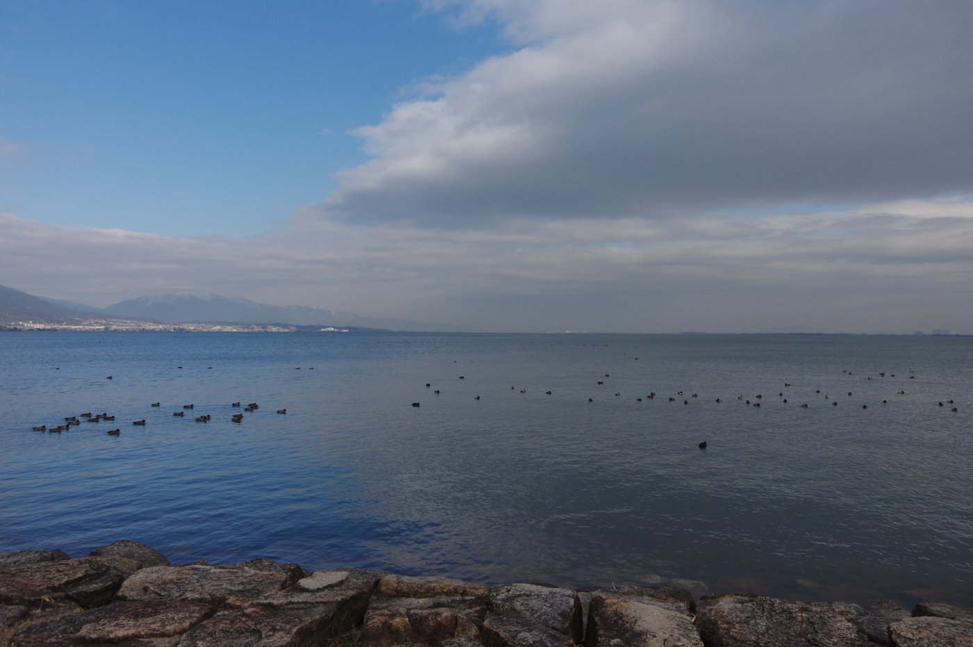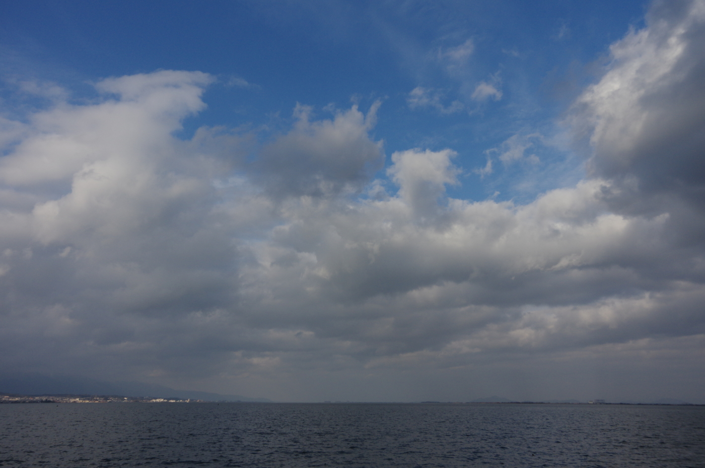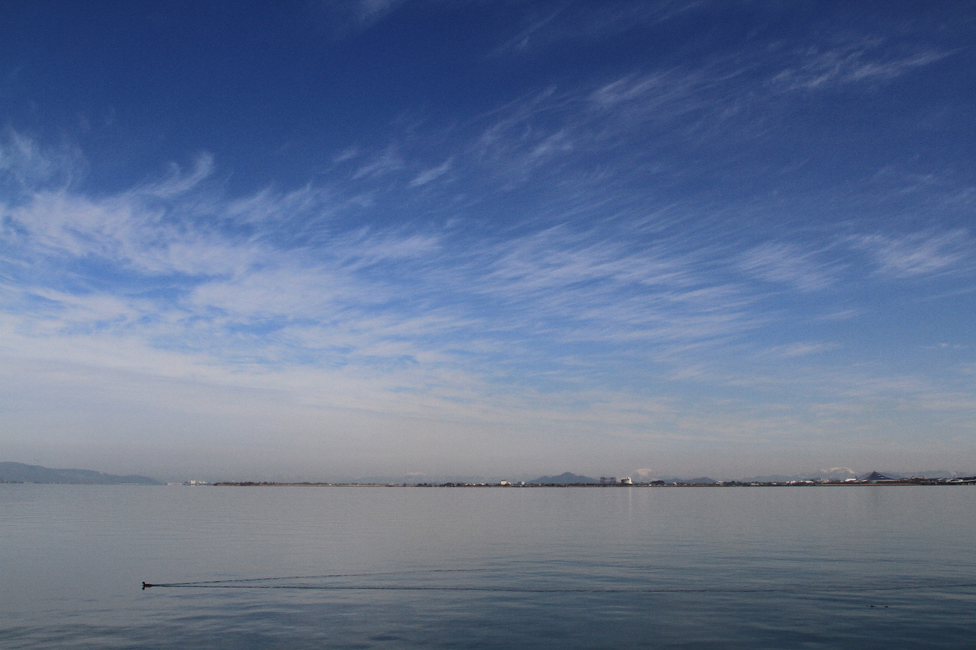 1月も後、僅かに・・余りにも早く過ぎる時の流れは年齢が加速させているのではと散歩に出かけた。三井寺の展望台から琵琶湖を眺めると上空には巻雲が北東へ向かっていた。上空は風が強いのか空のキャンパスに描かれる雲の作品は直ぐに移動する、じっと見ていると時計の針の様に動きは目では確認できないが、デジカメの操作をしている間にも動いていた。巻雲は高度7000メートル以上と距離も離れているが時速100ノットは出ているのではと空を見上げた。境内では大きなツブラジイの老木が倒されるところを見た。樵のKさんが大きなツブラジイの傍らで枯れ木同然の大きな幹の切り口を見ながら説明してくれた。三井寺は椎の木が多く残っている貴重な場所で境内には椎の大木を彼方此方で見られ、老木も多く枯れ枝が落ちると危険なため参道に近い木は伐採される運命だ。湖岸ポタリングでは視程50キロメートル以上あり鈴鹿の山も見えた。琵琶湖も上空に雲があるとダイナミックな光景が見られ、僕は何枚もシャッターを切った。そんな美しい雲のある眺めも午後には雲に覆われた。空の移ろいの速さも老人時間に合せてくれたのではと写真をパソコンにアップした。