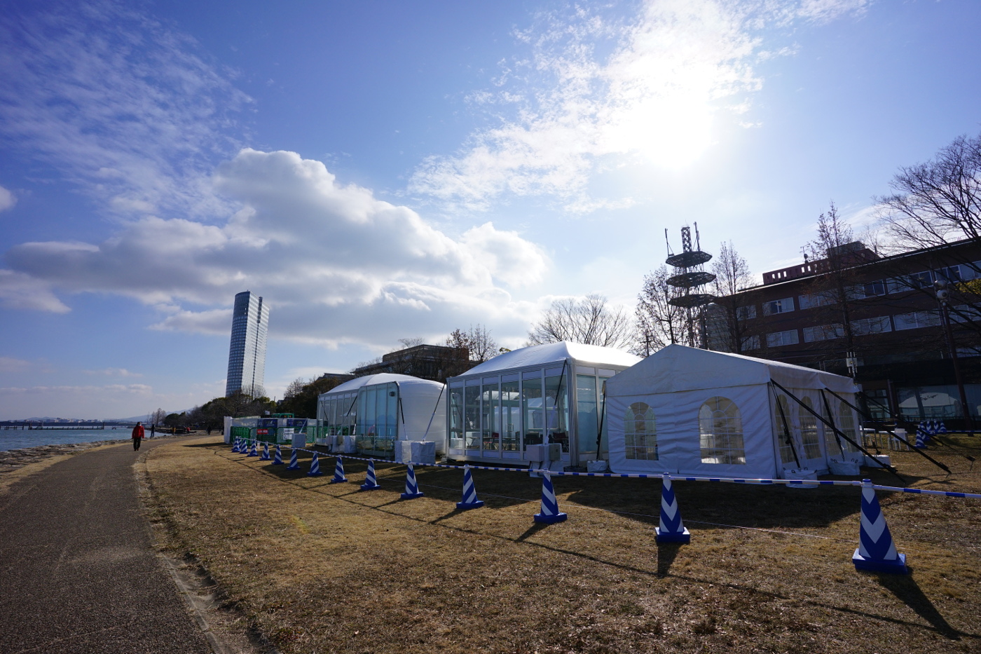 休日の湖岸はオミクロン株による新型コロナ感染者が急増している事もあり休日としては人出が少なく感じた。湖岸ポタリングで膳所公園へ向かう途中、におの浜ではパビリオンが建設中だと言っても巨大なものではないが近未来を感じるデザインの簡易なパビリオンが湖岸に出現した。プレハブ風だが、お洒落なデザインで思わず写真に撮った。そしてFBにアップするとマスコミ関係の知人Iさんから、コメントがあった。人に会わずネットで仕事ができる、リモートワーク実証実験の部屋だと思うと記してあった。僕はお洒落なカフェかレストランかと思っていたから少し残念だ。でもスケルトンで中は丸見えだから人に会わないが、湖岸を歩く人からは丸見えでは会わない代わりに見られるのではと思った。不思議な時代になったものだ、会うのは嫌だが見られるのは良いのかと、少し矛盾を感じた。