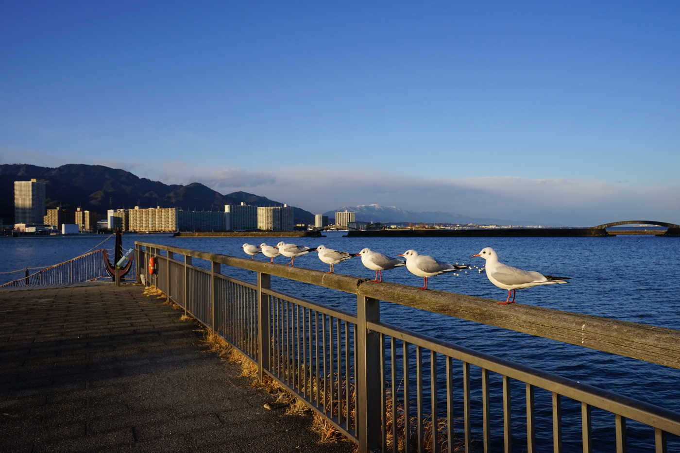 三井寺の暮れの3日間は入山料が無料に・・観光客も少なく従業員の正月休暇で志納所(券売所)は無人だから自由に境内に入れるが国宝金堂らのお堂は殆ど閉まっていて内部を見ることができないが、西国霊場の観音堂だけは開かれていて今日も御朱印を貰う人を見かけた。湖岸ではバス釣りの人や年末休暇でジョギングする人も多く見かけた。商店街でも普段より人出も多く唯一八百与商店は賑わっていた。家では自分の出来る範囲で簡単な掃除や蛍光灯を取り替えたりと少し何時もと違った動きをするだけで筋肉痛を感じ、81歳の爺の体力はこんなものかと思い知らされた。夕方近く湖岸へ向かうと浜大津港の手摺にユリカモメが夕陽を浴びて留まっていた。以前なら数十羽以上がずらりと整列してくれたのにと思いながらデジカメのシャッターを切った。湖上を見るとユリカモメが多く浮かんでいた。今年のユリカモメの様子が少し違うのは故郷カムチャッカで何か影響があったのかと想像した。今年のユリカモメは自然の中で餌を探して飛び回っているようだ。パン屑を当てにするユリカモメより好きになった。