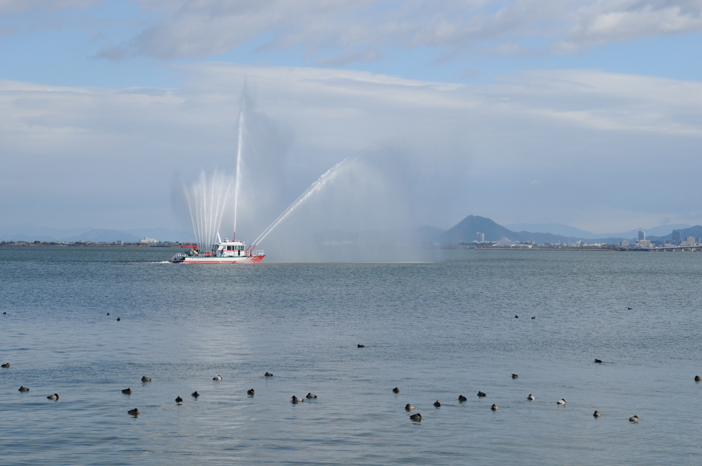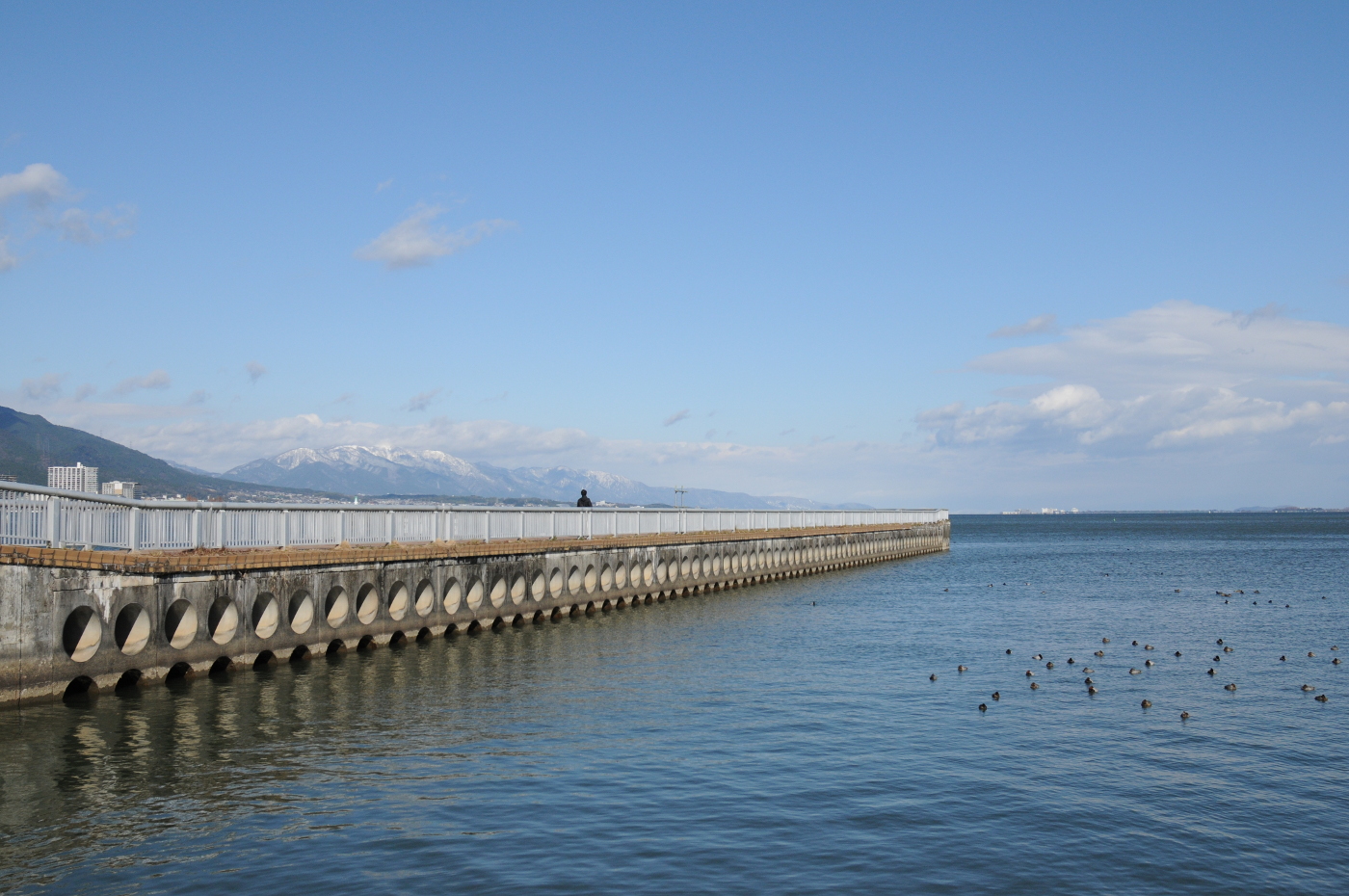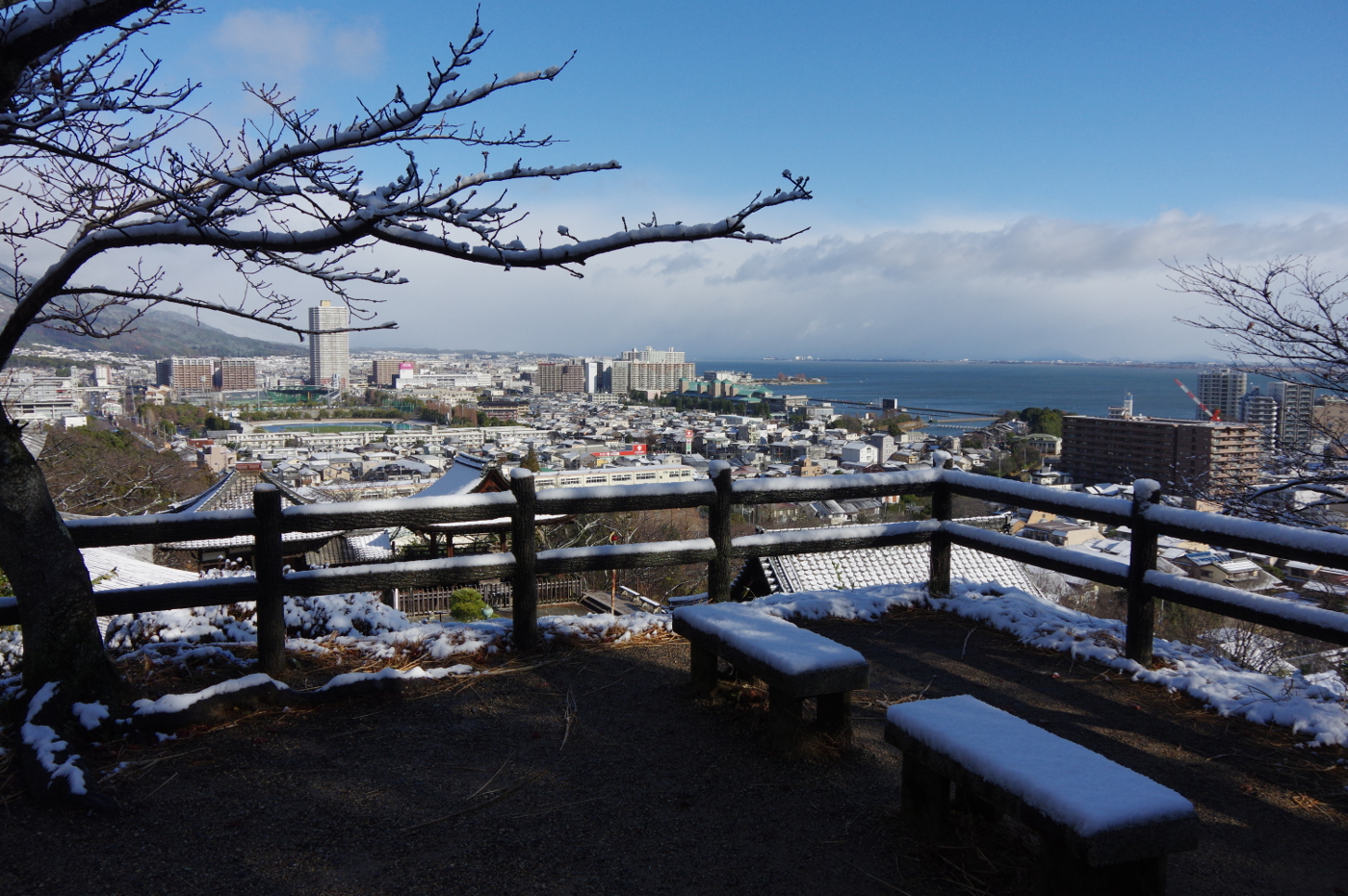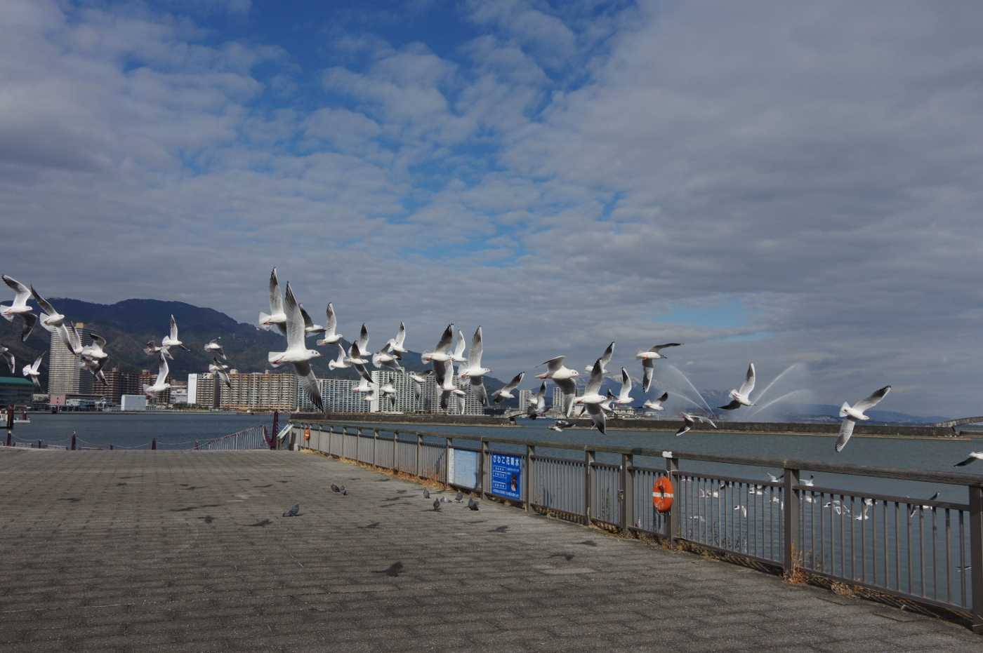 朝、FBを見るとBEN BENさんが三井寺の雪景色をアップしていた。朝食を済ませて、初雪を撮りに三井寺へ出かけるも、木々に積もった雪は溶け落ちていた。展望台まで行くと雪は少し残っていた。デジカメを出して雪景色を撮った。今でも雪を見るとスキーに行きたくなるが左股関節がサイボーグではと諦めた。比叡も薄っすらと雪化粧をしていた。湖岸ポタリングで走る湖岸からは琵琶湖大橋以北は雪雲に覆われていた。湖面にはオオバンやカモの姿は見えるもののユリカモメの姿は見かけなかった。先日、沖合でユリカモメらしい群を見ていたから、例年の様に浜大津港の手摺に溜っているのではと期待してデジイチまで持ち出したのにと少し落胆した。そして膳所公園の入江に掛かる橋を目指した。此の橋の付近ではパン屑を与える人を目当てに欄干に整列している時もあるからだ。着いて見るとユリカモメの姿は無かった。先日来、沖合で確認した群れは何処へ消えたのかと思いながら強い向かい風の中を自転車を漕ぎ浜大津へ帰って来て、何気なく湖面を見るとユリカモメの群れが見えたので、直ぐに自転車を止めた。カメラを構える間もなくユリカモメが飛び立ったが上手くファインダーの中で捉えて連写できた。急に飛び立ったのはカメラが銃に見えたのかもしれないと考えた。例年通りなら湖岸の手摺や橋の欄干で整列している姿が見られるのだが、今年は何故と・・・ユリカモメの心境に変化が起きたのか、それとも水位低下で琵琶湖に異変が起きているのか・・カムチャッカでの暮しの中で何か事件が在ったのかとユリカモメたちを心配した。