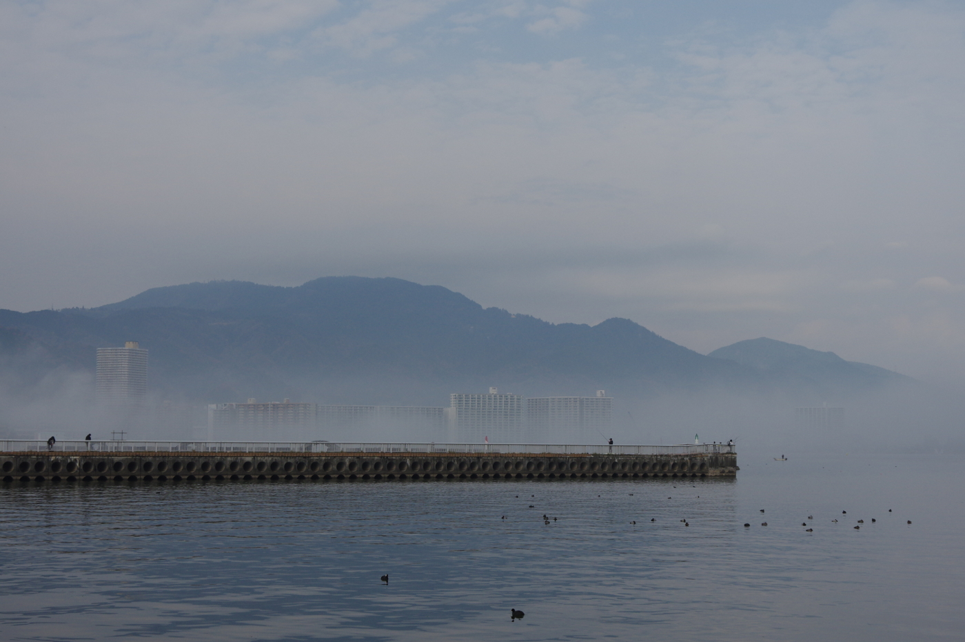 霧が発生していると分かっていれば散歩の時間を早めればと少し後悔した。三井寺の展望台から霧の少し残る風景を眺めた。映画でも霧が立ち込めるシーンが多く出てくるタルコフスキーの「ノスタルジア」や「ストーカー」そしてアンゲロプロスの「エレニの旅」や「こうのとり、たちずさんで」らに出てくる霧のシーンの素晴らしい映像を思い出した。湖岸ポタリングで浜大津へ向かうと比叡山の麓から西大津近辺には霧がまだ漂っていた。そして琵琶湖も琵琶湖大橋や比良山も霧の中だ。冬の休日は湖岸も静な佇まいだ、観光船ミシガン号も定期検査で姿は見かけなくなった。イベント広場では露店が出ているが人影も少なく寂しさが漂っていた。そして琵琶湖の水位は当分の間は低水位が続くのであれば渇水が心配だ。