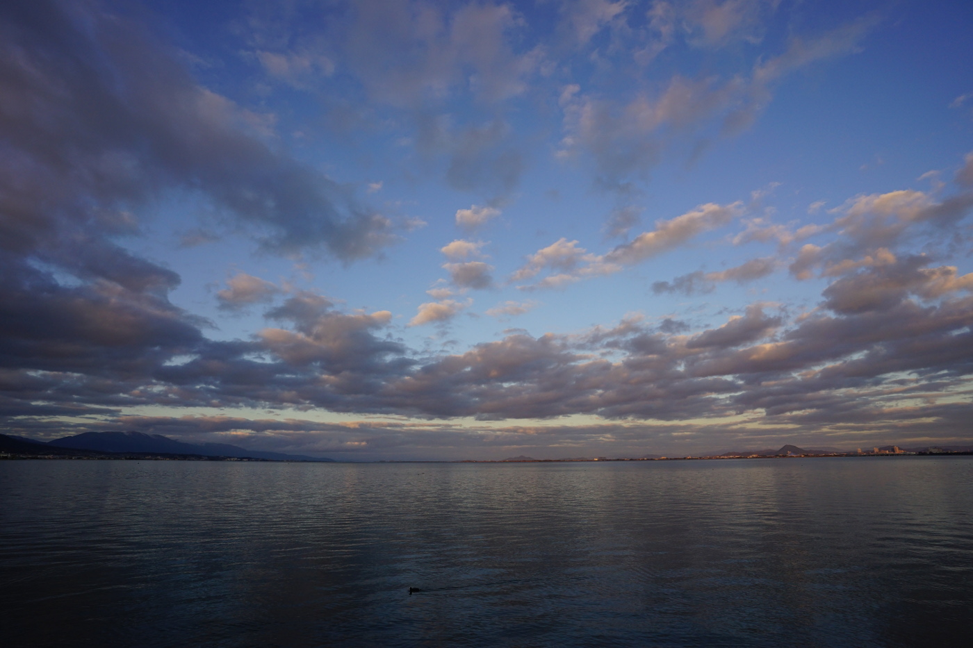 初冬の湖岸ポタリングは北西風も弱く風に悩まされずに済んだ。まだユリカモメの姿は見えない湖面を眺め、カムチャッカをテイクオフしたのではと北の空にユリカモメの姿を探した。水鳥も分散したのか大群の姿は今日は見られなかった。やはり気になるのは琵琶湖の水位だと湖面の高さが一目で分かる浜大津港の突堤を見ると異常渇水になるのではと心配になった。帰路、大津の商店街へ進むと百円商店街が久しぶりに開かれていたが僕が訪れた時は人は疎らで以前の賑わいは感じられなかった。やはりコロナが完全に終息しなければ日常は戻らないとおもった。午後、伊坂幸太郎の「フーガとユーガ」を読み終えて気づくと4時半を回っていた。窓を見ると雲に少しの赤みが残っていた。琵琶湖が招いていると急いで自転車に乗って湖岸へ向かった。少し遅かったが琵琶湖の神秘的な夕景を見ると心が鎮まった。唯 淡々と過ぎゆく時間が愛おしく感じる暇な日が良いと思った。