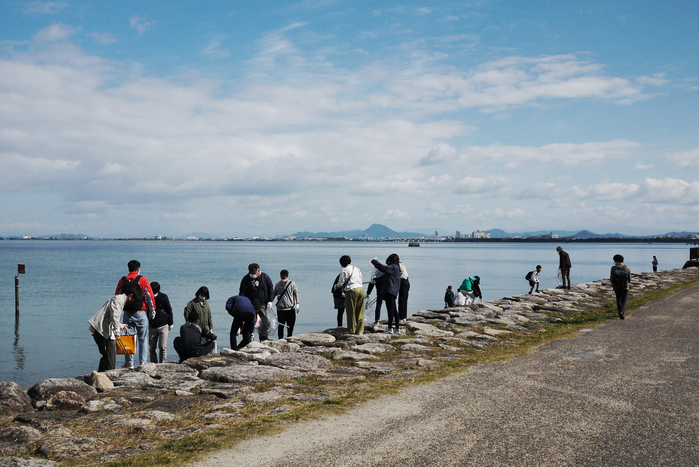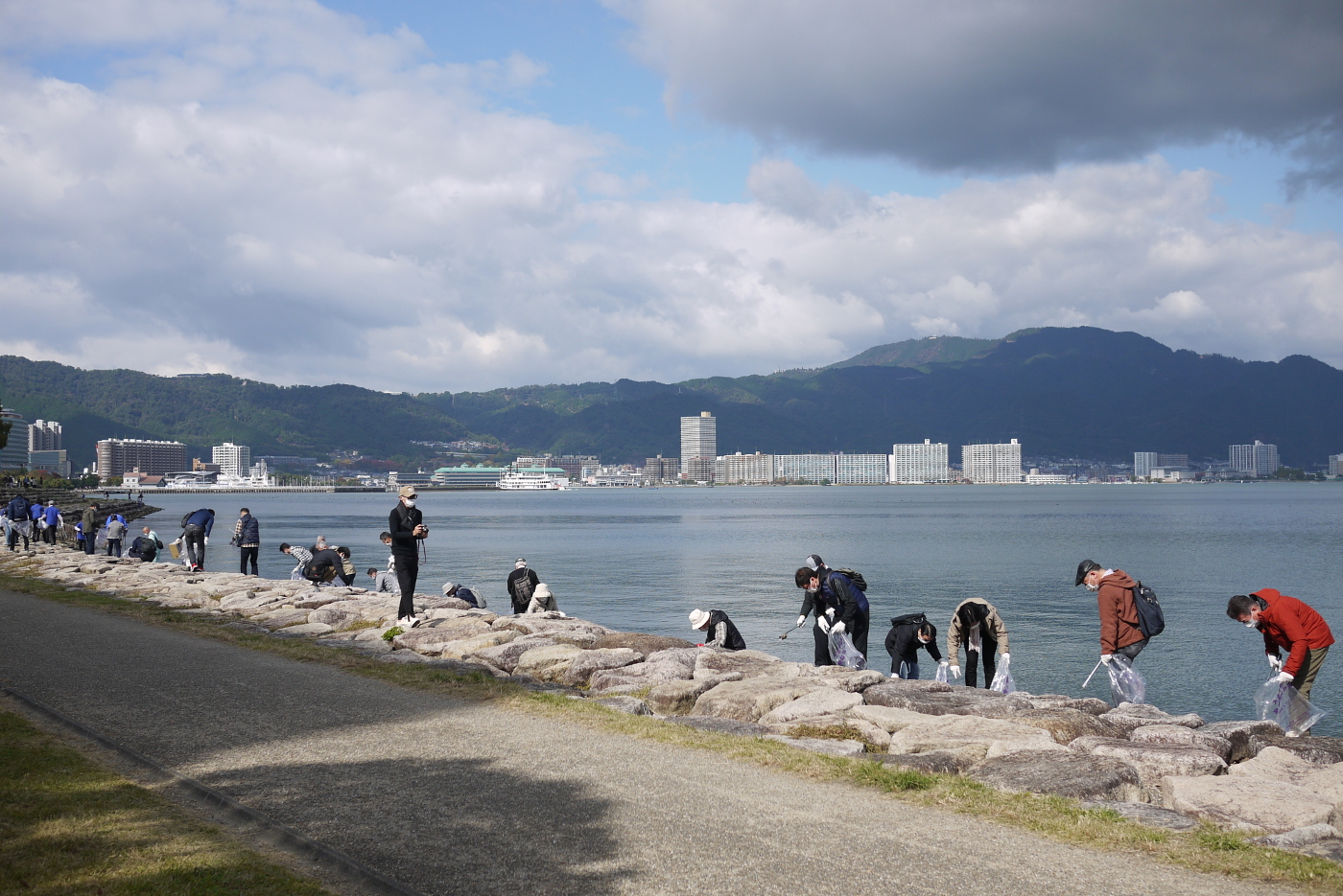 ボランティアの湖岸清掃もコロナ禍で中止されていたが、今日、ボランティアの団体組織?会社関係?の人達がにおの浜に集結していた。大勢の人達はゴミ袋とゴミバサミを持って湖岸に捨てられているペットポトルや空き缶らを拾い集めている光景は久しぶりとデジカメのシャッターを押した。浜大津近辺では心無い人達が無造作にコンビニで買った食品のプラゴミ、ペットポトルらを捨てたまま立ち去る事が多く、ゴミが散らばっているのを見かける、でも気がつくとゴミは無くなっているのは個人で清掃をしている人を見かける事があり、声を上げるより黙って行動する人が湖岸を綺麗にしている事に気づいた。僕が時々、見かける人達は一人で行動されていて、男性、女性が、さり気なくゴミを拾う姿を見かけ、頭が下がるおもいだ。本当のボランティアとおもった。僕も写真を撮っている時に、足元にあるペットポトルを拾う時もあるが、其れは汚れていないものだけだと少し反省しながら湖岸を走った。膳所由美浜で折り返し打出浜まで来ると、清掃作業をする人達のゴミ袋には拾い集めたゴミが詰まっていた。今回のボランティア団体は凄いなと思いながらペダルを漕いだ。