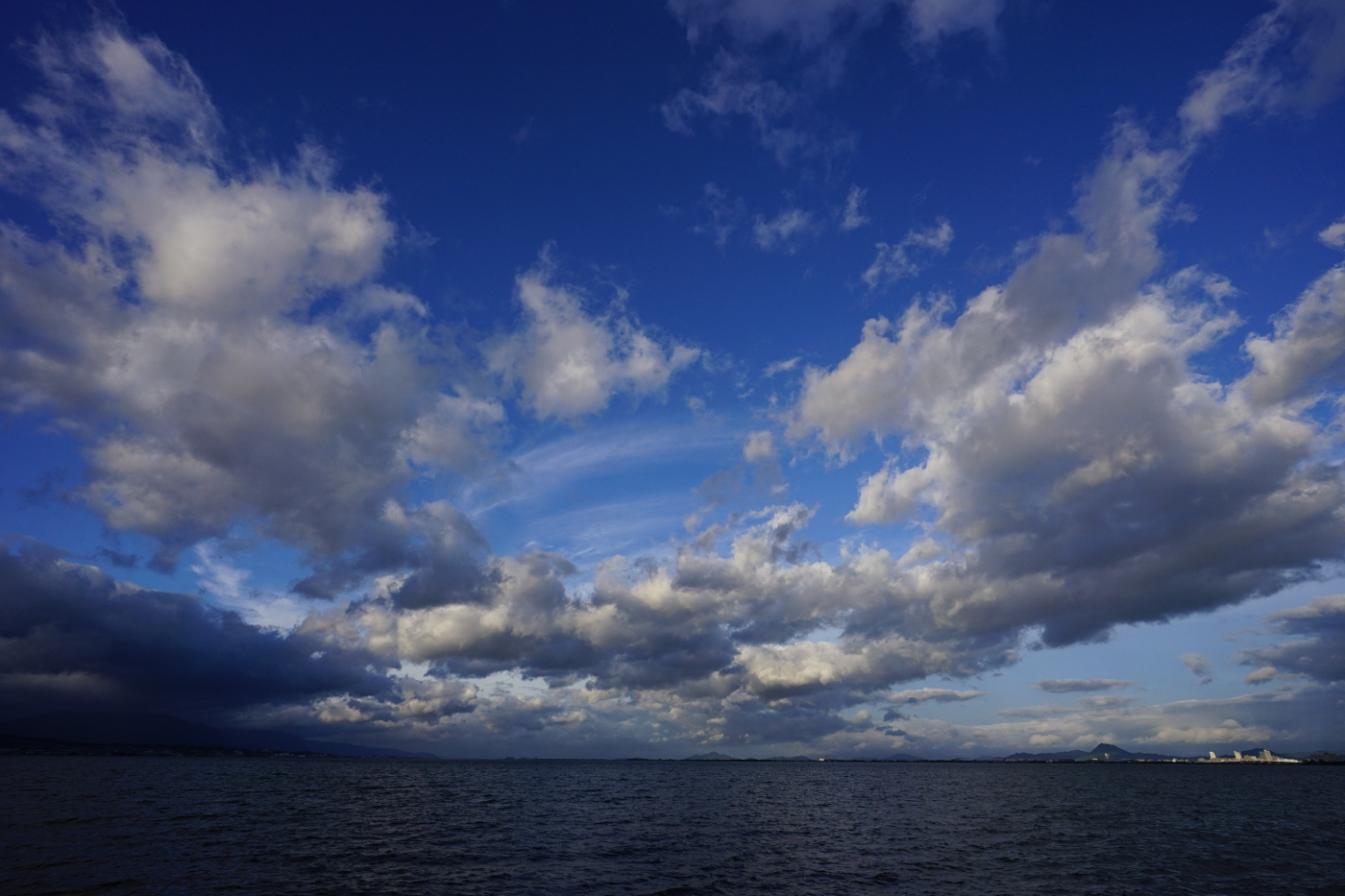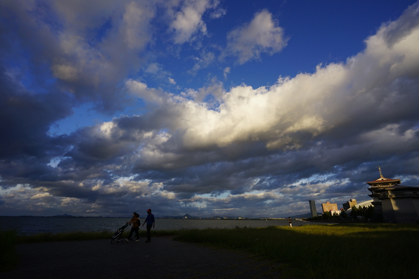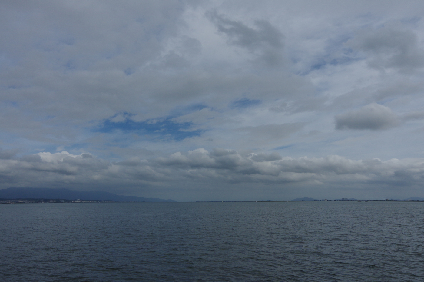 今日は昨日の青空から一変して雲が主役となった。午前中は波状高積雲が楽しめた。琵琶湖の空間があるお陰で雄大な雲の眺め格別だ、大都会では味合うことの出来ない環境は郷土の宝物だ。湖岸のベンチに座り大空の雲を肴に雲見酒も良いのではとおもった。でも雲見酒を楽しむ人が増えたらゴミの散乱が心配だ、心無い人が飲食後に放置したビニール袋やペットポトルや缶らのゴミが見られるからだ。やはり閑散としている方が雄大な琵琶湖の風景を楽しむには今のままで良いと思った。夕方、一度雲に覆われていた空に隙間ができ鈍いながらも輝いた雲が見えた。自転車を出して湖岸へと向った。浜大津湖岸から琵琶湖を見ると上層には高積雲がそして積雲らの下層雲が入り交じる眺めは秋を感じさせてくれた。