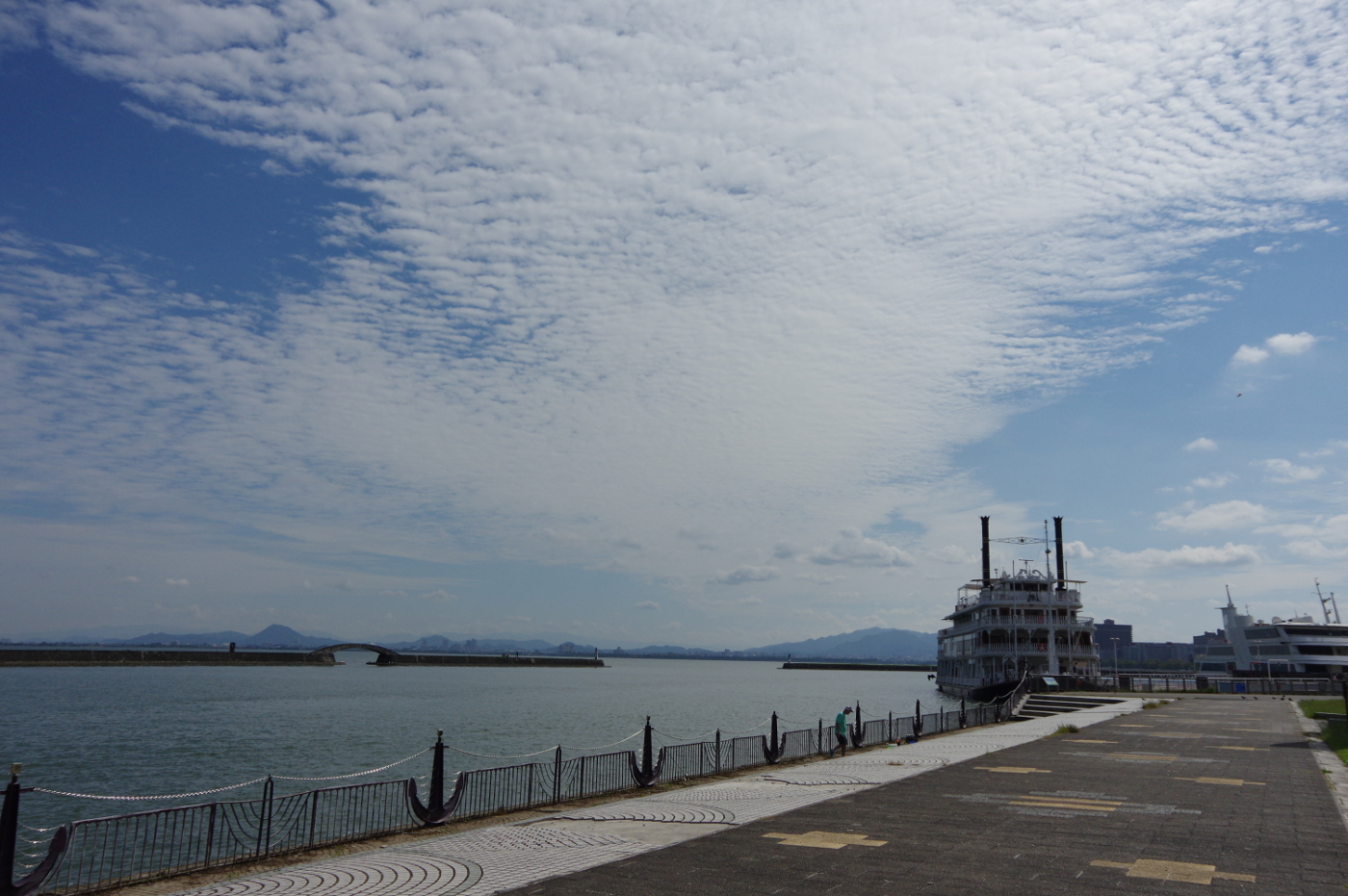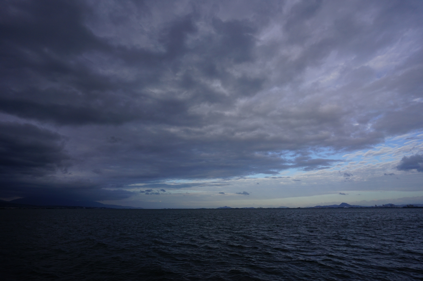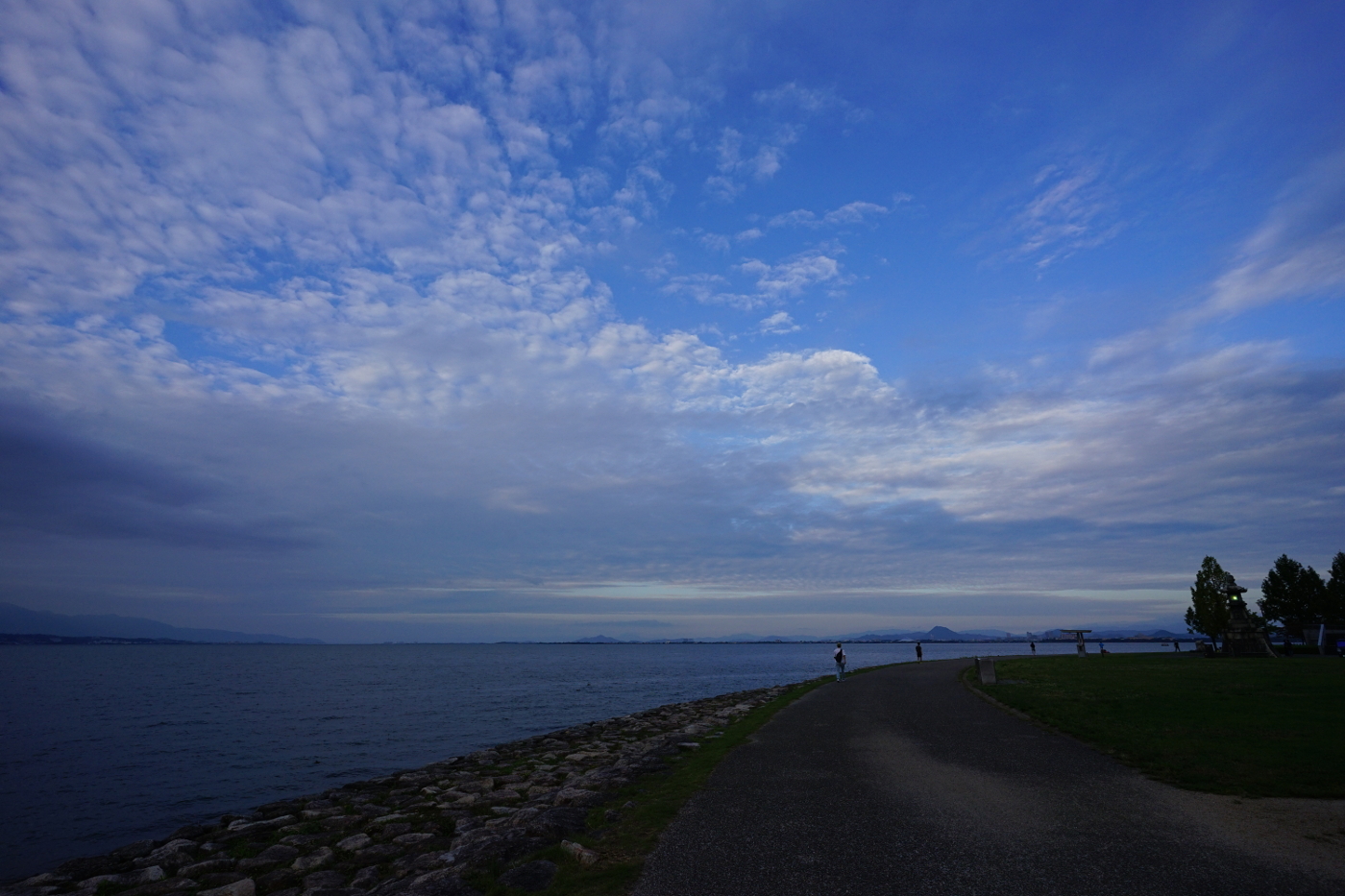 今日は昨日の青空から一変して雲が主役となった。午前中は波状高積雲が楽しめた。琵琶湖の空間があるお陰で雄大な雲の眺め格別だ、大都会では味合うことの出来ない環境は郷土の宝物だ。湖岸のベンチに座り大空の雲を肴に雲見酒も良いのではとおもった。でも雲見酒を楽しむ人が増えたらゴミの散乱が心配だ、心無い人が飲食後に放置したビニール袋やペットポトルや缶らのゴミが見られるからだ。やはり閑散としている方が雄大な琵琶湖の風景を楽しむには今のままで良いと思った。夕方、一度雲に覆われていた空に隙間ができ鈍いながらも輝いた雲が見えた。自転車を出して湖岸へと向った。浜大津湖岸から琵琶湖を見ると上層には高積雲がそして積雲らの下層雲が入り交じる眺めは秋を感じさせてくれた。