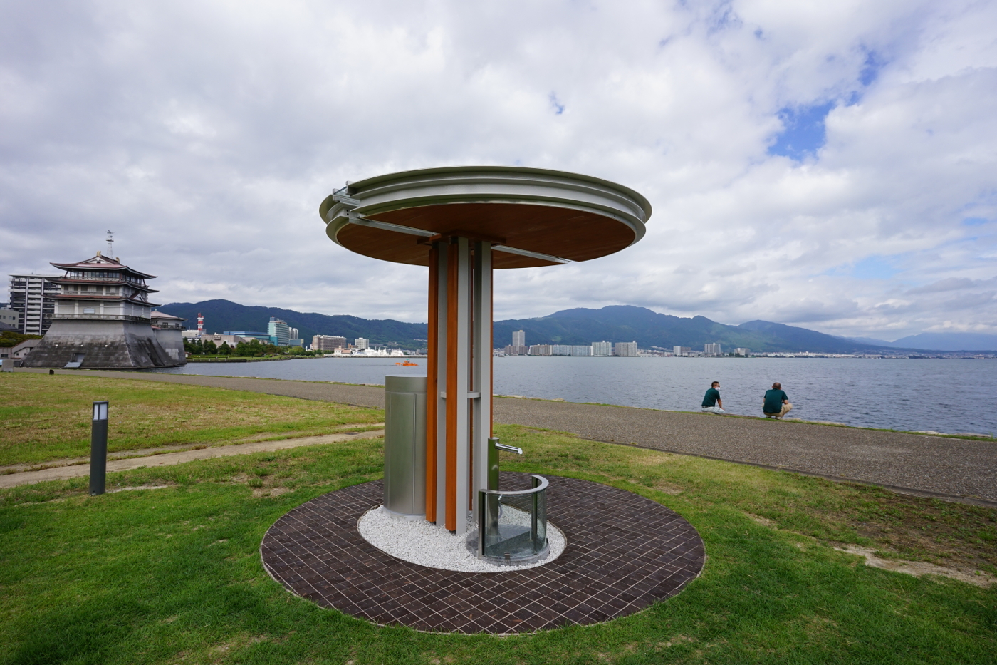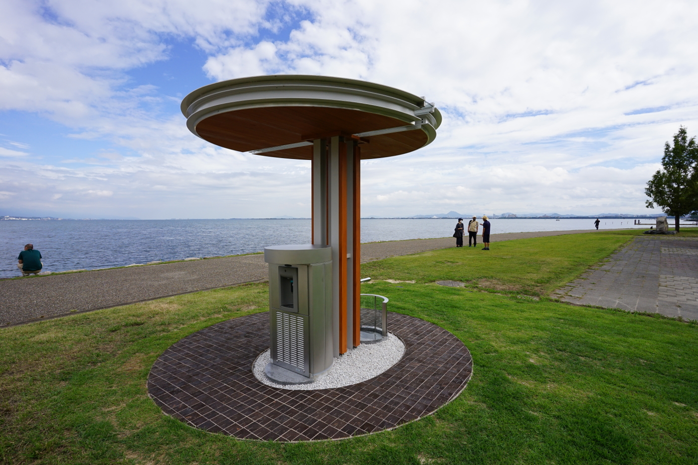 最近、よく出てくるSDGsは持続可能な開発目標として17項目が掲げられた、言葉だ。僕の嫌いな言葉は地球のために、から始まる環境運動は素直に好きになれない、最初から人間が住めなくなっては困るから始めた運動と素直に言えば僕も納得するのだが、今回のSDGsも人間の為、だけの事を考えた運動だと僕は理解しているからだ。人類が滅びても地球は絶対に滅ばないのは皆、知っていることだ。そして17項目の13番目で気候変動で具体的な対策・・14番目海の豊かさを守ろう15番目陸の豊かさを守ろうである、何で人間が上から目線で今更、地球の資源を食い尽くしながら言える言葉ではないと思った。恥を知らない生物の代表が人間であることは確かだ。今日の湖岸ポタリングで打出浜に来てみると新しく出来た小さな施設、湖岸の給水スポットはSDGs絡みの企画だ、近くへ寄ると市の企業局の人がペットポトルの減量を目指してマイボトルに給水出来る施設だと説明してくれた。琵琶湖のプラスチック問題の原因はペットポトルが多くを占めているらしいが、僕は湖岸近くに在る自動販売機を無くすのが良いのではと、給水施設を写真に撮った。マイボトルをセットしてボタンを押すと水が出る仕組みも電気機器では耐用年数も限られているのでは、十年後には大きな粗大ごみにならなければと少し心配しながら、其の場を離れた。