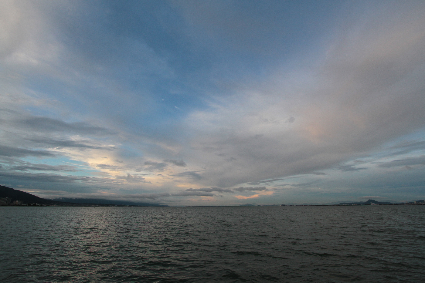昨夜はスマホアラートが避難指示を伝えてくれるが避難はしなかった。我が家の前の道路は子供時代から強い雨が少し長く降ると川の様になり、雨が止むと直ぐ道路に戻るからだ。でも最近は様子が少し違う、24時間の内に三回も家の前が川になった。そして少し玄関から水が入る程度だが今回は用心して消防団の方に土嚢を積んでもらったから三回目は敷居から染み込む程度で済んだ。今日も少し降るかと思っていたら、久しぶりに晴れ、湖岸ポタリングを楽しめた。琵琶湖上空は空の美術館が開館してダイナミックな雲の作品を展示してくれた。夕食後、空を見ると夕景が期待できそうなので浜大津港へ向った。休日とあって観光船ミシガン号が黄昏れの湖上を楽しむ人達を乗せ出航して行った。刻々と変わる夕景は見飽きることがないと湖岸に佇んだ。今日の夕景は高積雲が空を占めているがロール状の雲や薄明光線そして飛行機雲まで楽しめると夢中でデジカメのシャッターを押した。そして撮影を止めてゆっくりと雲の状況を見ながら観天望気をするとお天気は下り坂と判断できる雲が多く見られた。また雨かと・・でも琵琶湖は今回の大雨で水位を回復して渇水の心配は無くなったので、線状降水帯は御免被りたいとおもいながら自転車を走らせた。