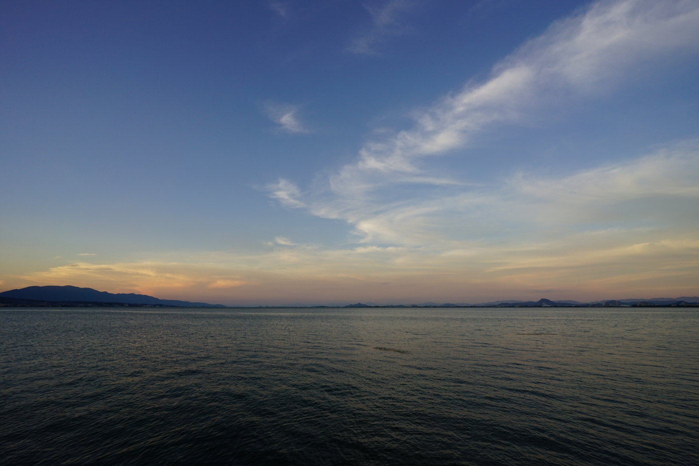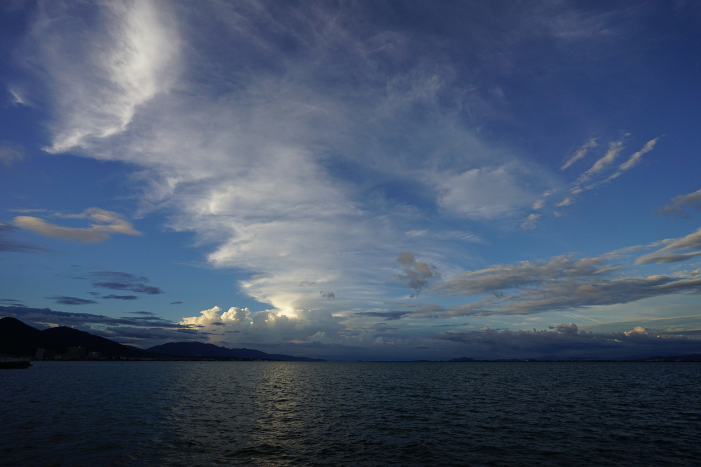 琵琶湖が広がる大津市の湖岸は雲を楽しむには格別の場所だ。今日は三回も空の美術館を楽しんだ。雲に興味を持っているか、いないかでは楽しみ方が違ってくると、今読んでいる「雲を愛する技術」(荒木健太郎著)は雲を勉強するには良い本だと思った。そして何時もパソコンの傍に置いて参考にするのは「空の名前」(橋健司著)は写真も大きく、季節ごとに雲の美しい風景が楽しめる本だ。でも僕の撮る雲の写真を本の写真と比べても同じ写真は無いから・・・雲の世界は無限だと・・・同じ風景は二度と見られないから大切に、大切に心のカメラで確り記憶しておこうと思った。午前中は積雲が元気よく低いところで遊んでいた。午後は巻雲や高積雲らが高空で活躍していた。夕景は台風が近海にあるとダイナミックな雲の活動を期待して出かけたが静かな黄昏となった。