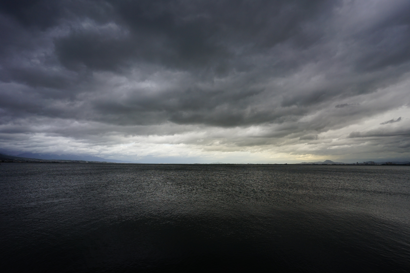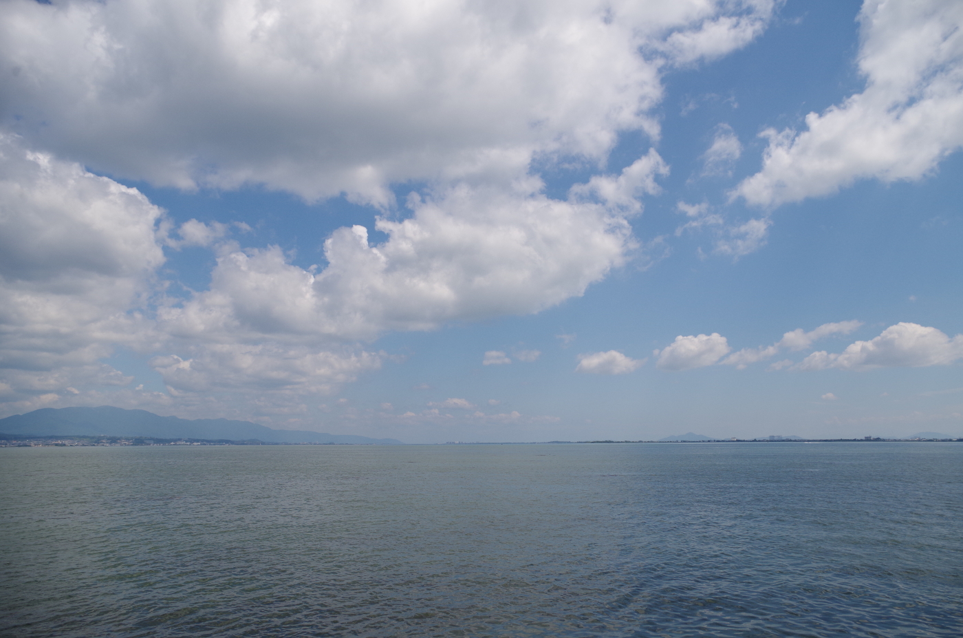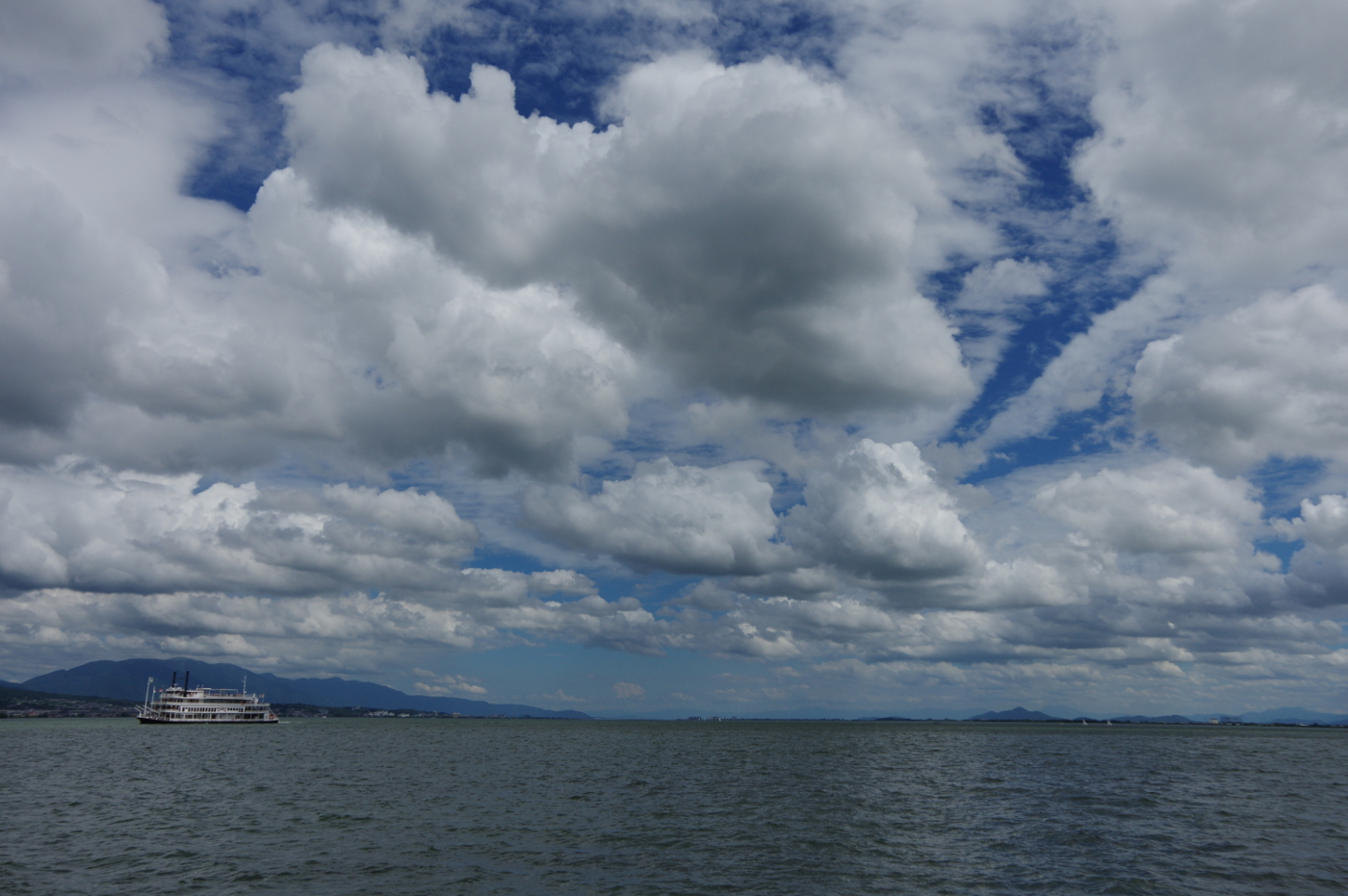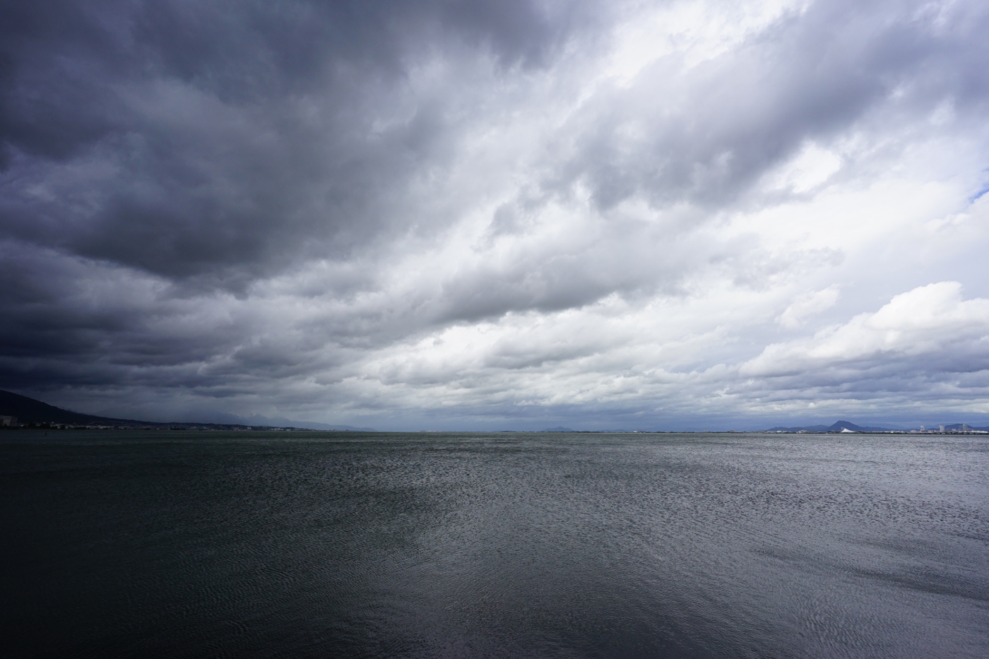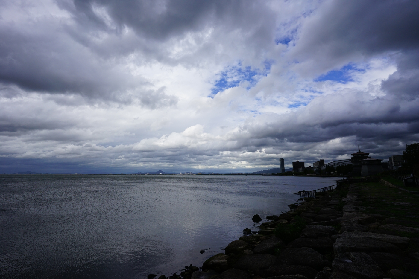 心配した台風9号は温帯低気圧へと変化した。琵琶湖に雨を期待したが少し降らせて通過したようだ。低気圧の所為で体調が少し不調だ。季節の変化は早く昨日、三井寺でヒグラシの声を聞いた。秋は確実に近づいていると思えば感じる暑さも和らいだ。湖岸ポタリングは雨の止んだ3時半ごろ湖岸へ着くと風が強く自転車を留めて和らぐのを待った。湖面に打ち付ける強い風は、大きな波を起こすのではと思っていたら、さざ波を立てながら北へ走った。時々、吹き付ける強風は湖岸に立つ僕を揺るがす時もあり注意しながら写真を撮った。夕食後、台風一過の雲が見たく湖岸へ向った。風は少し緩くなったが時折、強風もあるが、体を運ばれる程の力はなかった。久しぶりの暗く鎮まった風景は今の社会に合っているとデジカメのシャッターを押した。