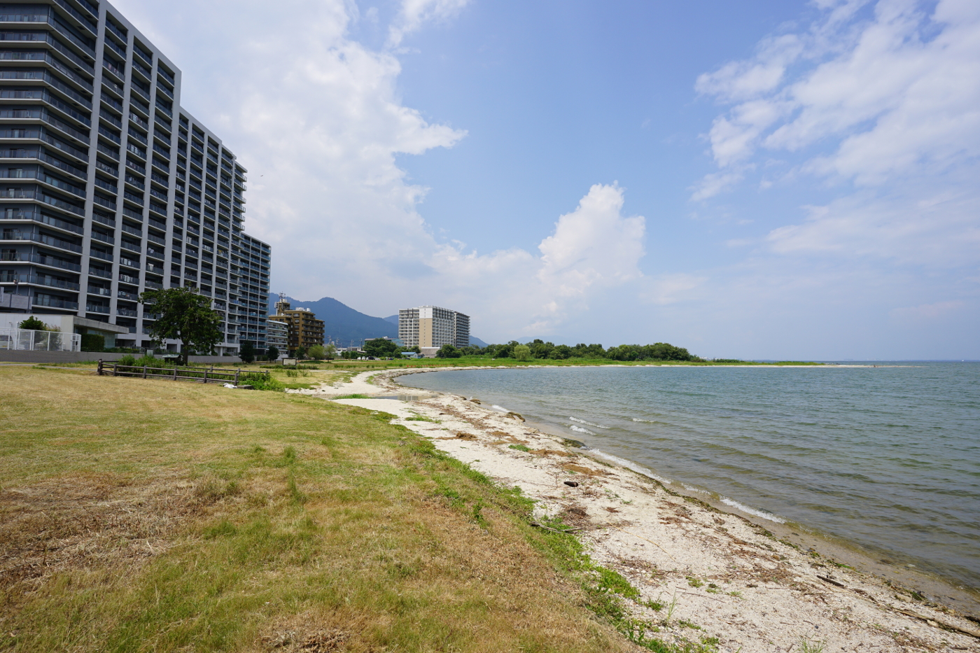 今日の午後、自転車で柳が崎水泳場跡(柳が崎公園)へ出かけた。僕の少年時代は学校にプールが無かった、学校の水泳は長等小学校から30分ほど徒歩で向った事を自転車のペダルを漕ぎながら思い出してきた。当時は尾花川の田園地帯の中を整列して向った柳が崎水泳場は1993年に湖水の汚染が問題になり閉鎖された。そして2010年頃に整備され柳が崎公園と名称が変わった。もちろん水泳場は再開されなかった。水泳場の西側には高層マンションが建ち昔あった水泳場の客を相手にする小屋などは跡形もなく消え、大きな柳の木が一本、昔、此処が水泳場であった証を感じさせてくれるぐらいだ。水辺に近づくと打ち上げられた水草が多く見られるが綺麗な砂浜が今も残っていて、水泳場が開けるのではと思った。でも後方のマンション群が無理だよと言っているように感じた。大津市の行政は湖岸の風景の大切さを認識せずに開発業者に許可を与え続けた結果、衝立の様な高層集合住宅が湖岸に立ち並ぶ姿は琵琶湖の景観を台無しにしていることは事実だ。
