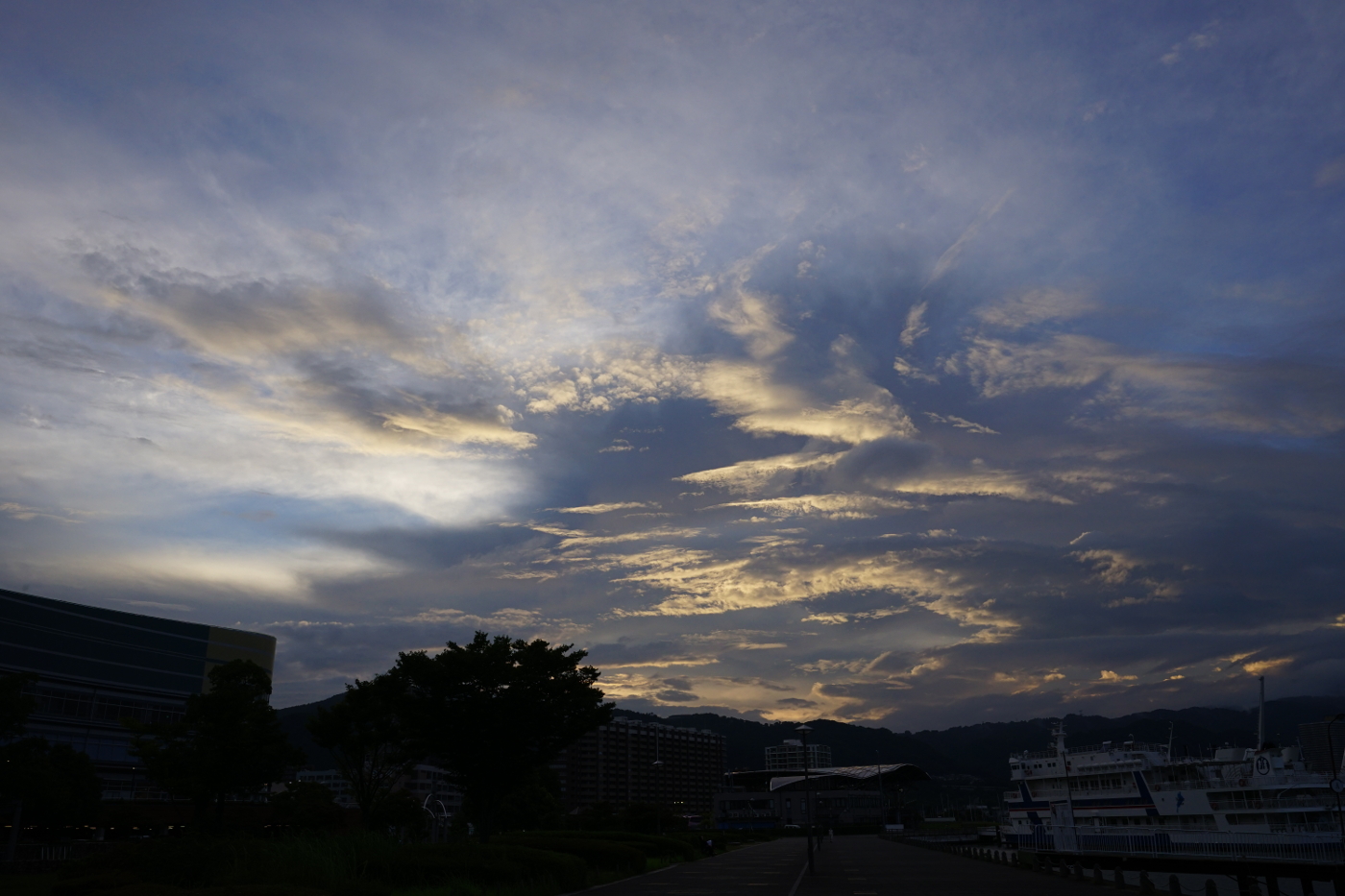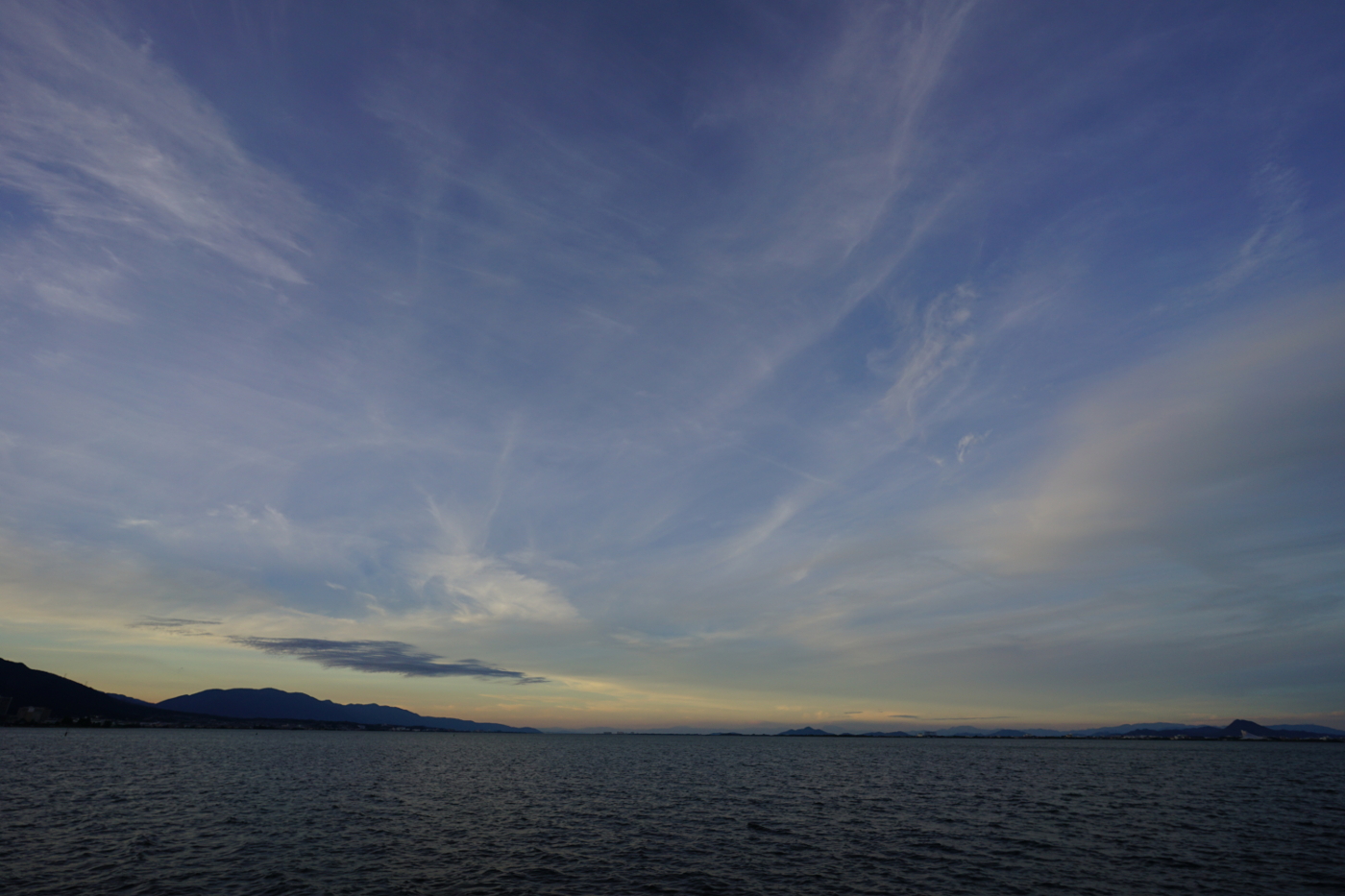 テレビはオリンピック一色ではと夕食後、三度目の湖岸ポタリングに出かけた。家の窓から空を見た時は今日の夕景の写真は期待できないと・・浜大津港に来ると空の美術館には素晴らしい雲の作品が展示された。巻雲・巻積雲・高積雲・高層雲・積雲と雲のオンパレードではないかとデジイチで納得するまで撮った。そしてモニターで確認すると、画面に影が映っていた。良く見るとフードの影だと直ぐに分かり撮り直すも雲の動きが早く少し違ったイメージになった。メガネを掛けたままではファインダーの角まで見られないからと初期的な失敗を少し反省して、肉眼で美しい雲の姿を楽しんだ。