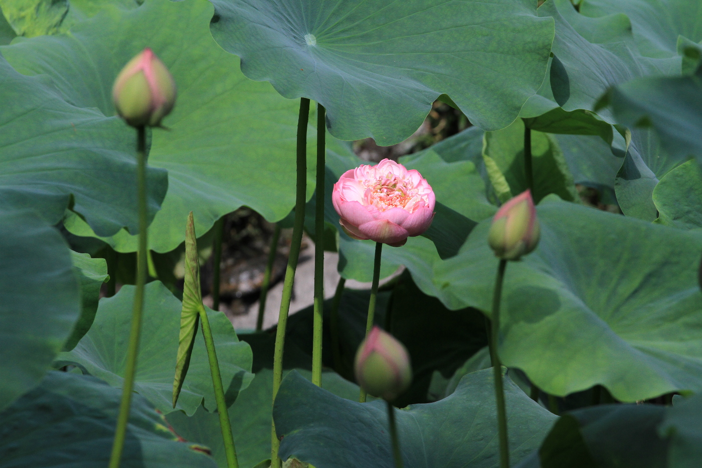 三井寺の蓮池では開花が進んでいるが花が例年より元気がないように思った。