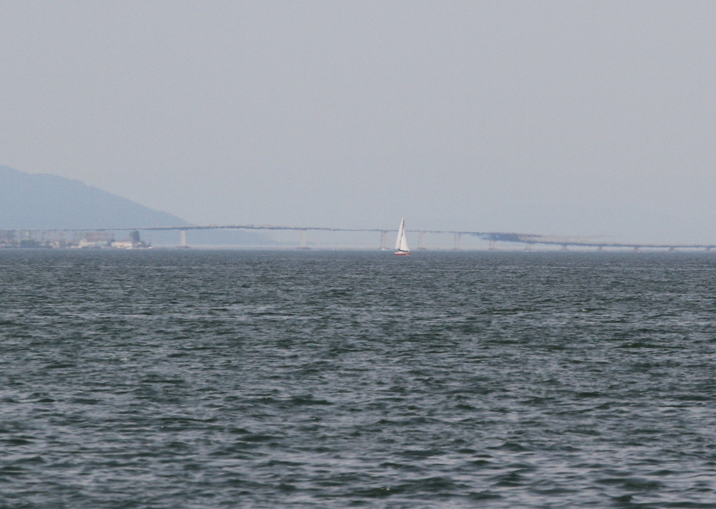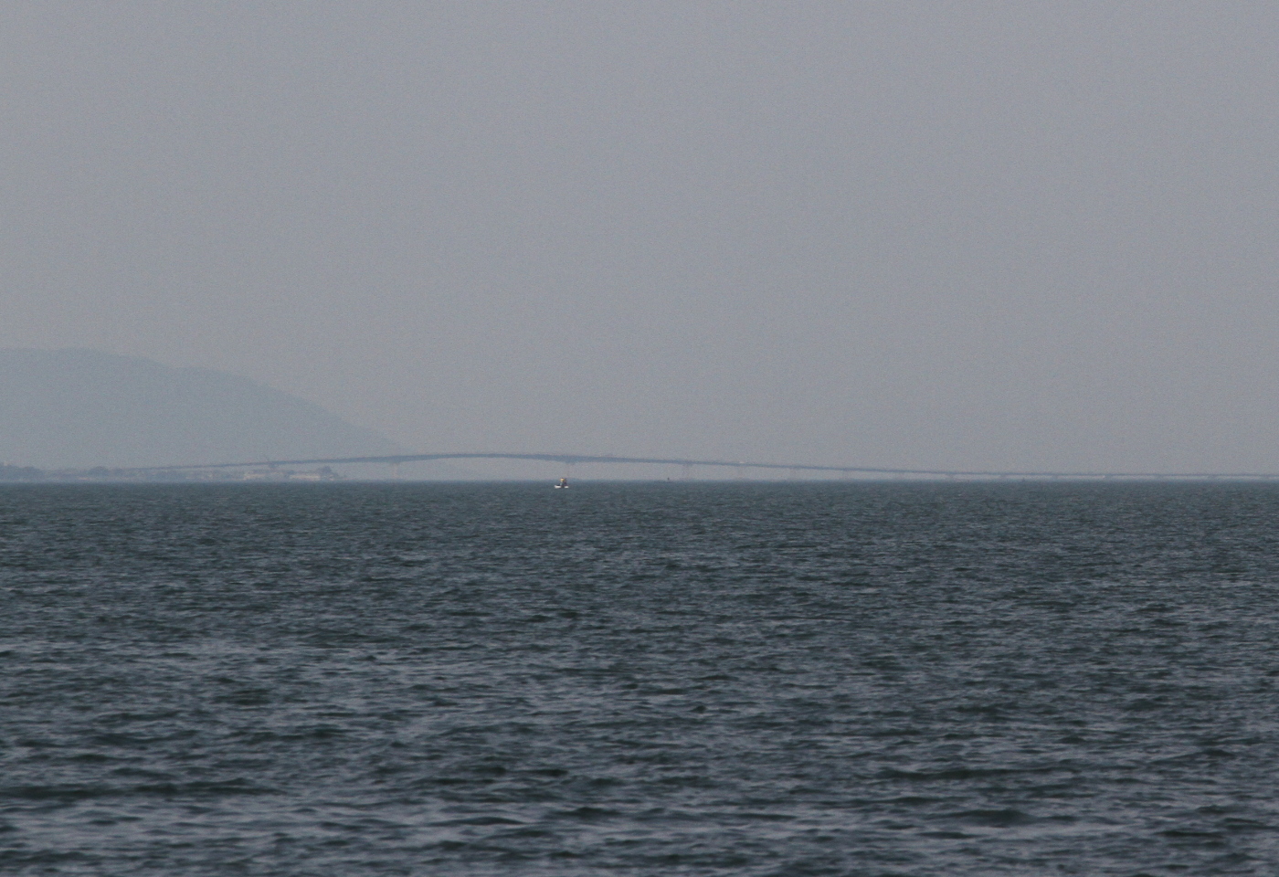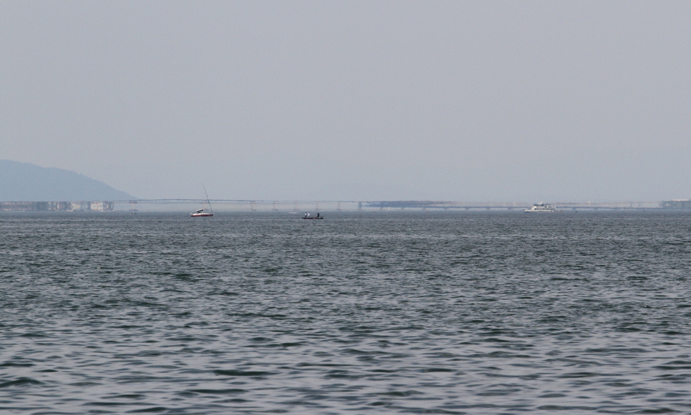 琵琶湖に出る蜃気楼には上位蜃気楼と下位蜃気楼があり、比較的に見ることが多いのは下位蜃気楼で浜大津湖岸から冬場等はよく見られ、目の良い人なら琵琶湖大橋が凸レンズ型に変化した姿を、見る事ができるポピュラな蜃気楼だ。僕は視力は今でも1・5あるから湖岸から琵琶湖大橋がはっきりと見える、今日も湖岸ポタリングで湖岸を走りながら琵琶湖大橋を見ると随分と橋桁が浮き上げって見えるので自転車を止め良く見ると上位蜃気楼の気配を感じた。近くの湖岸を見ると蜃気楼研究会のメンバー?らしき人が三脚にカメラを付けて琵琶湖を眺めていた。僕はワイドレンズで遠くの撮影は不向きと諦めて湖岸ポタリングを楽しんだ。昼食後、蜃気楼が気になり、望遠ズームを付けたデジイチを自転車に積んで出かけた。蜃気楼は気温差がないと出ない、水温と地上の温度の絶妙のバラスが必要だ。上位蜃気楼は5月頃が一番多く見られると蜃気楼研究者のBさんが教えてくれた。浜大津湖岸に自転車を止め、琵琶湖大橋を見ると高い部分と守山側の橋の部分が同じくらいの高さに見えた。デジカメのファインダーで眺めると橋がZ型に少し湾曲している、正しく上位蜃気楼だと何枚もシャッターを押した。蜃気楼の写真は下位蜃気楼は写真にしやすいので良く撮るが上位蜃気楼は出会うチャンスも少なく出ていてもモヤっとしている時が多く、そして望遠レンズを持ち出す煩わしさもあり一二度撮ったくらいで、写真もイマイチだった。今日は久しぶりに蜃気楼の時を楽しんだ。そして機材を提供してくれた福島の友人Hさんに感謝した。