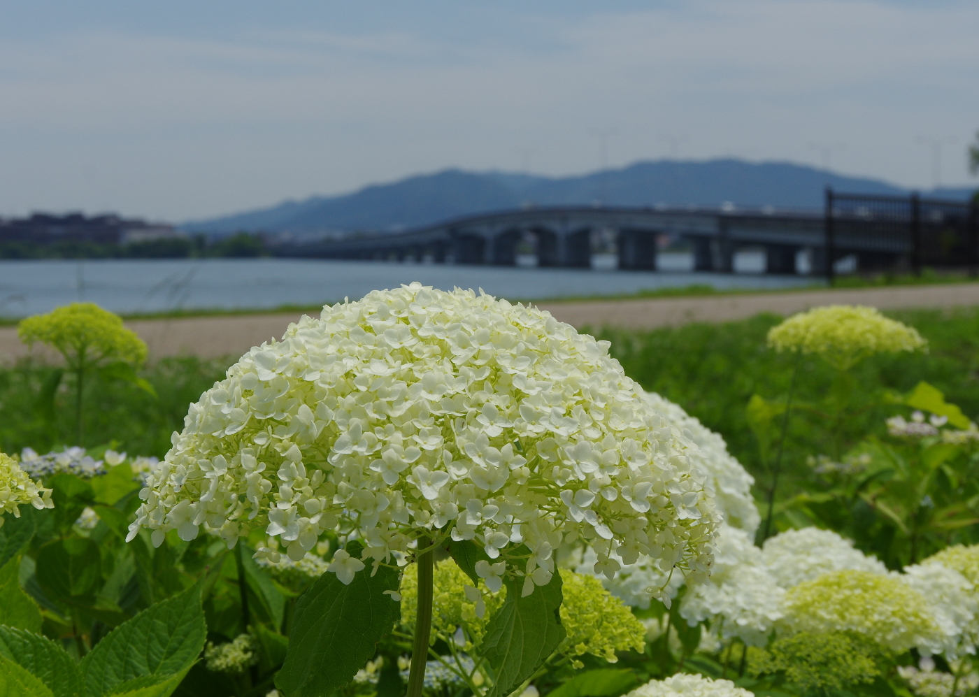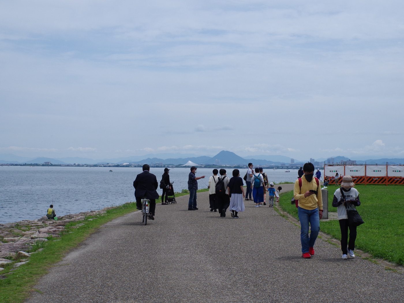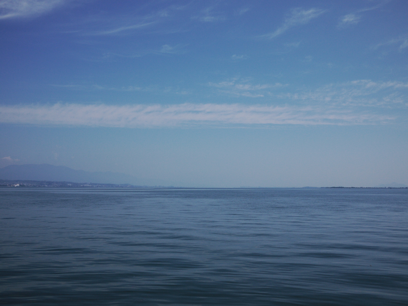琵琶湖に出る蜃気楼には上位蜃気楼と下位蜃気楼があり、比較的に見ることが多いのは下位蜃気楼で浜大津湖岸から冬場等はよく見られ、目の良い人なら琵琶湖大橋が凸レンズ型に変化した姿を、見る事ができるポピュラな蜃気楼だ。僕は視力は今でも1・5あるから湖岸から琵琶湖大橋がはっきりと見える、今日も湖岸ポタリングで湖岸を走りながら琵琶湖大橋を見ると随分と橋桁が浮き上げって見えるので自転車を止め良く見ると上位蜃気楼の気配を感じた。近くの湖岸を見ると蜃気楼研究会のメンバー?らしき人が三脚にカメラを付けて琵琶湖を眺めていた。僕はワイドレンズで遠くの撮影は不向きと諦めて湖岸ポタリングを楽しんだ。昼食後、蜃気楼が気になり、望遠ズームを付けたデジイチを自転車に積んで出かけた。蜃気楼は気温差がないと出ない、水温と地上の温度の絶妙のバラスが必要だ。上位蜃気楼は5月頃が一番多く見られると蜃気楼研究者のBさんが教えてくれた。浜大津湖岸に自転車を止め、琵琶湖大橋を見ると高い部分と守山側の橋の部分が同じくらいの高さに見えた。デジカメのファインダーで眺めると橋がZ型に少し湾曲している、正しく上位蜃気楼だと何枚もシャッターを押した。蜃気楼の写真は下位蜃気楼は写真にしやすいので良く撮るが上位蜃気楼は出会うチャンスも少なく出ていてもモヤっとしている時が多く、そして望遠レンズを持ち出す煩わしさもあり一二度撮ったくらいで、写真もイマイチだった。今日は久しぶりに蜃気楼の時を楽しんだ。そして機材を提供してくれた福島の友人Hさんに感謝した。