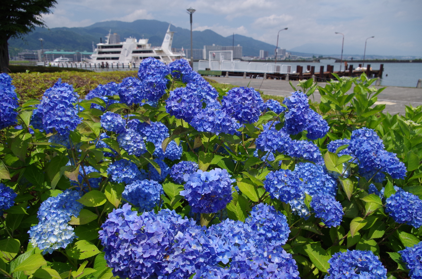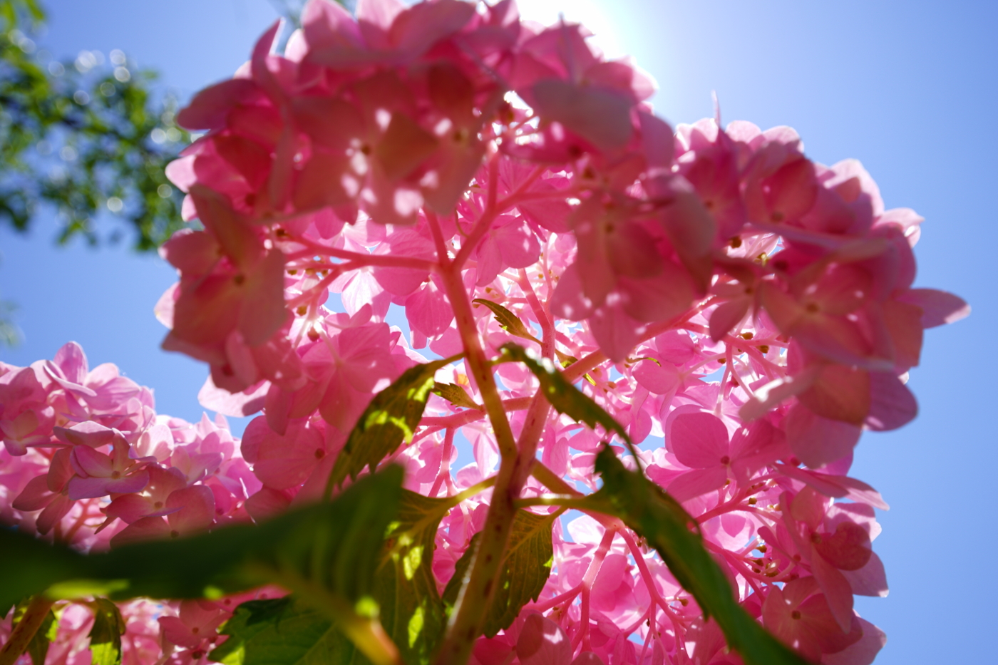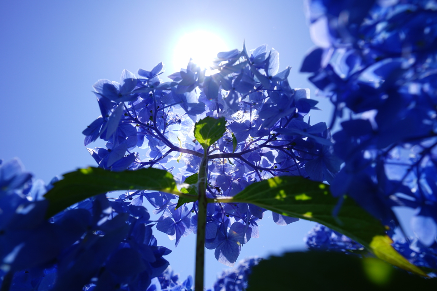 今日も五月晴れとなった。好天に誘われ湖岸ポタリングも膳所由美浜まで走った。期待した紫陽花は未だ咲き始めたばかりで花数も少なかった。由美浜の白い紫陽花は毎年撮っているから赤い紫陽花から撮り始めた。僕は紫陽花の花を撮るときにはローアングルに決めている、デジカメにはバリアアングルファイダーが付いているからお手の物だ。ファイダーを見ていると虫の目線になり楽しい世界が開けた。紫陽花を見上げると、まるで紫陽花が大きな木の様に見えた。地上の虫たちは何時も此のような感じで紫陽花の森の中を彷徨っているのかと虫になった気分でシャッターを切った。そして太陽の透過光で見る其々の紫陽花の花の色に染まった光景はファンタージー映画を見ているようで楽しかった。或る人が僕の写真を例えて鳥目線の写真だと言ったことを思い出しながら鳥から虫へと変化した目線も素晴らしいと思った。