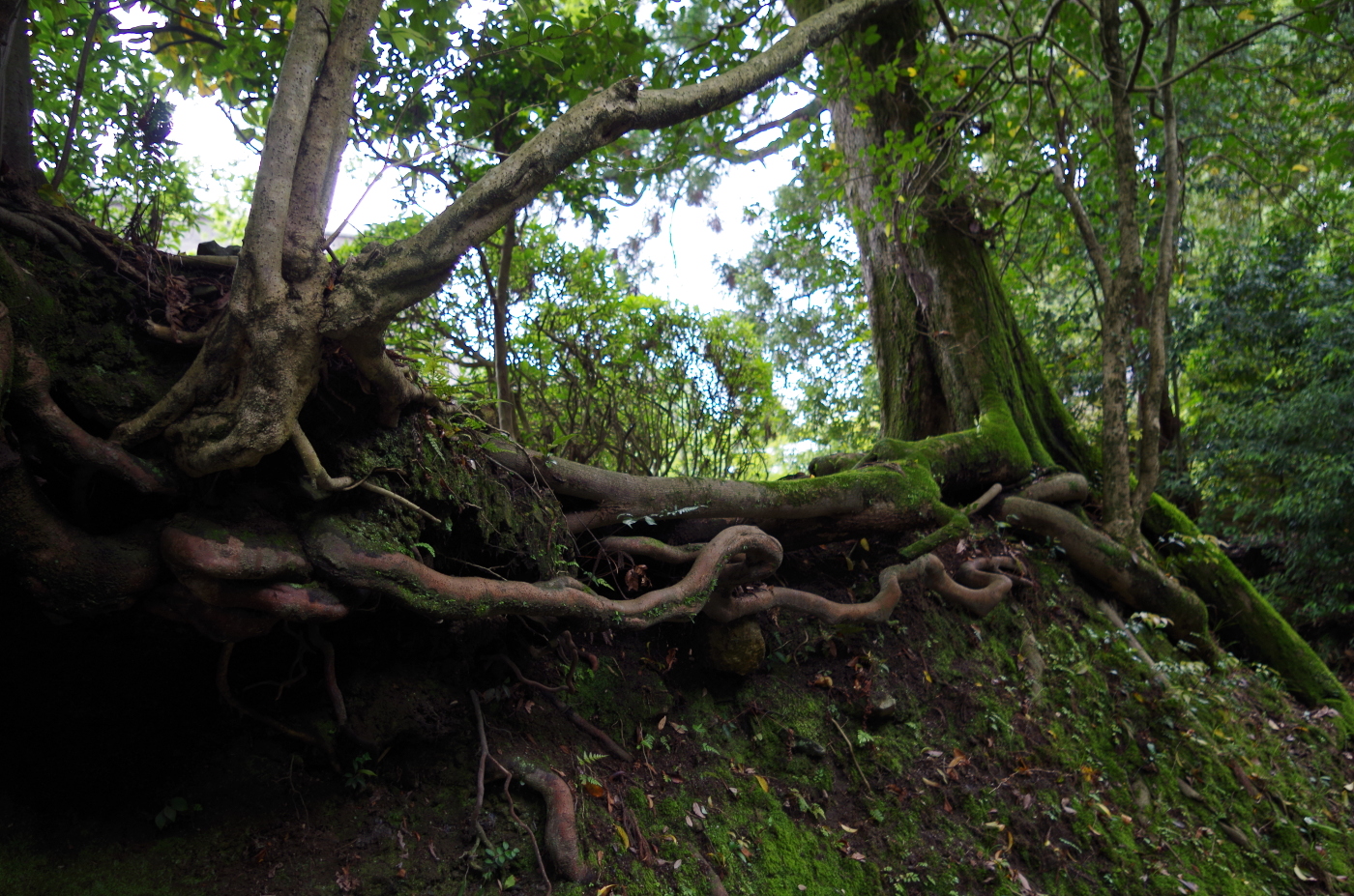 毎日の散歩で歩く三井寺の境内には大木も多くあり、森林浴をしている気分だ。木立の中からは小鳥たちの声が聞こえると、先日、テレビで鳥たちには言葉があり、コミュニュケーションをとりながら暮らしていると知り鳥語辞典があればとおもった。今日は金堂裏から参道に抜けると、斜面に露出している根っこの迫力に、思わず立ち止まった。根っこは隣の木と繋がっているようにも見え、不思議な造形に感心して、直ぐにデジカメで撮った。いつも仰ぎ見るばかりで地中の根には気が行かなかったと、反省しながら木の根の美さに見とれた。帰宅後、パソコンのお世話になると、大きな大木でも地中、三メートルぐらいだと知り驚いた。意外と根の浅いこと知った。そして台風らの強風で神社の大木が倒れている光景を思い出した。枝を張り、何十メートルと高さがある木が簡単に根ごと倒れている姿を思い出した。根っこは水や養分を吸い上げる一番、木にとっては大切な部分だとおもうと、これから先は地面を歩く時も注意をしなければと、また目を根に向けた。