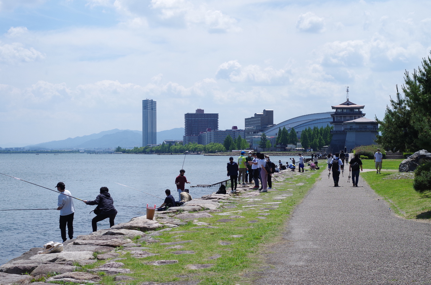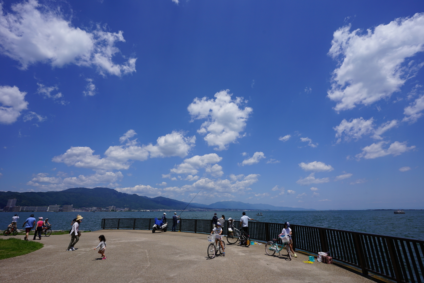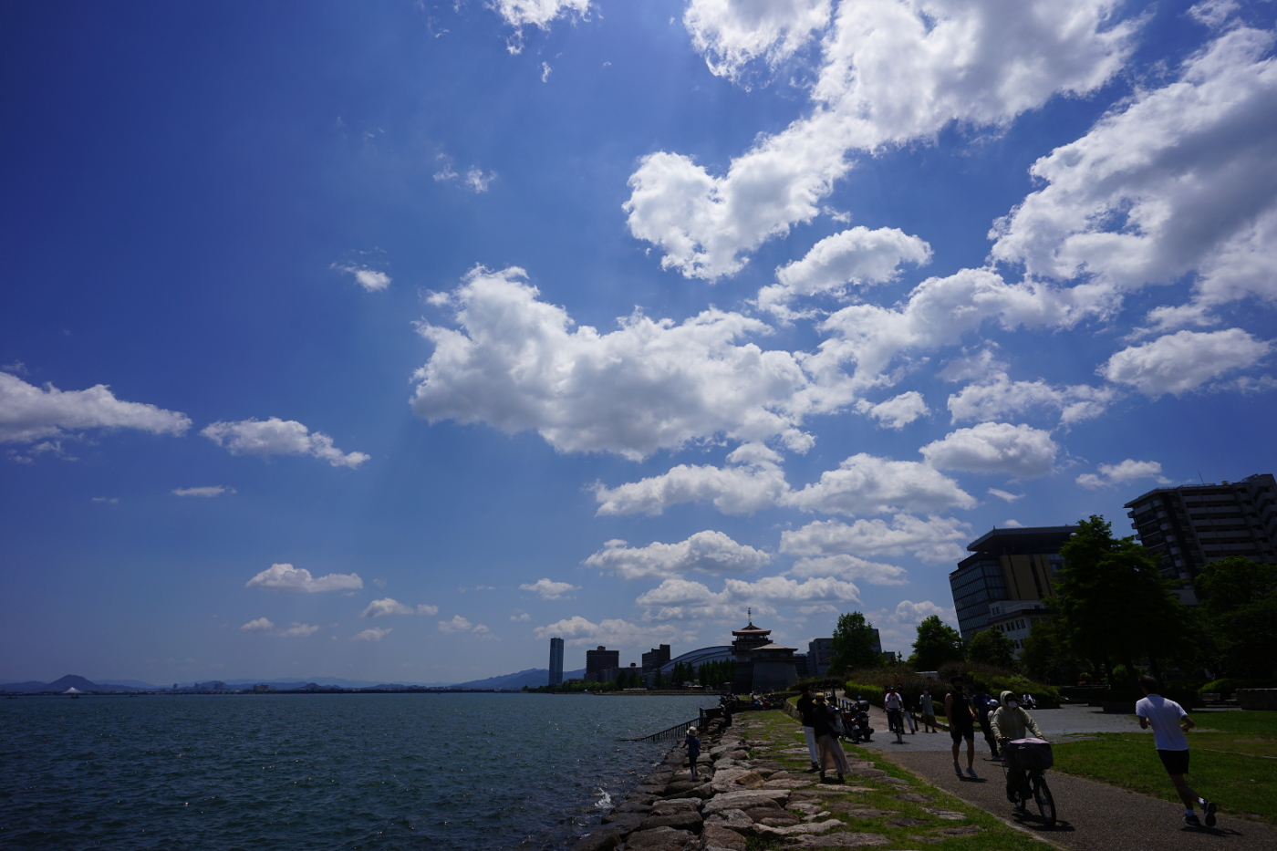 梅雨に入って二回目の五月晴れとなった。湖畔はコロナ禍にも関わらず多くの人達が好天の休日を楽しんでいた。打出浜から見る琵琶湖は赤潮の心配もなく青い水を輝かせていた。上空には積雲が思い思いに青空に描く作品を見ていると、飛行機に乗りたくなった。そして僕は過去の時間を脳内でたどると1989年5月30日の琵琶湖上空一万フィート(三千メートル)のセスナから琵琶湖全景を撮っている情景が浮かんだ。撮影窓から琵琶湖を見ると積雲が下に確認された。約千メートル下方を浮遊しながら地上に影を落としている、雲の影は航空写真には邪魔だ。暫く旋回しながら待機すると雲が移動した?そして僕はシャッターを押した。そして脳内から現実へと今日、5月30日も晴天だが積雲が多く琵琶湖の全景を撮影するのには適さないと積雲が遊ぶ空を見上げた。もう飛ぶことはないと積雲が作る見事な造形を眺めると少し切なさを感じた。積雲の高度は低く二千メートル位を漂っていて気象は安定している証拠だ。青空に雲があるだけで気分は幸せだ。今日の湖岸は何処を撮っても絵になるとデジカメのシャッターを何回も押した。