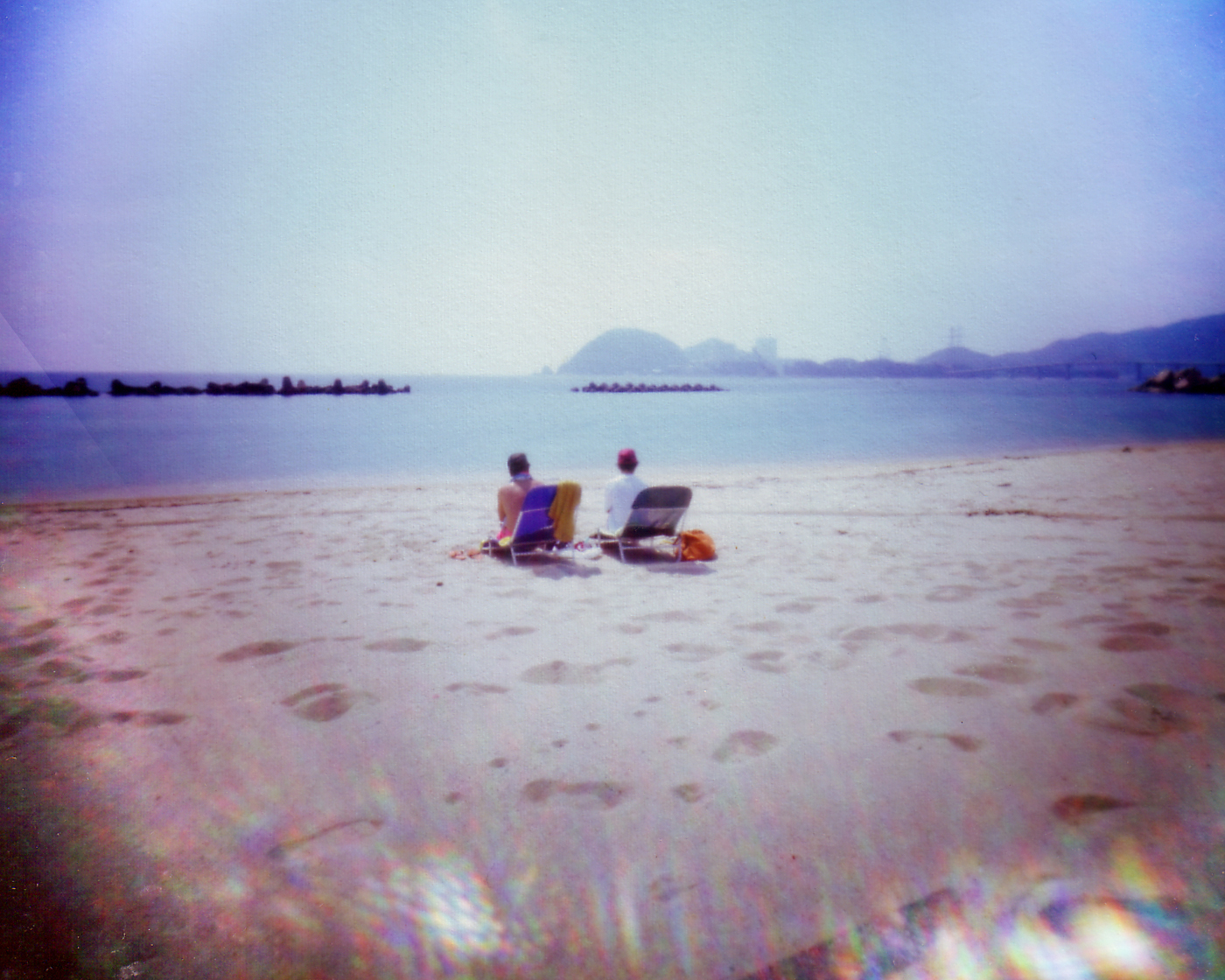 写真三枚目は1998年ごろにピンホールカメラで撮った福井美浜の浜辺から見る原発。1986年のチェルノブイリ原発事故が在った後に仲間らと原発反対のグループをつくった。