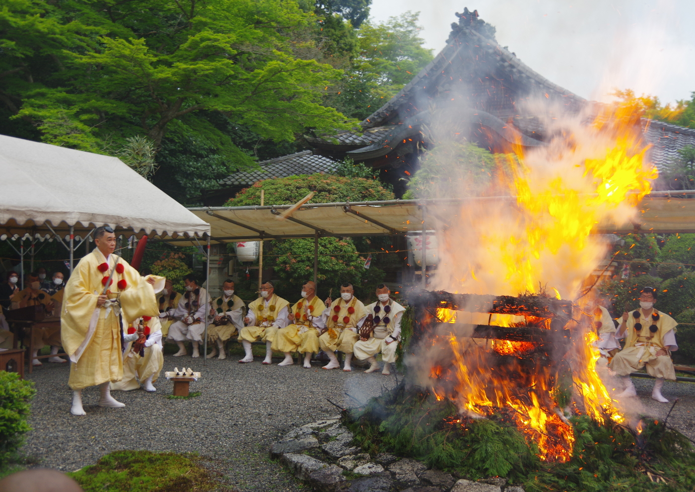 今日、三井寺では採灯護摩供が執り行われた。三井寺の護摩供は最近まで七月に行われていたが近年の温暖化による暑さのために五月に変更されて三年目だ。そして新長吏が導師を努めた。午後はお天気が崩れると予報されていた通りになった。護摩壇に火が付けられ煙が空に向かうと急に雨が降り出しカミナリまでも鳴り出し神秘的な雰囲気が漂う中、護摩が焚かれた。護摩はコロナ終息を願うことも向上に述べられた。此の願いが届くことを祈りながら写真を撮った。行事が終わる頃に雨が止んだ。晴天で行われる護摩よりも、雷と雨が神秘的な護摩にしてくれ今日は良い護摩供だったと雨上がりの空を見た。