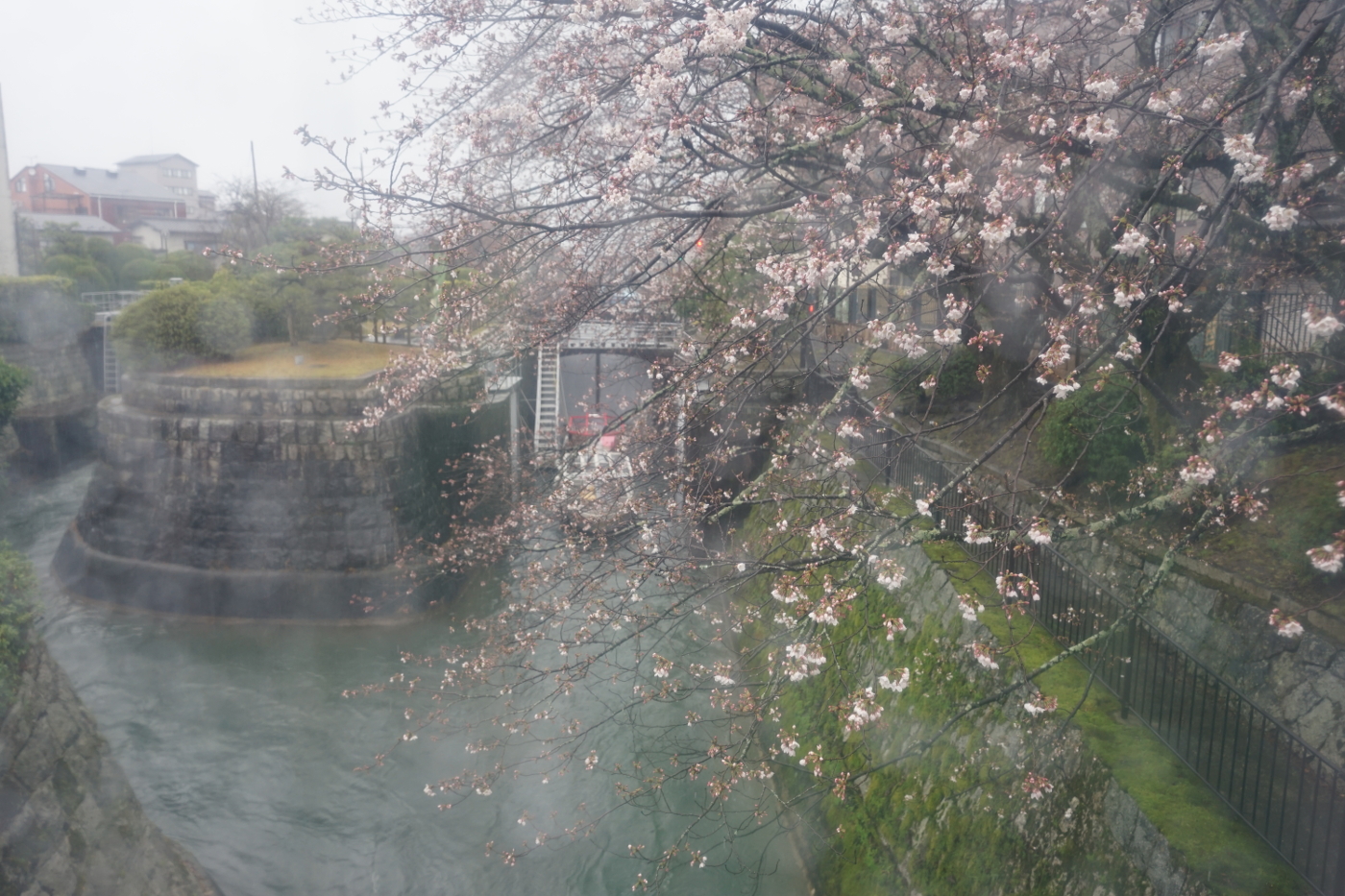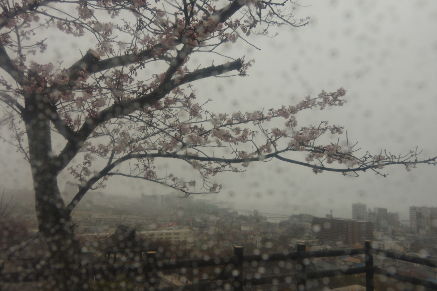 春雨じゃ濡れて行こう・・のセリフは月形半平太が芸者が差し出す番傘を止めて語る、映画のシーンを思い出した。そして大友龍太郎の顔が懐かしく浮かんだ、もちろん東映の全盛時代の映画だ。そんなセリフや時代劇の俳優の名前は、今では知る人も少いのではとビニール傘をさして散歩に出かけた。雨脚が強く濡れて行くどころでない状況だ。疎水に架かる鹿関橋から見る桜も雨にめげずに花を咲かせていた。一晩でこんなに咲くのかと少し驚きながら、温暖化の進んだ事を実感すると少し怖さを憶えた。何時もなら入学式の頃に満開になり、入学児童に花を添える光景が、今年は見られないと桜花を見た。三井寺の観音堂展望台の桜は満開になるのも近いとビニール傘越しに写真を撮った。モニターで確認すると肉眼で見るより春雨の優しさが感じられた。ライトアップが始まる27日には満開になってしまうのでは、楽しむ期間が短くなるのではとおもった。自然界は温度や湿度らの条件で動き、人間の取り決めた季節感や時間など関係ないと時は流れて行く、そんな中で取り残されてしまうのはホモ・サピエンスの社会だけとおもうと寂しくなってきた。また雨が強くなった。水滴の付いたビニール傘越しに見る光景は写真家ソール。ライターの写真を思い起こさせてくれた。